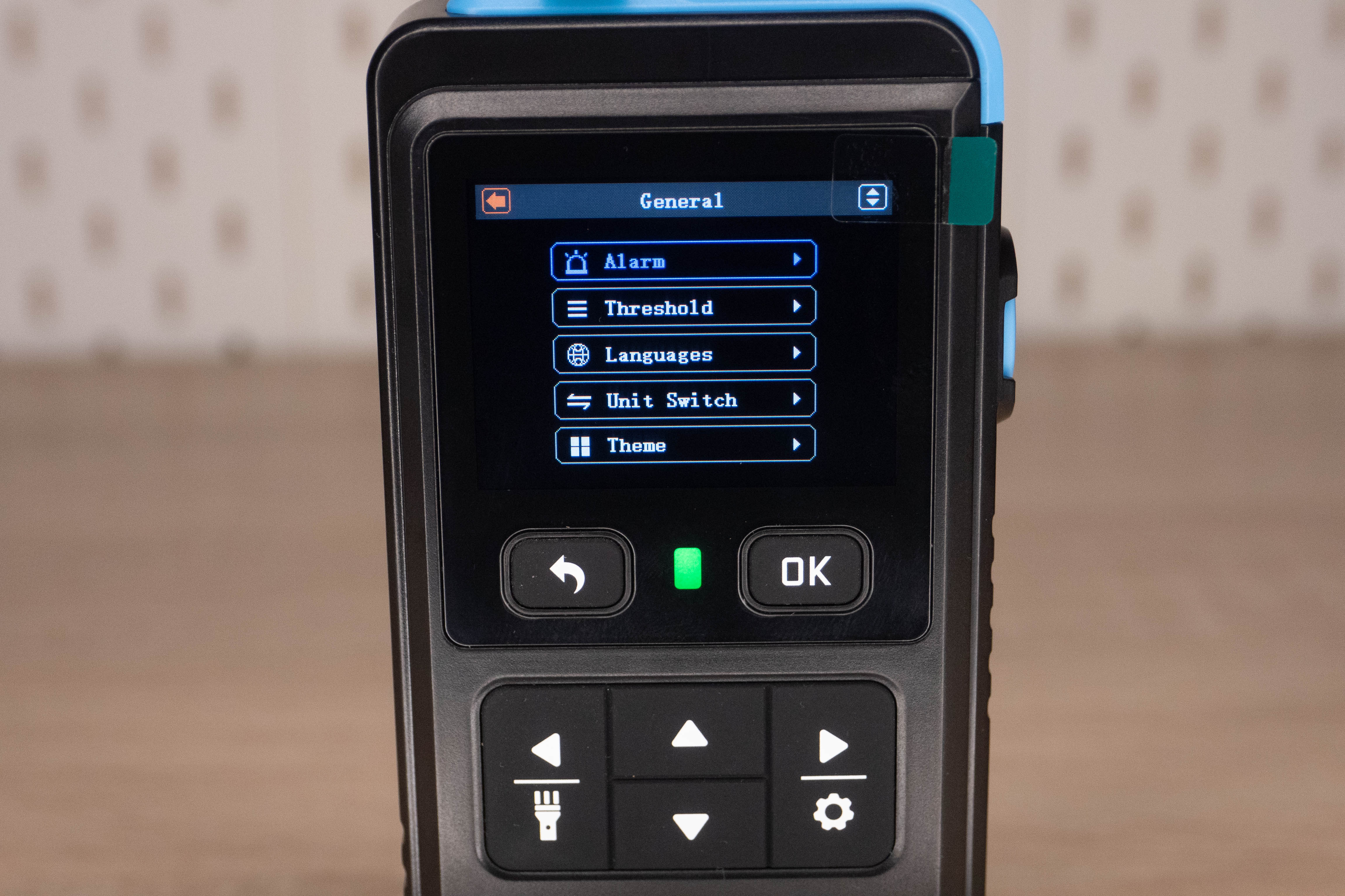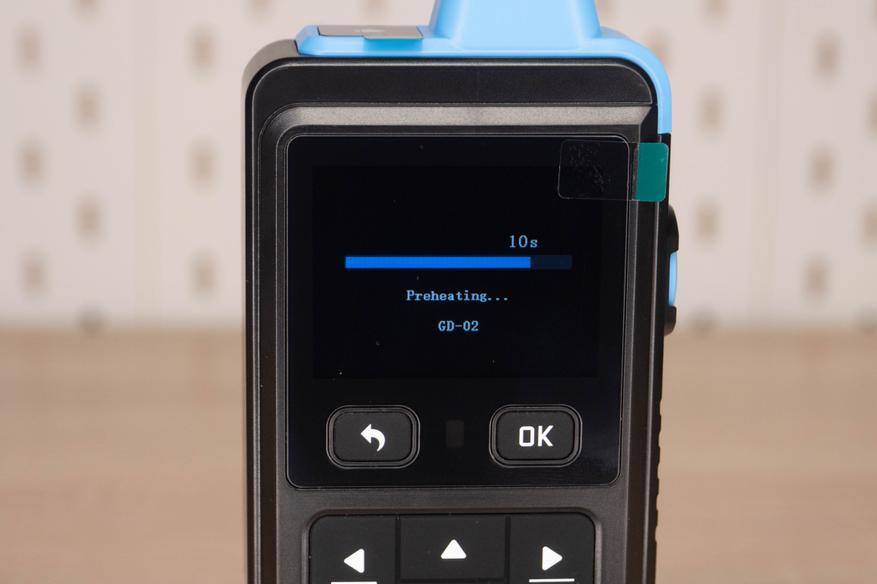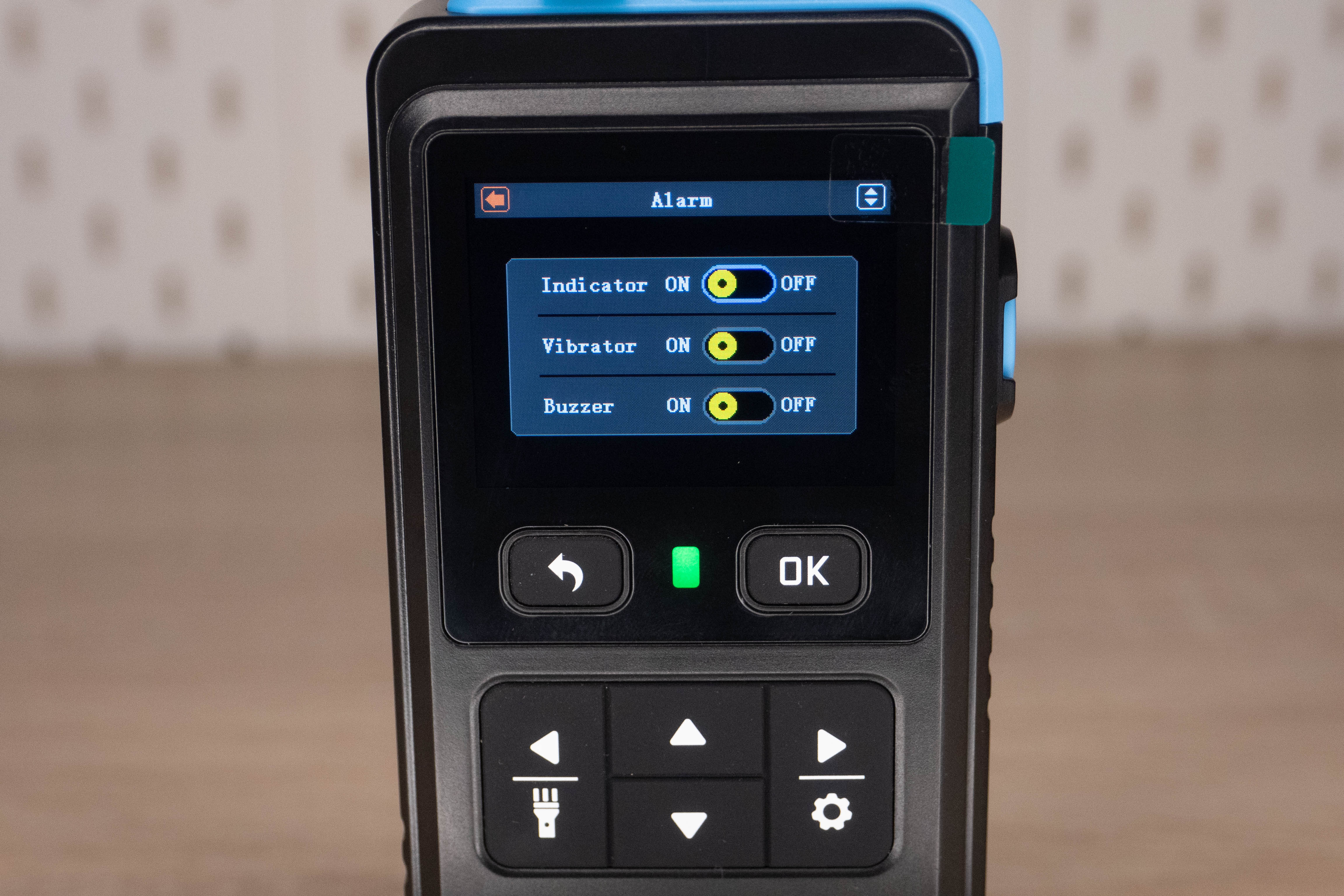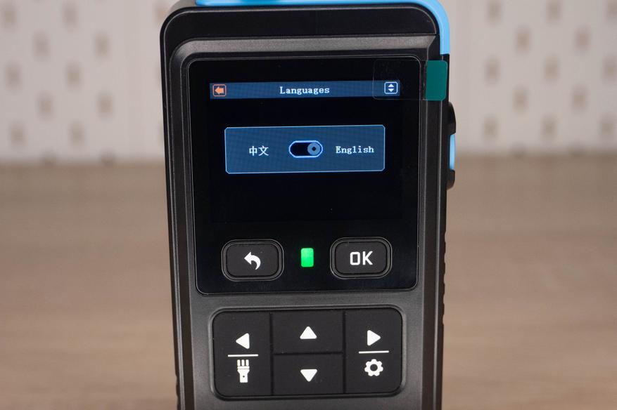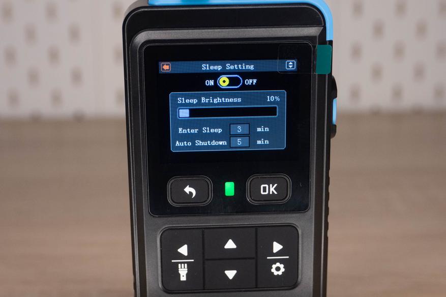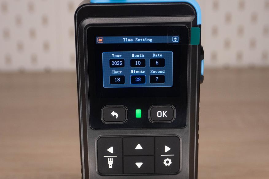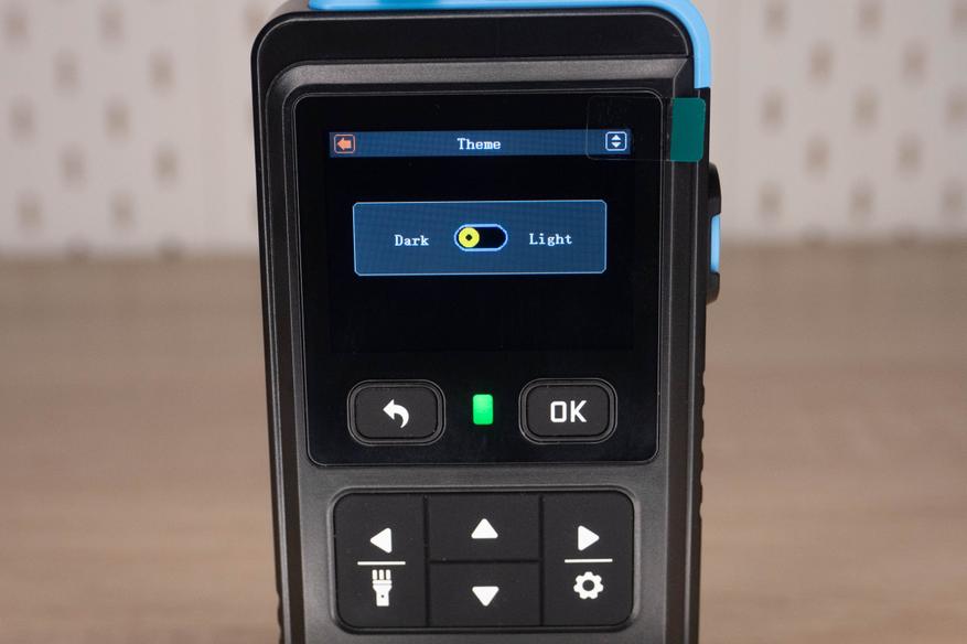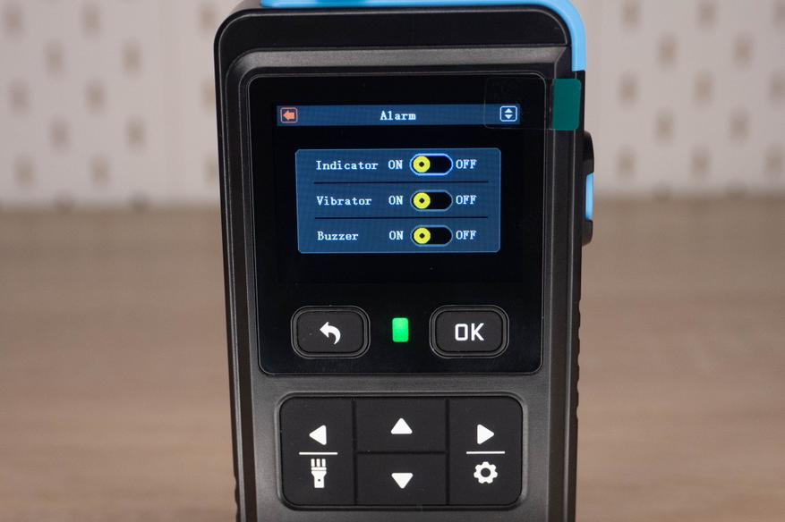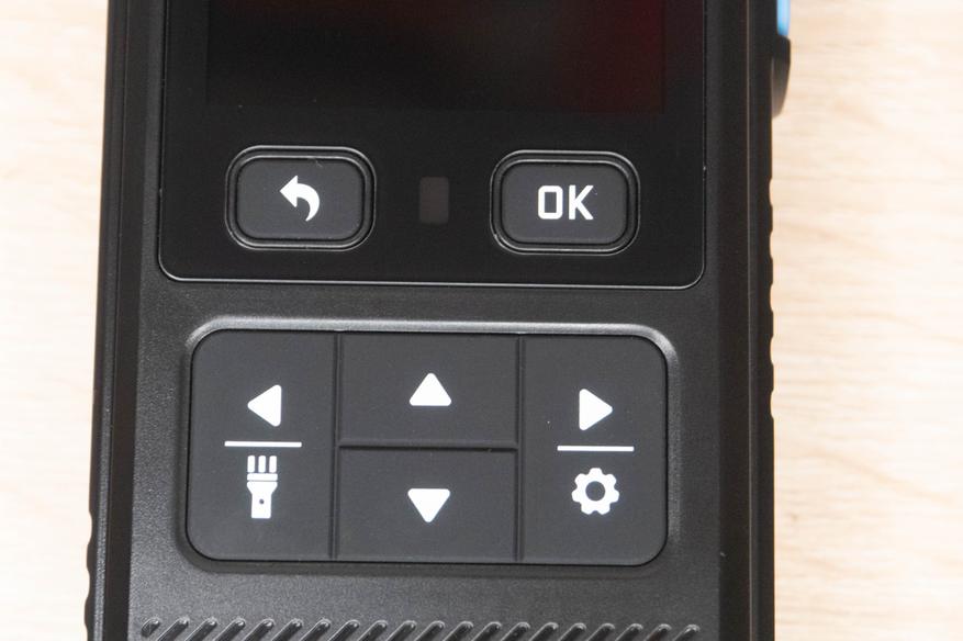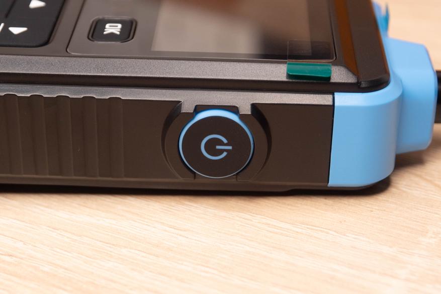 На лицевой стороне инструмента находится цветной дисплей и шесть элементов управления. Кнопка включения/выключения расположена на правой грани и окружена пластиковым кольцом, которое избавляет от случайных нажатий. Сзади наклеен шильдик с краткими характеристиками и окошко датчика температуры + влажности.