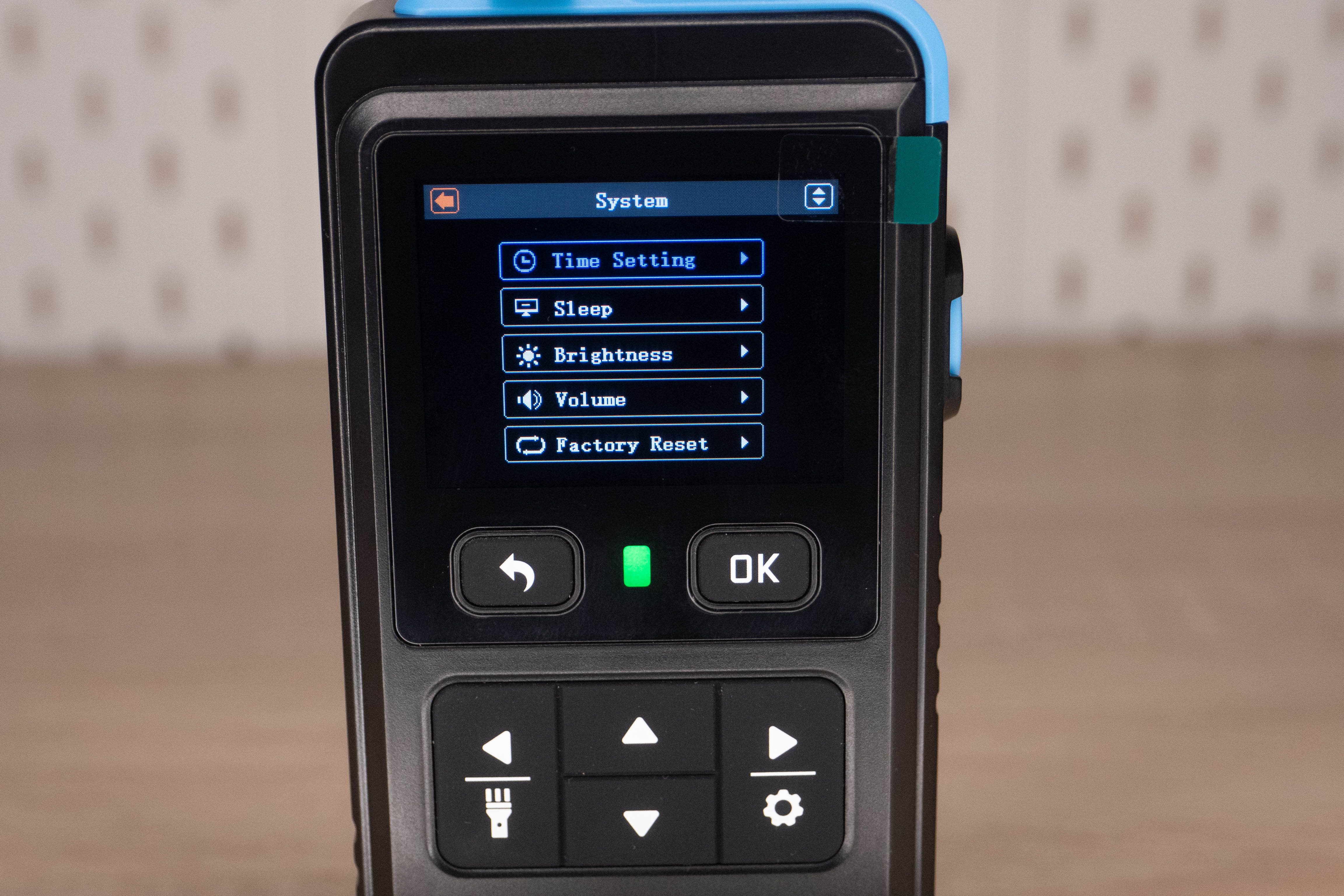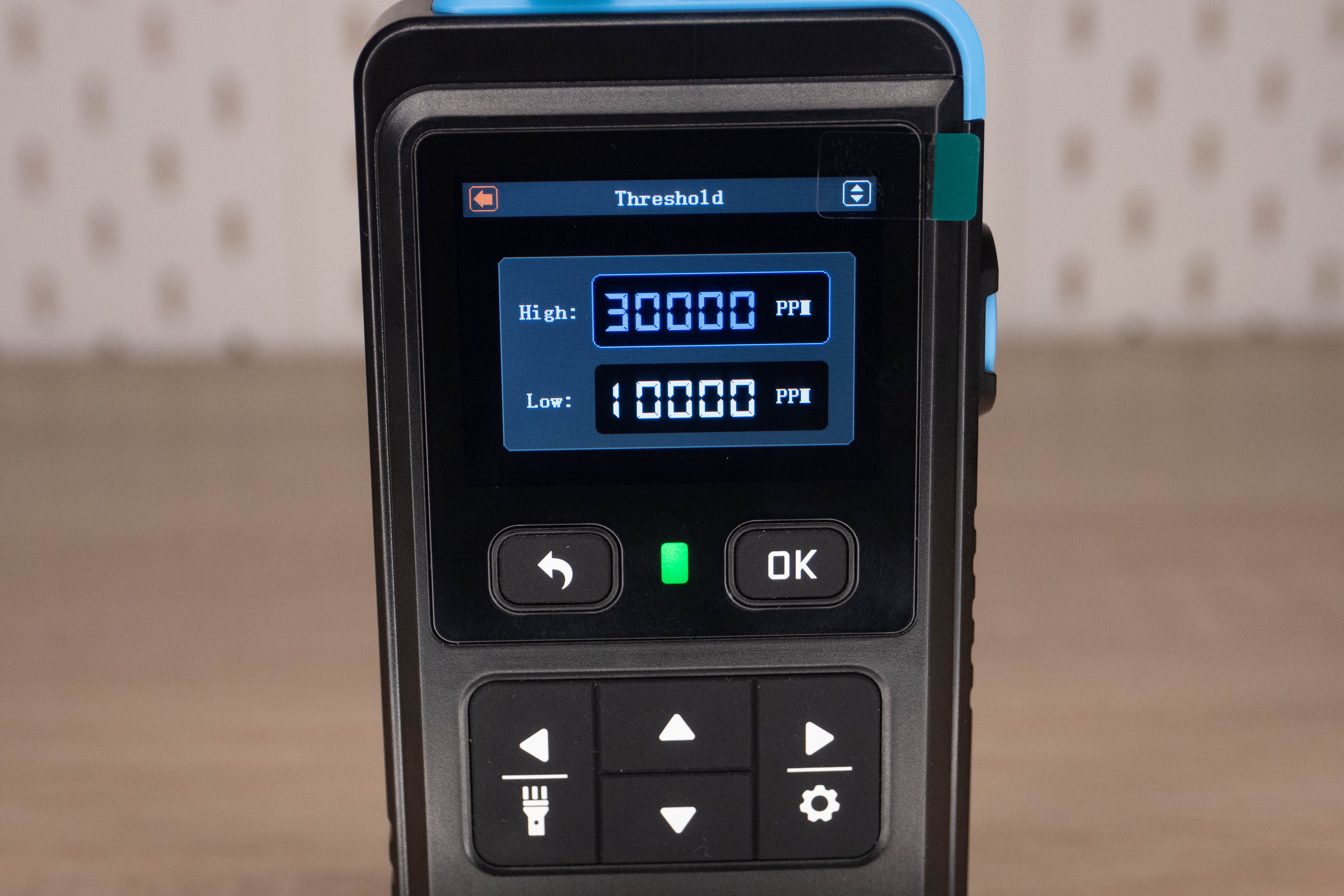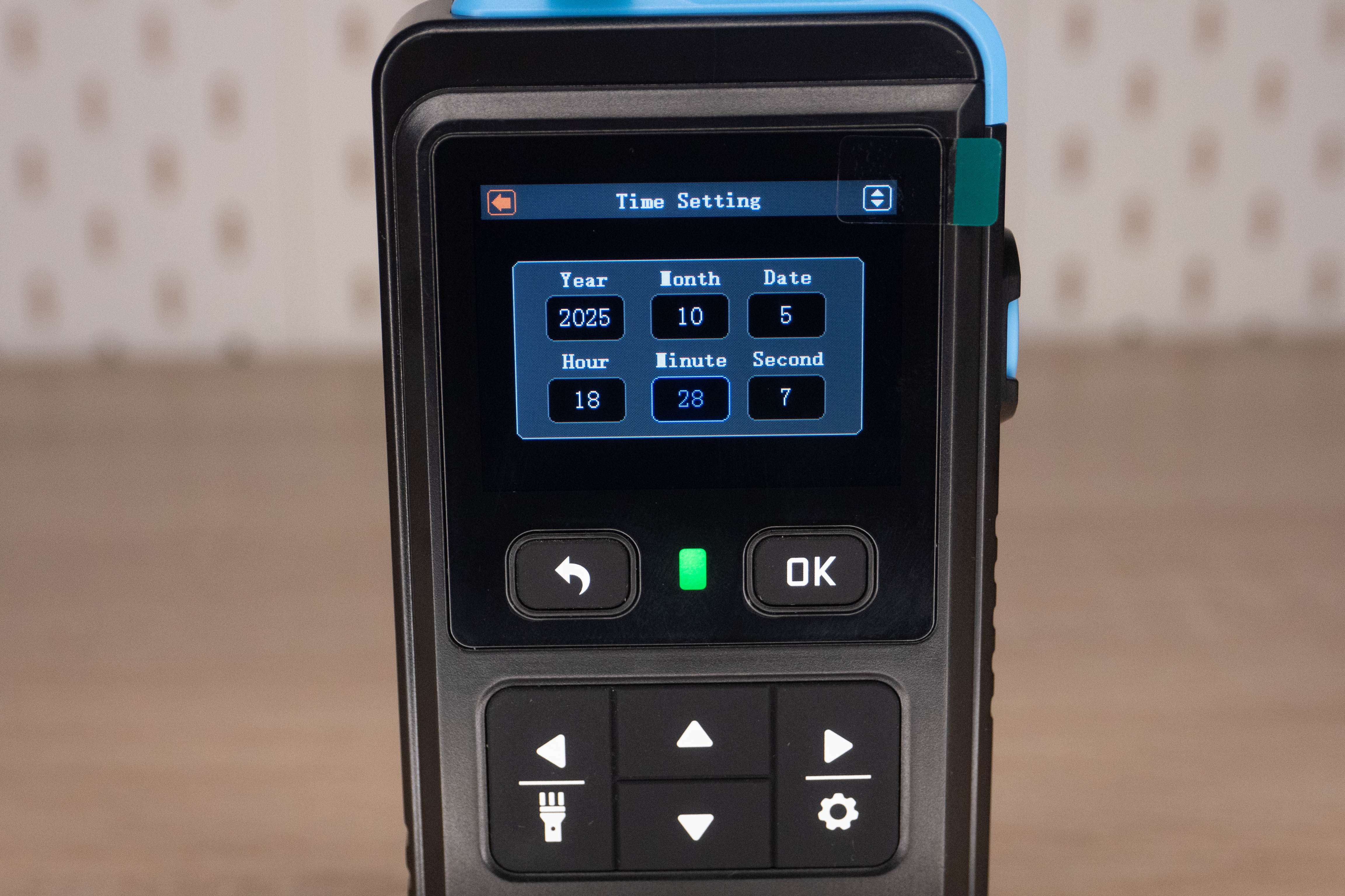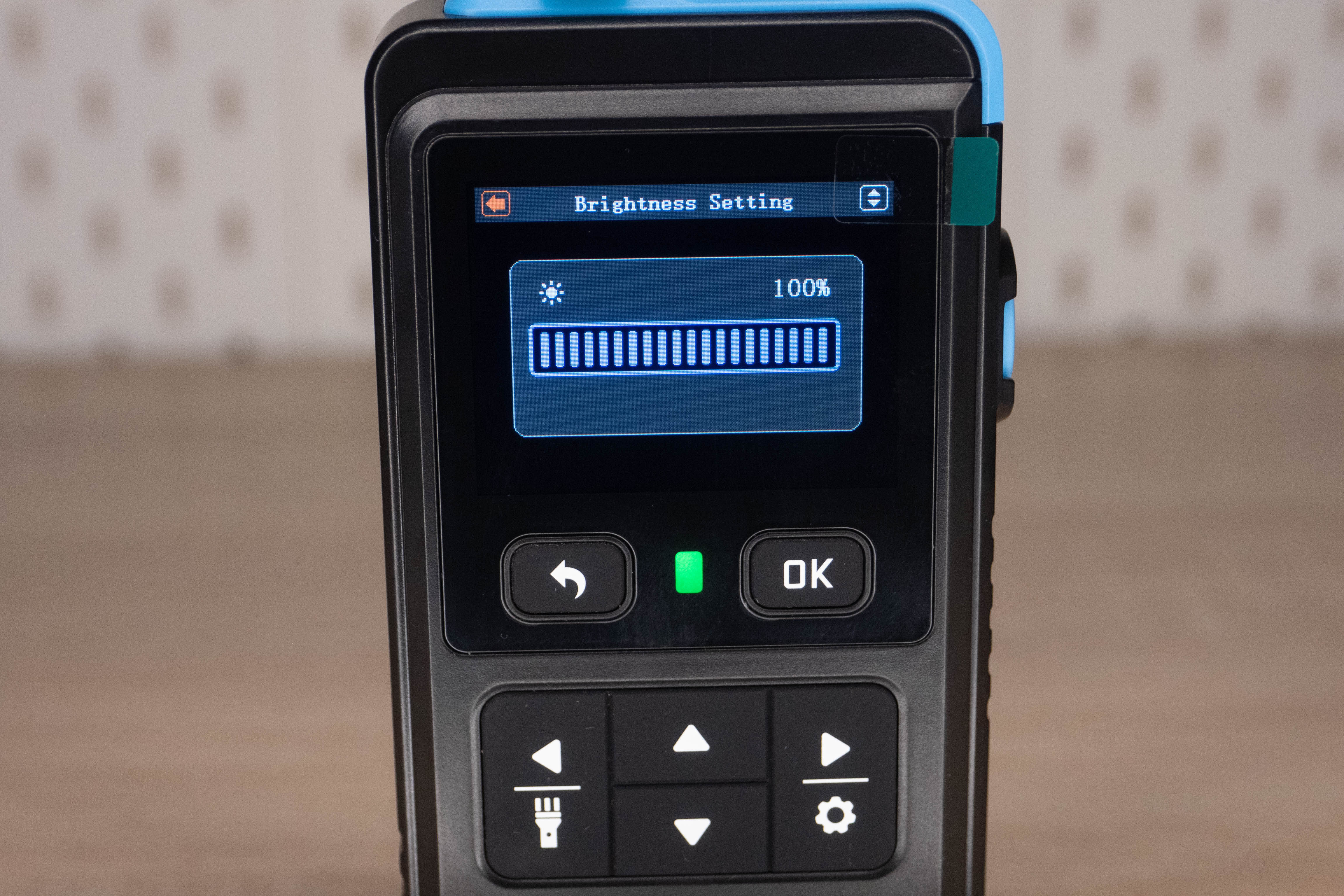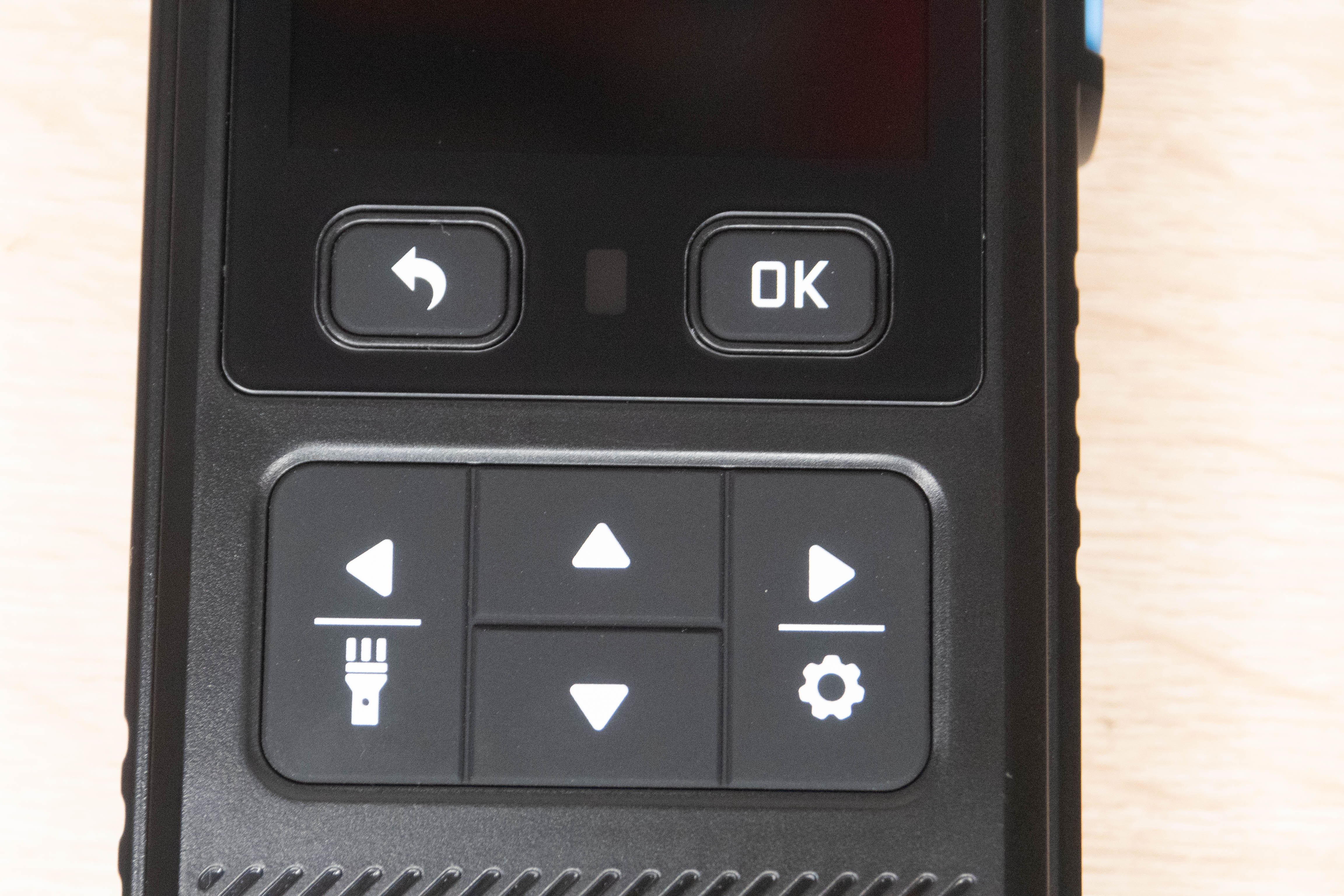На лицевой стороне инструмента находится цветной дисплей и шесть элементов управления. Кнопка включения/выключения расположена на правой грани и окружена пластиковым кольцом, которое избавляет от случайных нажатий. Сзади наклеен шильдик с краткими характеристиками и окошко датчика температуры + влажности.