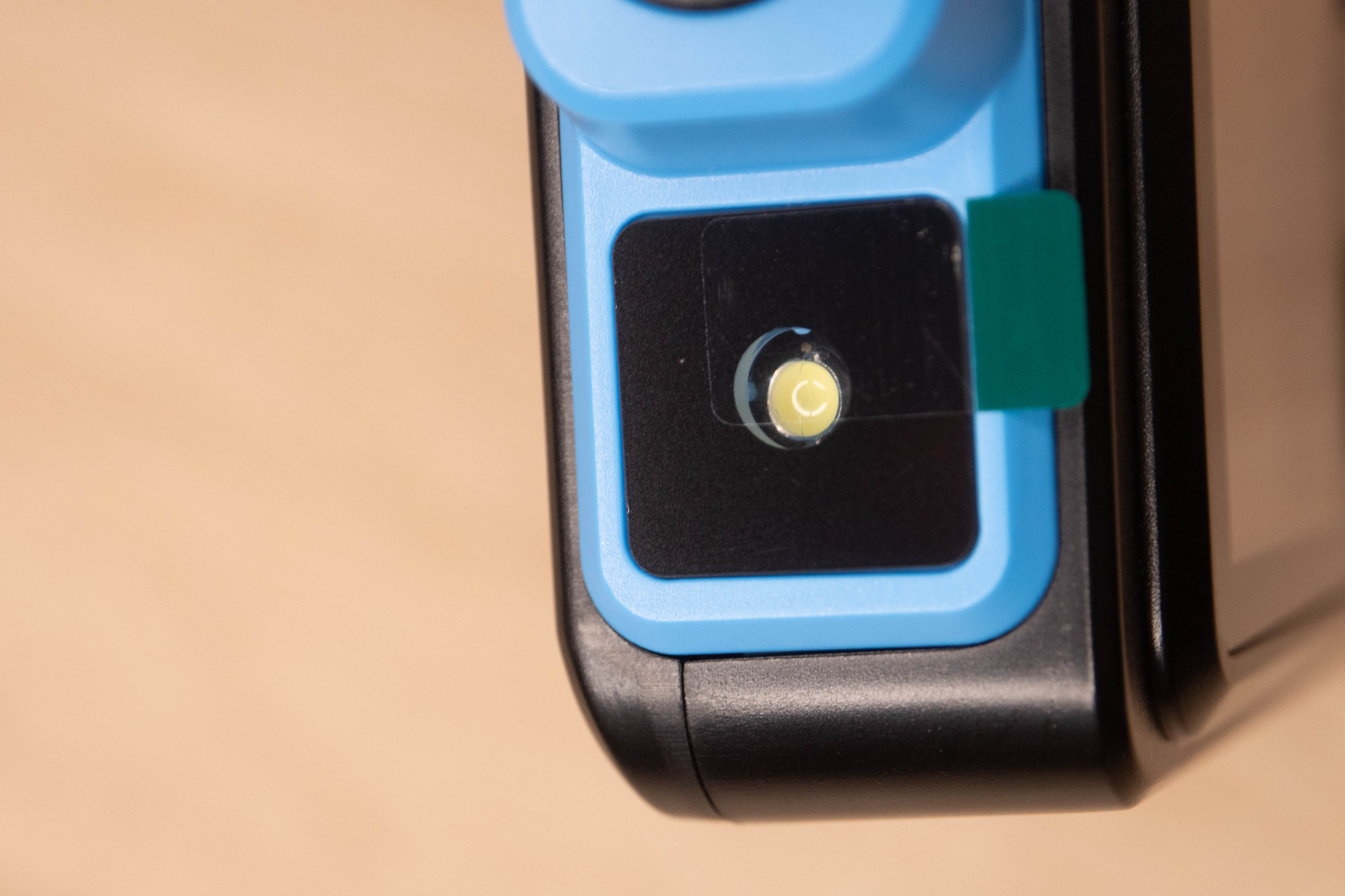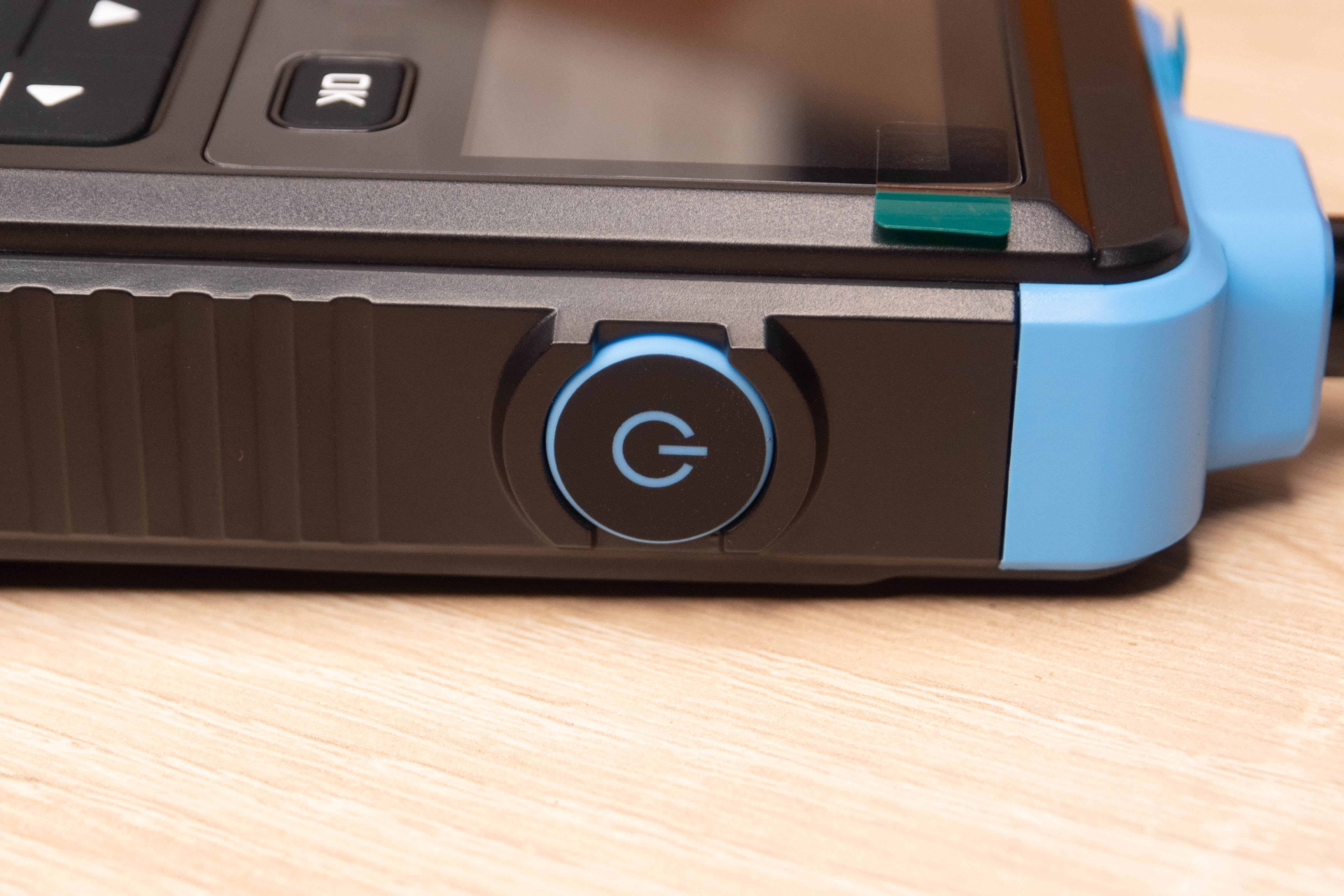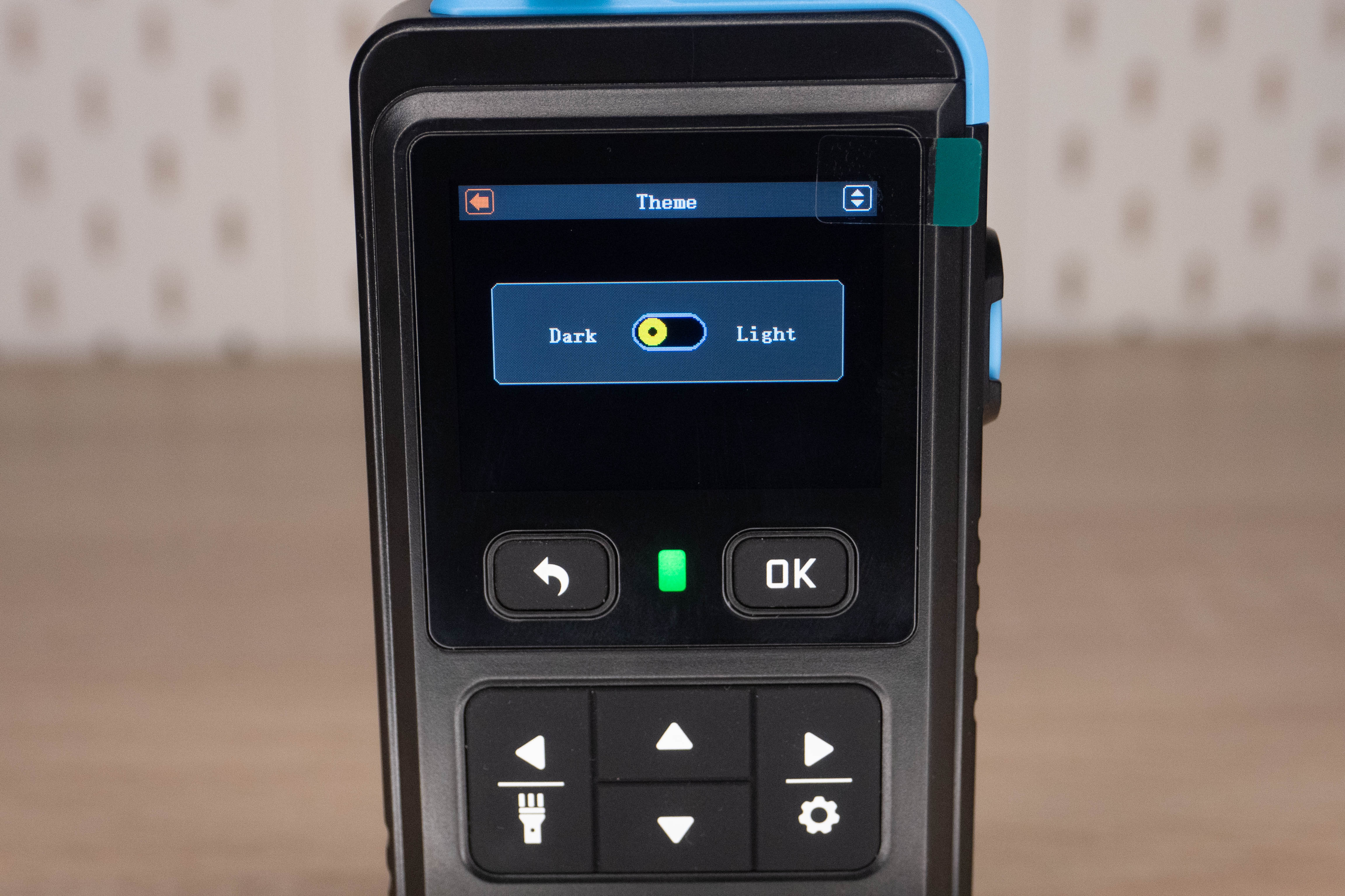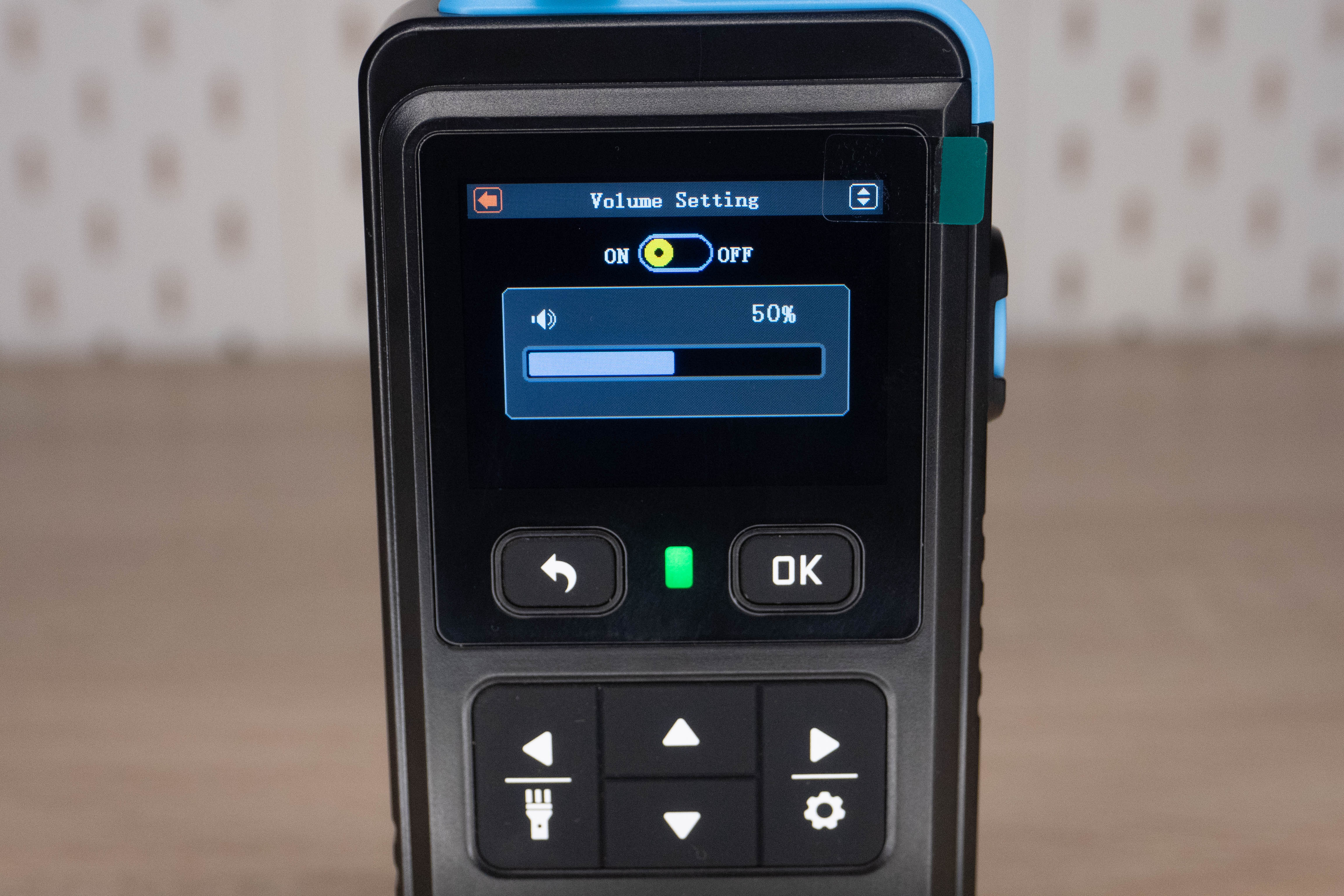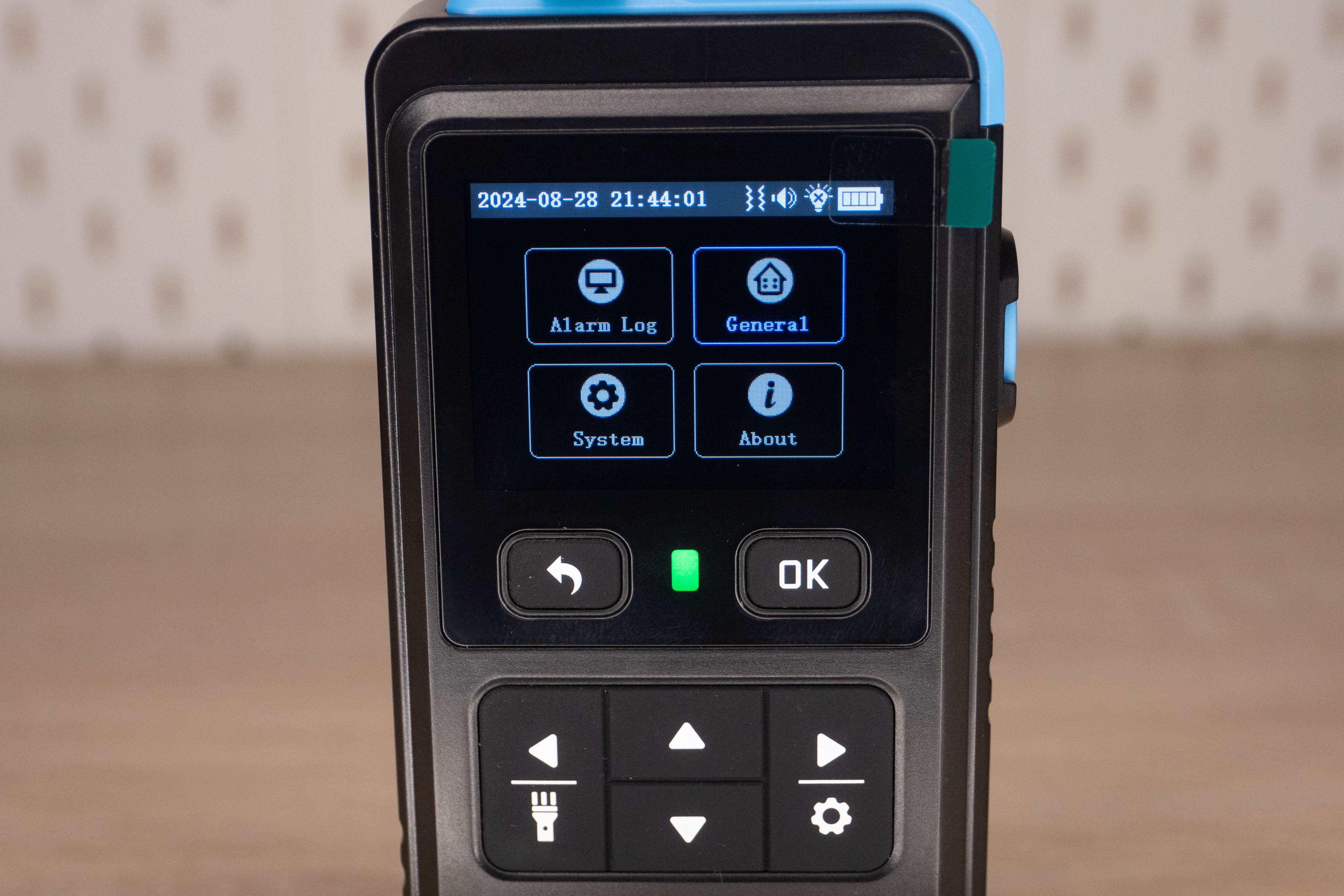 На лицевой стороне инструмента находится цветной дисплей и шесть элементов управления. Кнопка включения/выключения расположена на правой грани и окружена пластиковым кольцом, которое избавляет от случайных нажатий. Сзади наклеен шильдик с краткими характеристиками и окошко датчика температуры + влажности.