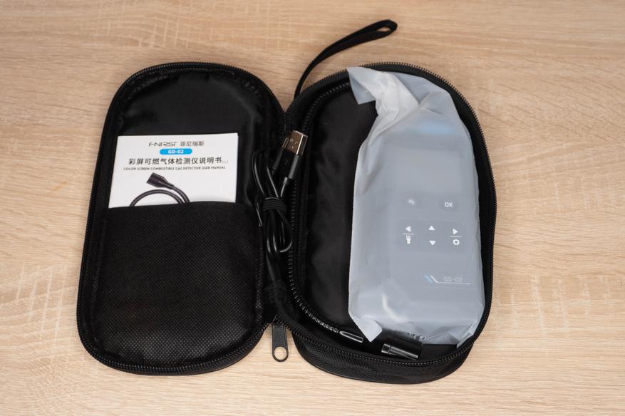 Сам детектор находится в сумке из плотного материала, в комплекте также имеется кабель для зарядки и инструкция.