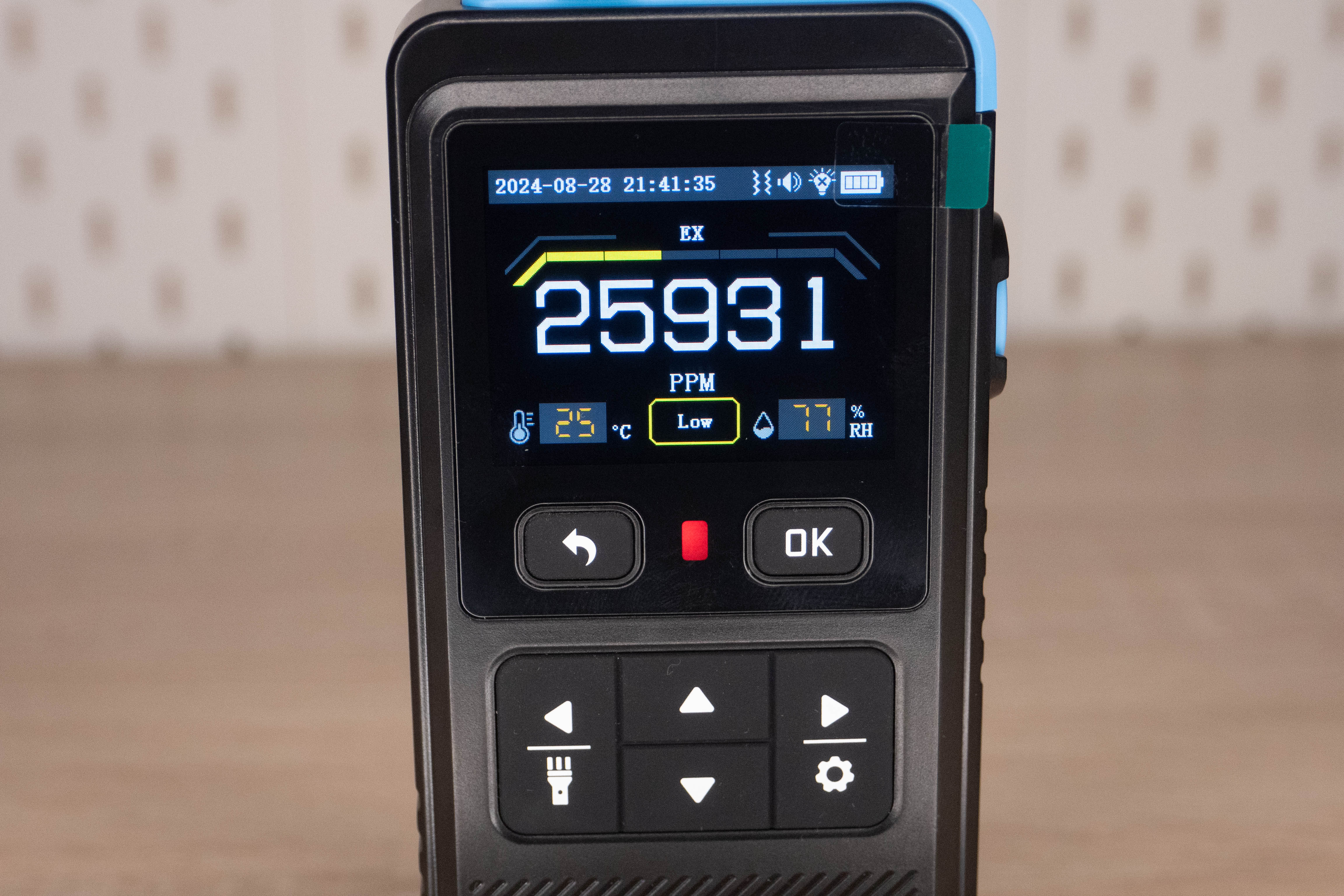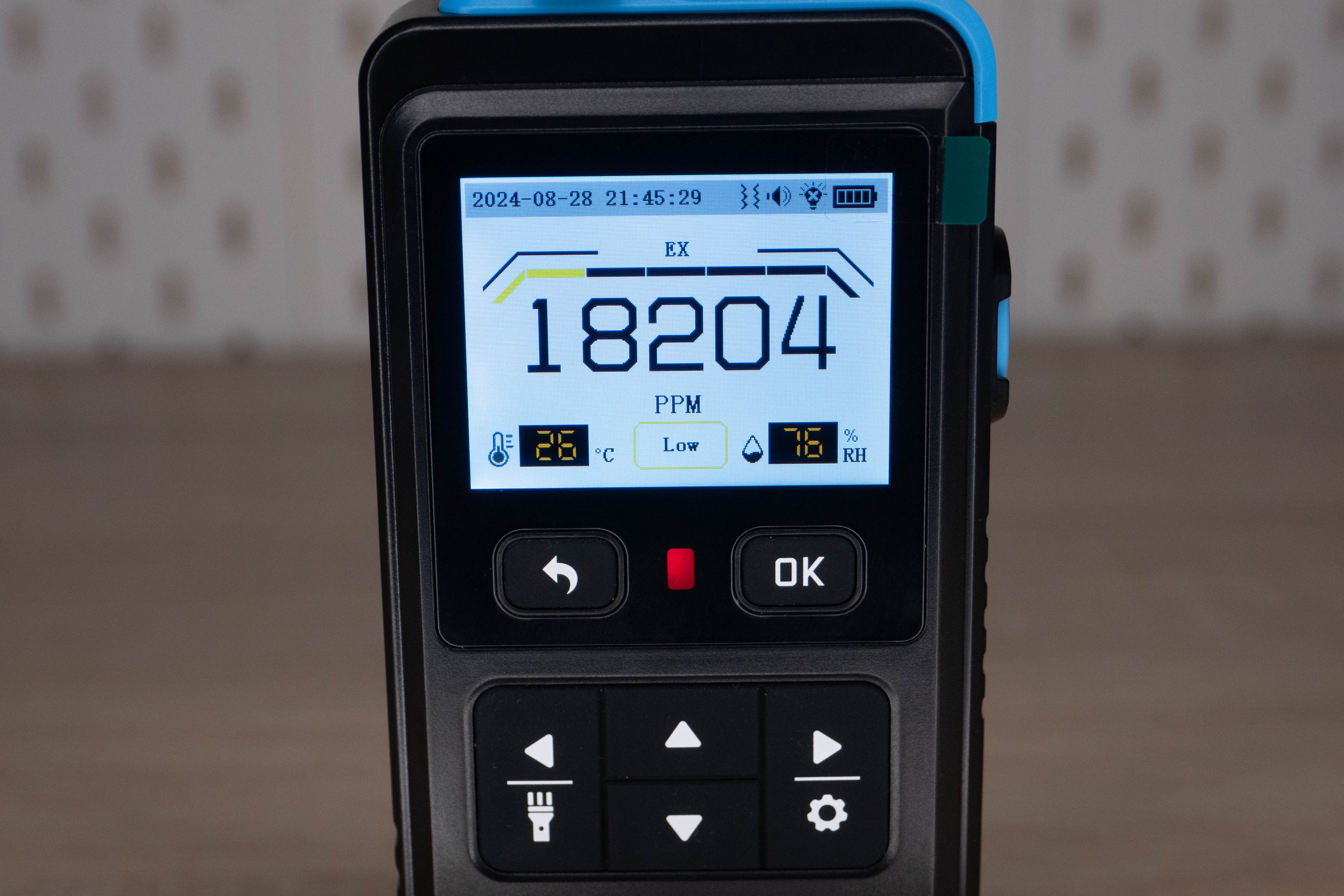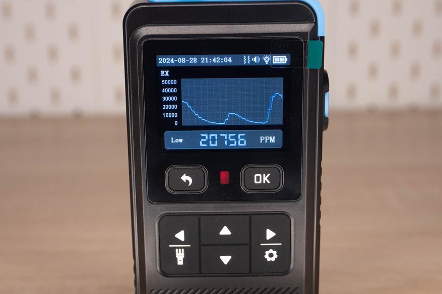 При включении устройству нужно время на «прогрев», после чего на экране появляется значение концентрации газа, барограф для быстрой визуальной оценки, при превышении указанных показателей, активируется дополнительная индикация, звук и вибрация. Чуть ниже отображается текущая температура, влажность и уровень опасности. При желании можно переключиться на график.