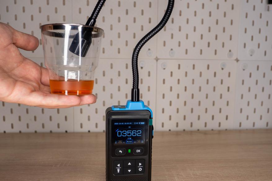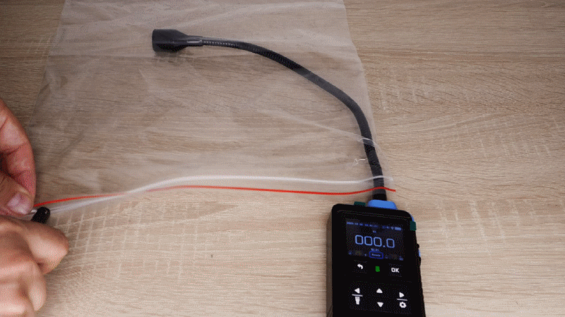 На верхней грани имеется фонарик и гибкая трубка длиной 36см, на конце которой находится датчик анализатора.