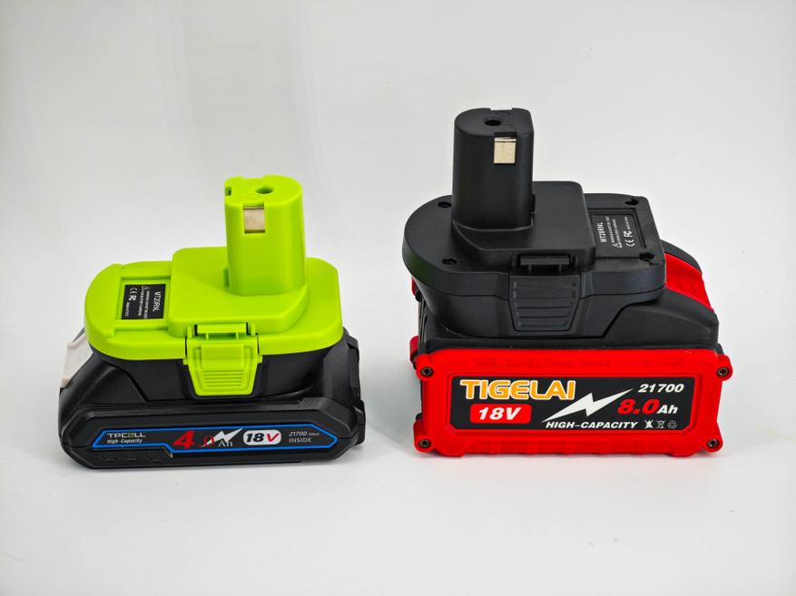 Вот так выглядит адаптер MT20RNL, подключенный к АКБ, совместимыми с Макита. Это типовые 18-вольтовые батареи, разве что «черная» (слева) 0 это однорядная на 21700-элементах, а «красная» (справа) — это уже двухрядная и тоже на 21700. Оба аккумулятора повышенной ёмкости и позволяют работать дольше, чем оригинальные АКБ. Эти батареи на базе 21700 ячеек подробно разобраны и проверены тут.