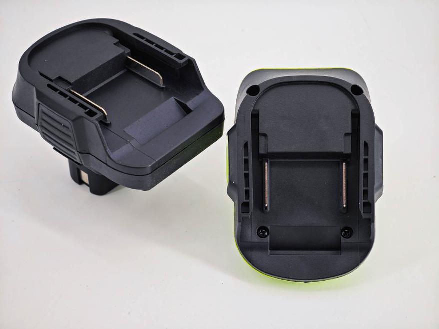 Нужно сказать, что более дорогой (зеленый) адаптер выполнен чуть более качественно — имеется углубление для третьего контакта (температурный датчик, сам контакт отсутствует). Черный же адаптер более простой по конструкции. Но основные моменты присутствуют — и защелки, и маркировка полярности. Обводы верхней части корпуса напоминают оригинальную батарею Ryobi 18V One+. Нижняя часть уже выполнена в форме ответного слайдера для батарей Макита (или совместимых).