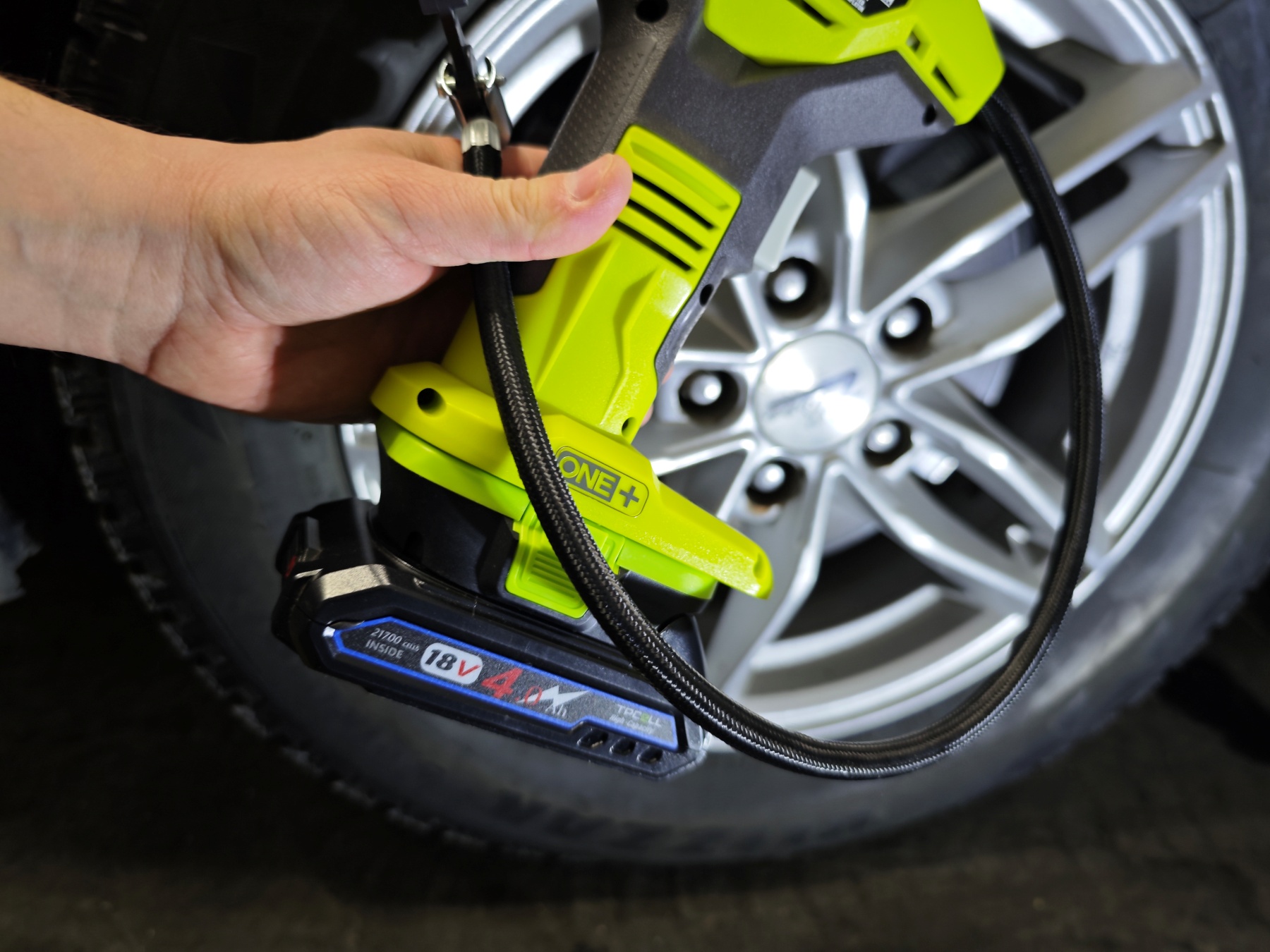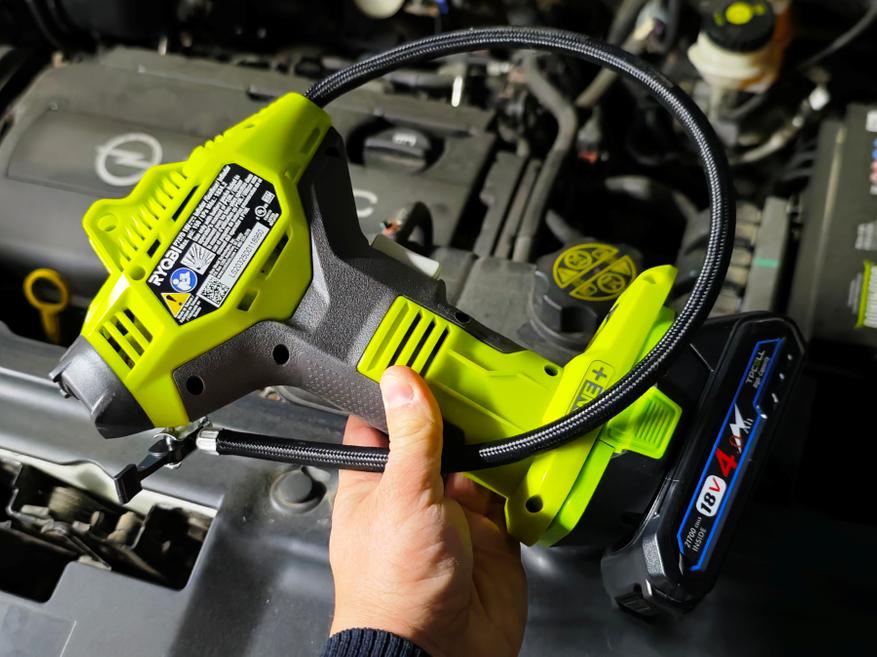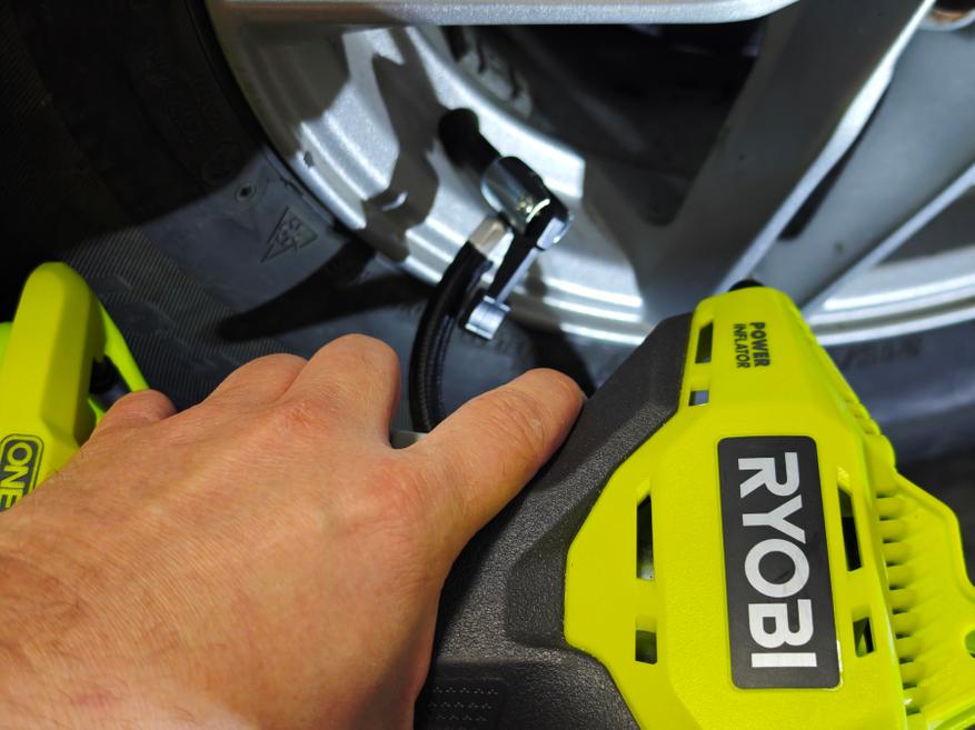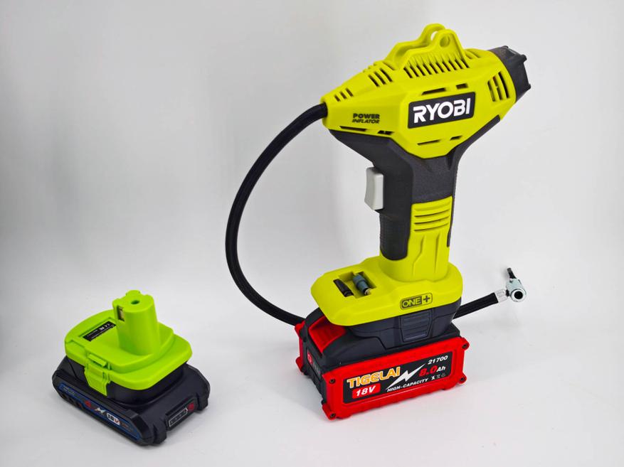 А вот долгожданный тест. Подключил одну из своих 18-вольтовых батарей к инструменту и попробовал его в работе. Если честно, этот насос-компрессор для автомобиля от бренда Ryobi у меня лежал несколько лет без дела, так как нормальный батарей к нему я так и не подобрал. И вот, можно сказать, его второе «рождение» — прекрасно работает от АКБ Макита.