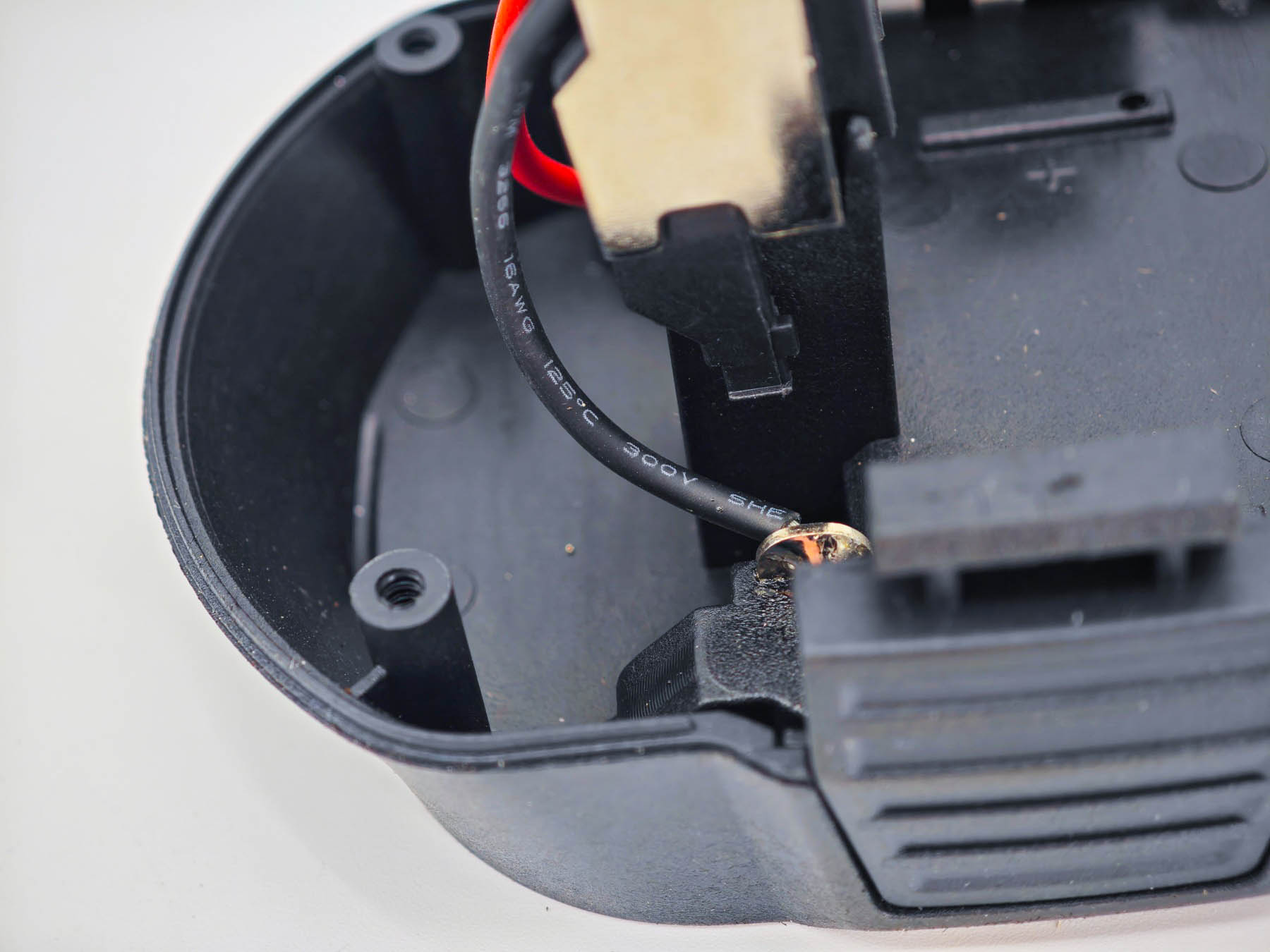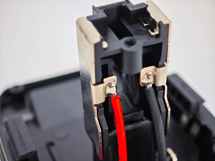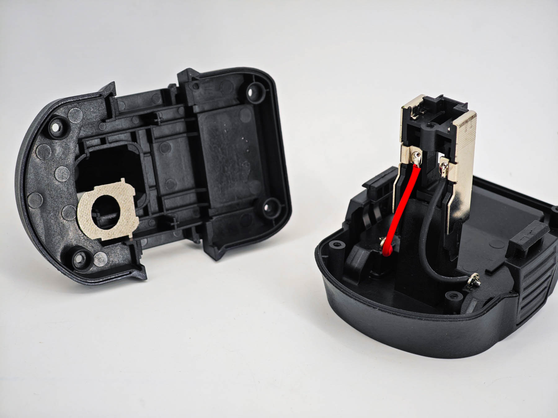 Важный момент — контакты для подключения подписаны. Это хорошо, так как можно сравнить и с оригинальными батареями, и с ответной стороной в инструменте. Да и просто проверить с помощью тестера-мультиметра будет проще. А так как третий контакт отсутствует, то и подзаряжать батарею в таком адаптере не получится.