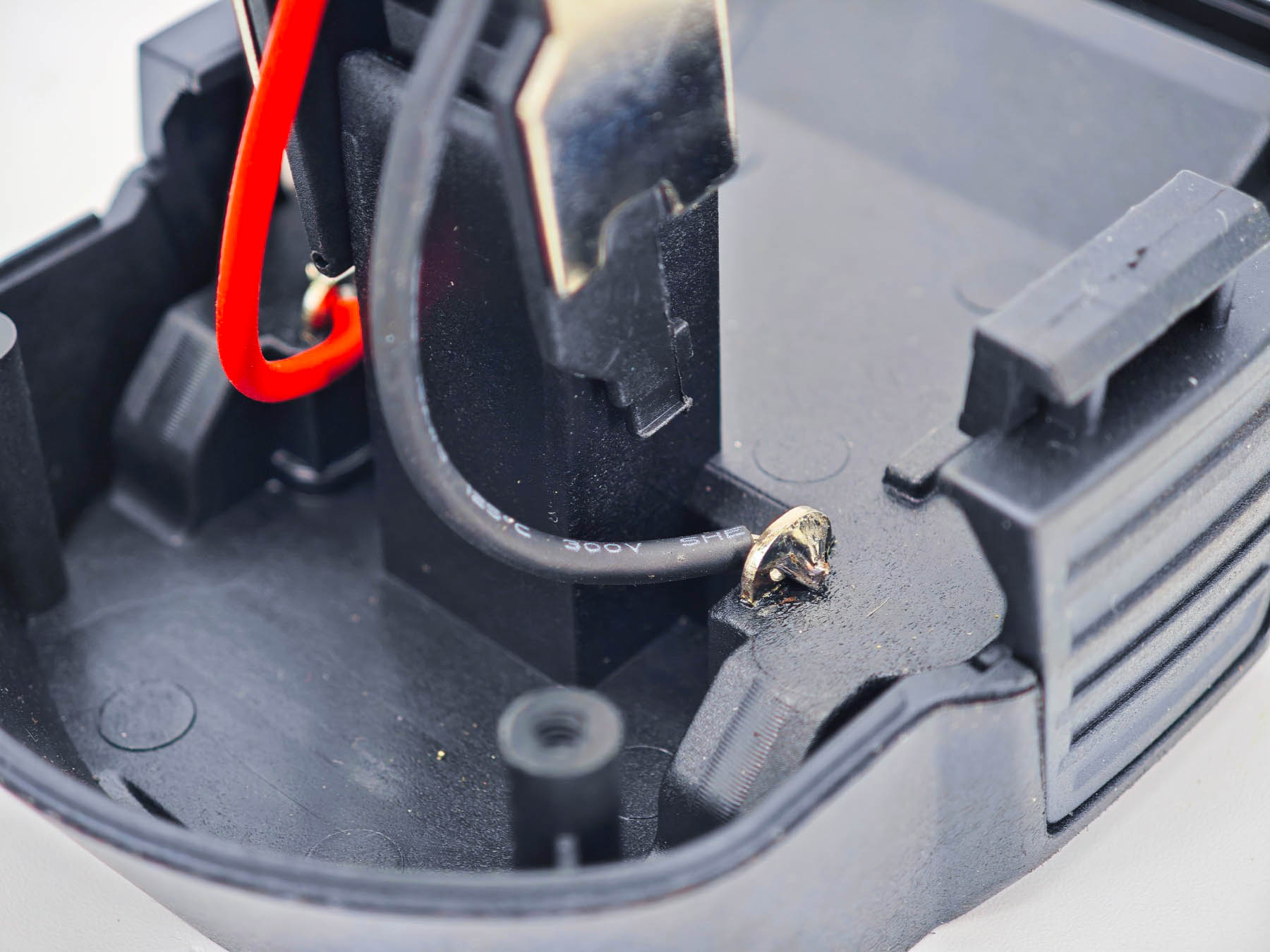 Как правило, подобные адаптеры, да и прочие силовые переходники/удлинители/разветвители, я разбираю — необходимо оценить, что внутри, какое сечение проводов, какой способ электрического соединения, да и в целом, осматриваю конструкцию. В данном случае никакого «криминала» не было — присутствует изоляционная прокладка в районе контактов, сами пластины широкие, соединение методом пайки. Сама пайка аккуратная, лишнего флюса нет. Провода разного цвета, сечение указано как 16AWG (примерно 1.5 мм2, до 15 Ампер).
