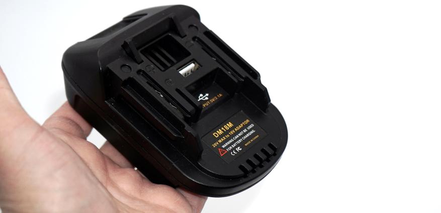 Вам может показаться громоздким такой вариант с адаптером. Но для других типов и размеров батарей существуют более компактные переходники. Например, вот такой адаптер на фото — это DM18M, позволяющий использовать АКБ Makita для инструмента Девольт или Милуоки. Его отличие от адаптера из обзора — наличие модуля питания USB (5V).