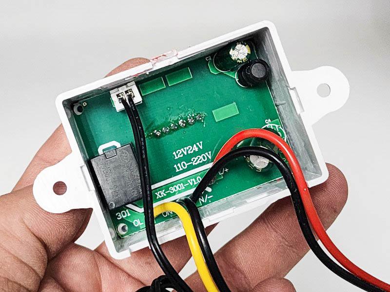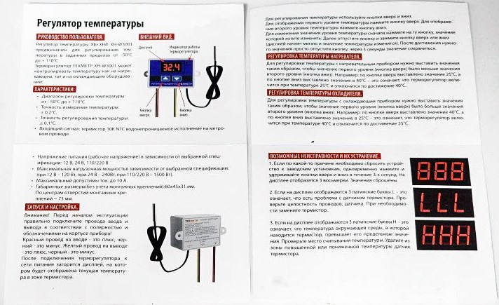 У меня есть несколько таких контроллеров, один имеет нанесенную инструкцию на обороте. Забыл сказать, что провода тут несъемные, а в качестве крепления — пара «ушек» на пластиковом корпусе. В качестве датчика используется терморезистор типа NTC с сопротивлением 10 кОм.
