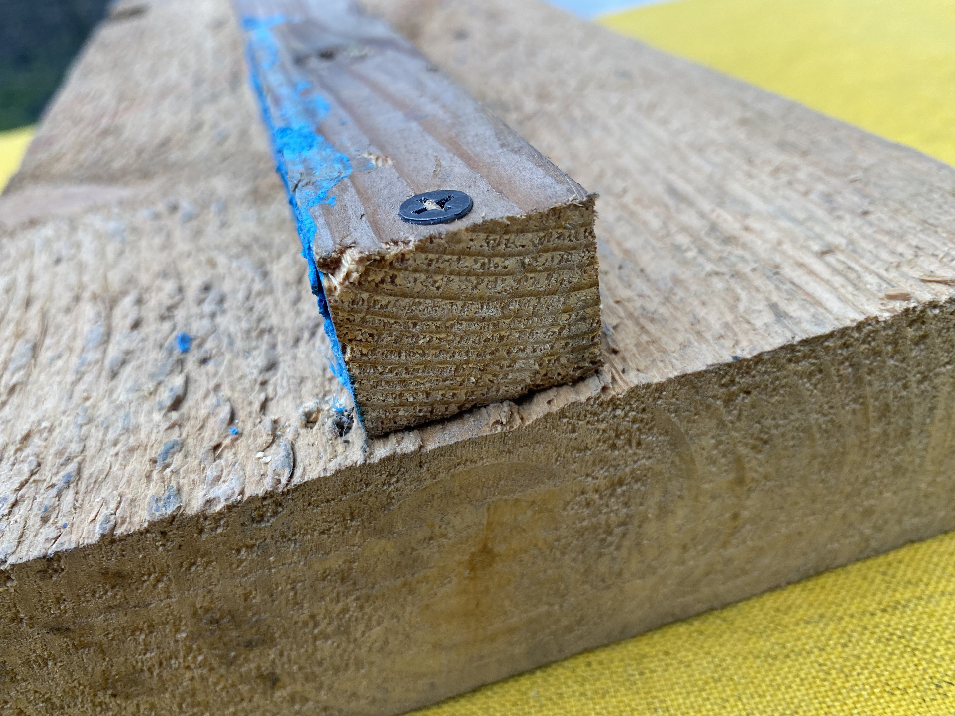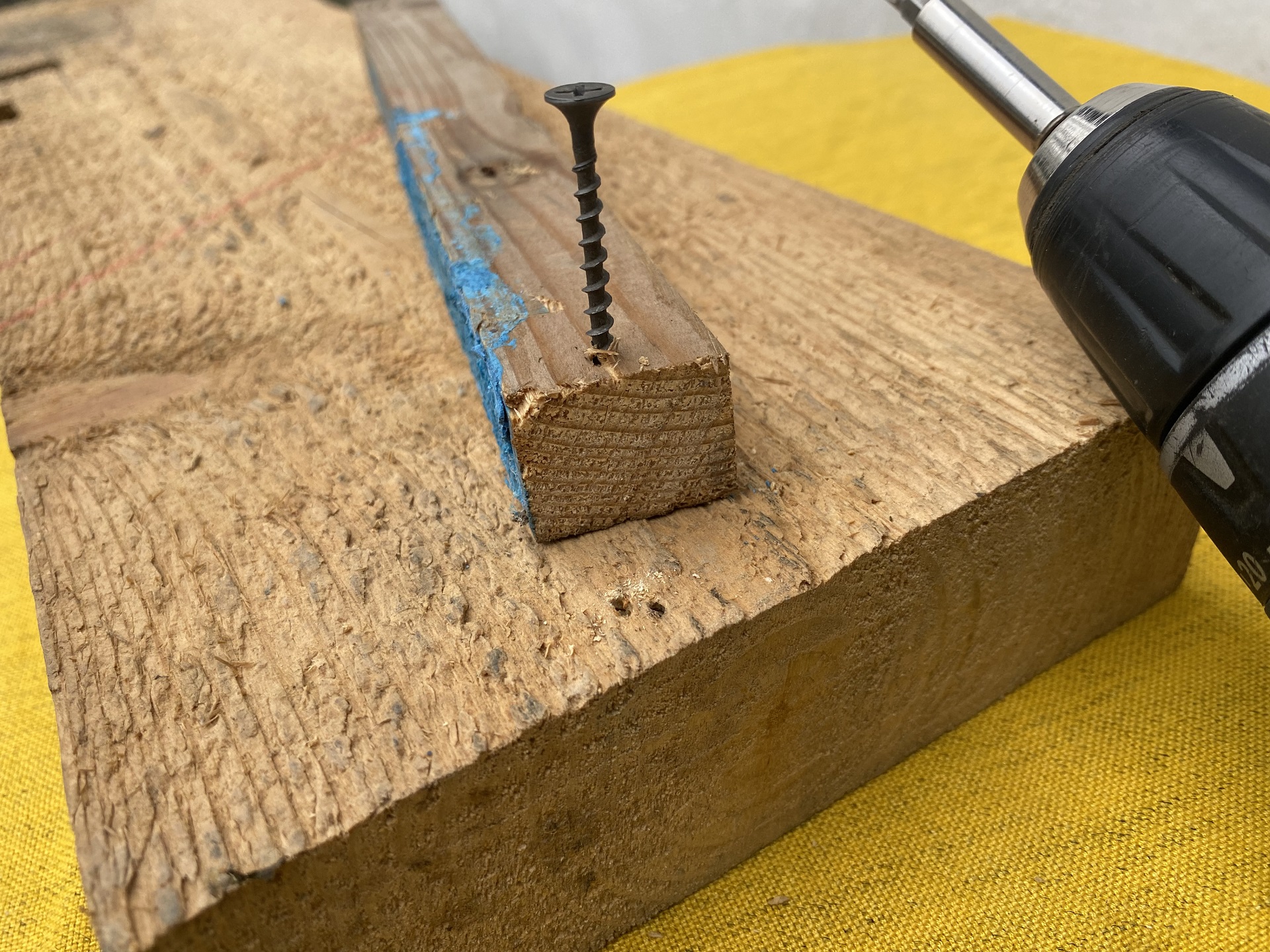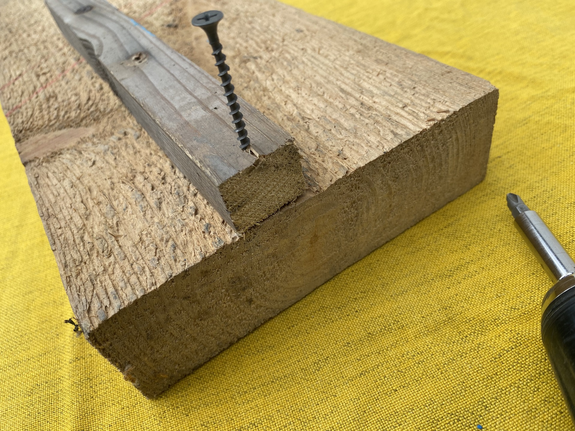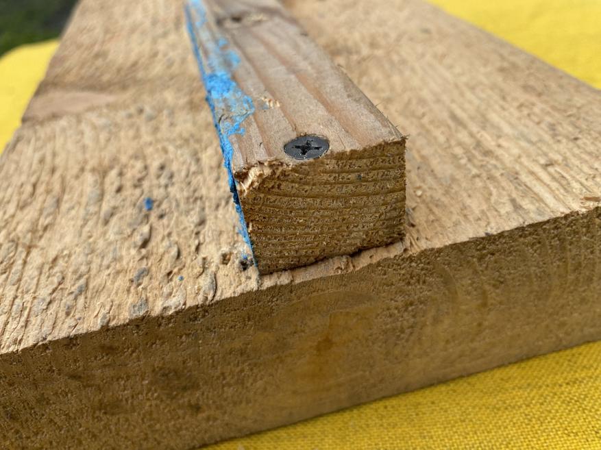Чтобы наглядно показать, как образуются трещины, сначала просто вкрутим саморез в брус с доской на расстоянии порядка 5 мм от края.
