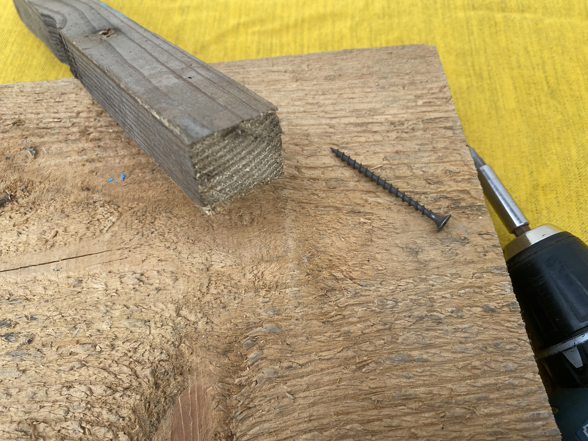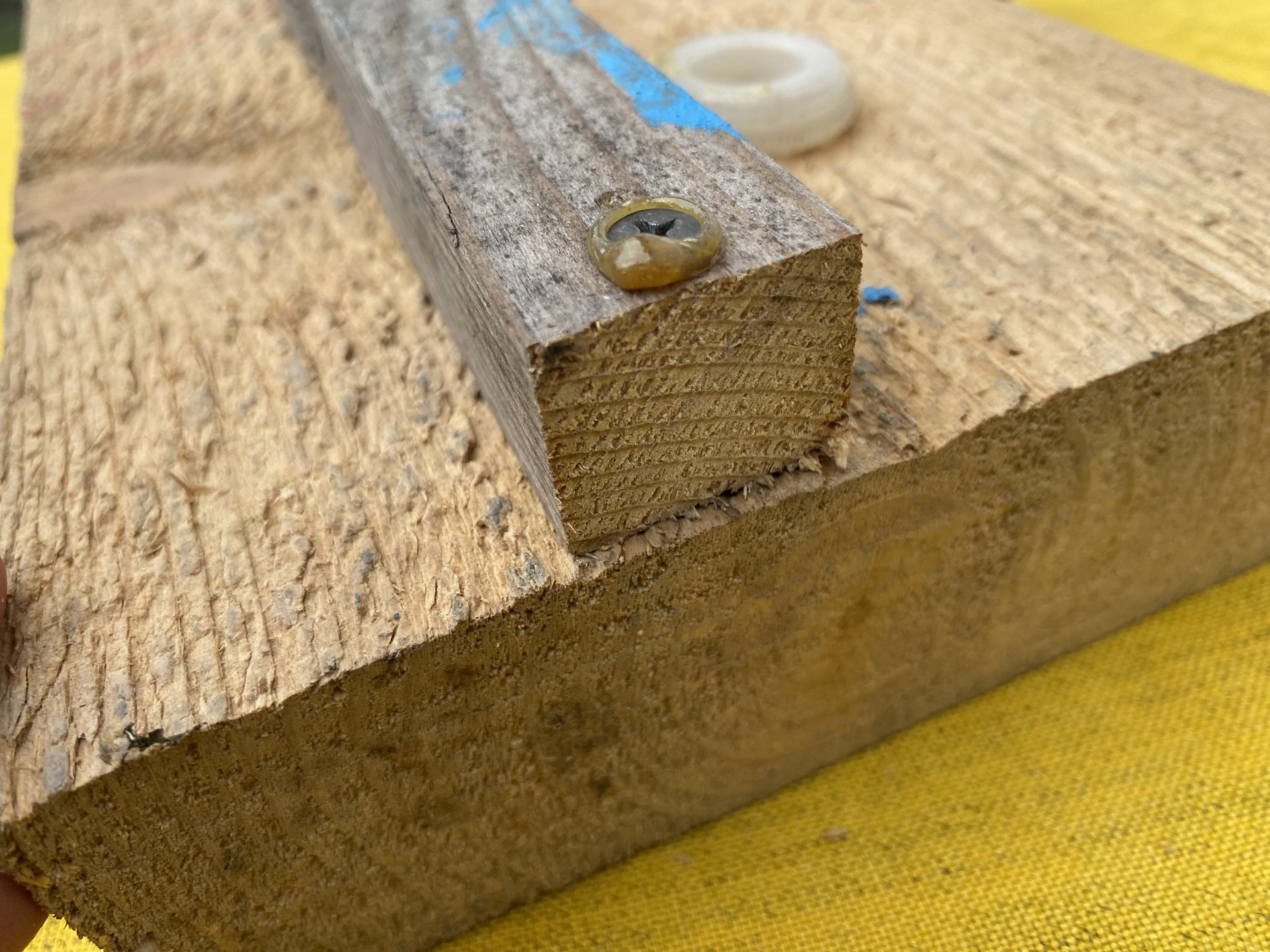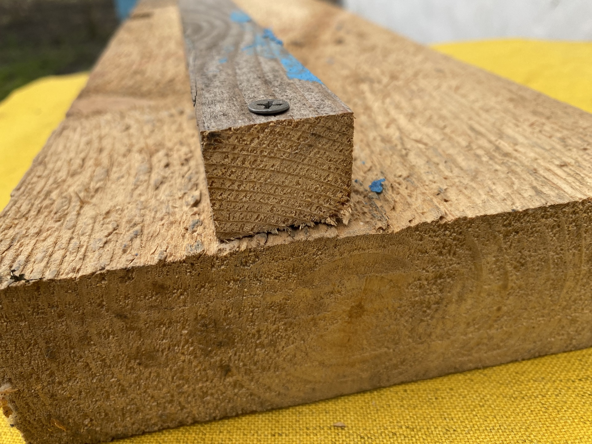 Чтобы наглядно показать, как образуются трещины, сначала просто вкрутим саморез в брус с доской на расстоянии порядка 5 мм от края.
