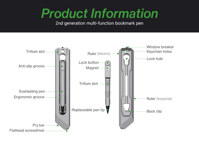 Функциональные мини инструменты появляются порой в самых неожиданных предметах. Азиатский стартап Ideaspark представил на платформе «Кикстартер» книжную металлическую закладку из титана, дополненную пятью инструментами. BookBond Pen (уже второй версии) оснащен съемным инструментом для письма с графитовым стержнем, линейкой, скошенной мини монтировкой, и даже стеклобоем на торце.