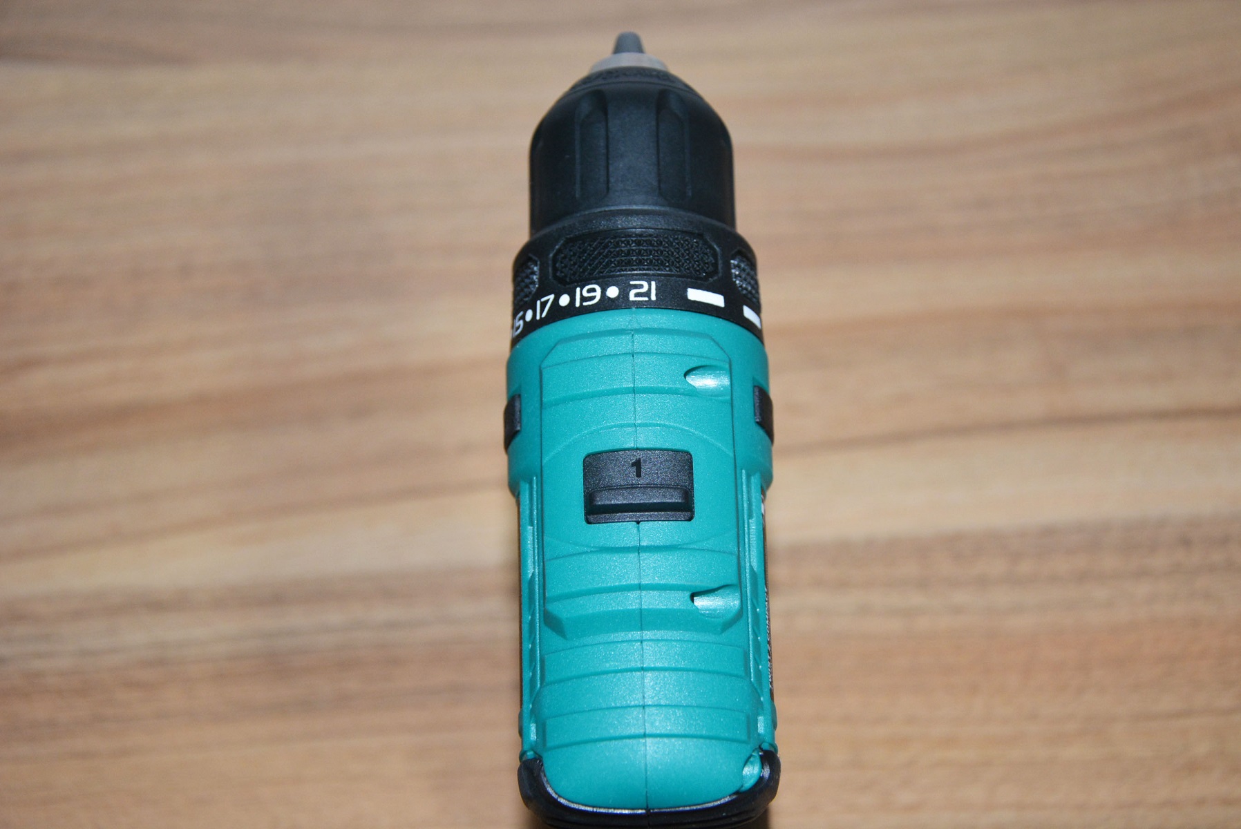 Сверху расположен переключатель скоростей вращения вала. В первом положении скорость регулируется кнопкой пуска в диапазоне 0-300 об/минуту, во втором от 0 до 1300. Муфта регулировки крутящего момента имеет 21 позицию для шуруповерта и одну для режима дрели. Производитель рекомендует придерживаться следующих диапазонов регулировки момента для разных материалов при работе шуруповертом: