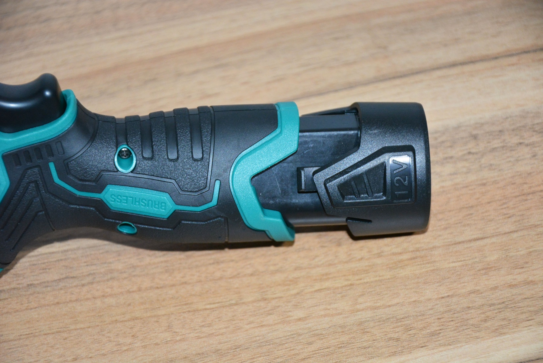 Будучи установленным в инструмент аккумулятор является продолжением его рукоятки и в готовом к использованию виде габариты шуруповерта составляют всего 5,1*15,9*18,0 см. По сути рукоятка является наиболее габаритной частью шуруповерта. Применение бесщеточного двигателя сделало шуруповерт компактным и легким. При этом тут имеются все атрибуты серьезного инструмента: обрезиненная рукоятка, кнопка с плавной регулировкой оборотов, переключатель направления вращения вала, подсветка рабочей зоны, индикатор уровня заряда аккумулятора и корпус из крепкого пластика с обрезиненными секторами.