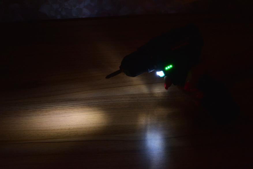 Подсветка рабочей зоны и индикатор заряда аккумулятора начинают светиться одновременно с пуском двигателя. Они конечно же немного отнимают емкости аккумулятора, но это же светодиоды с минимальным потреблением, а пользы от них значительно больше.