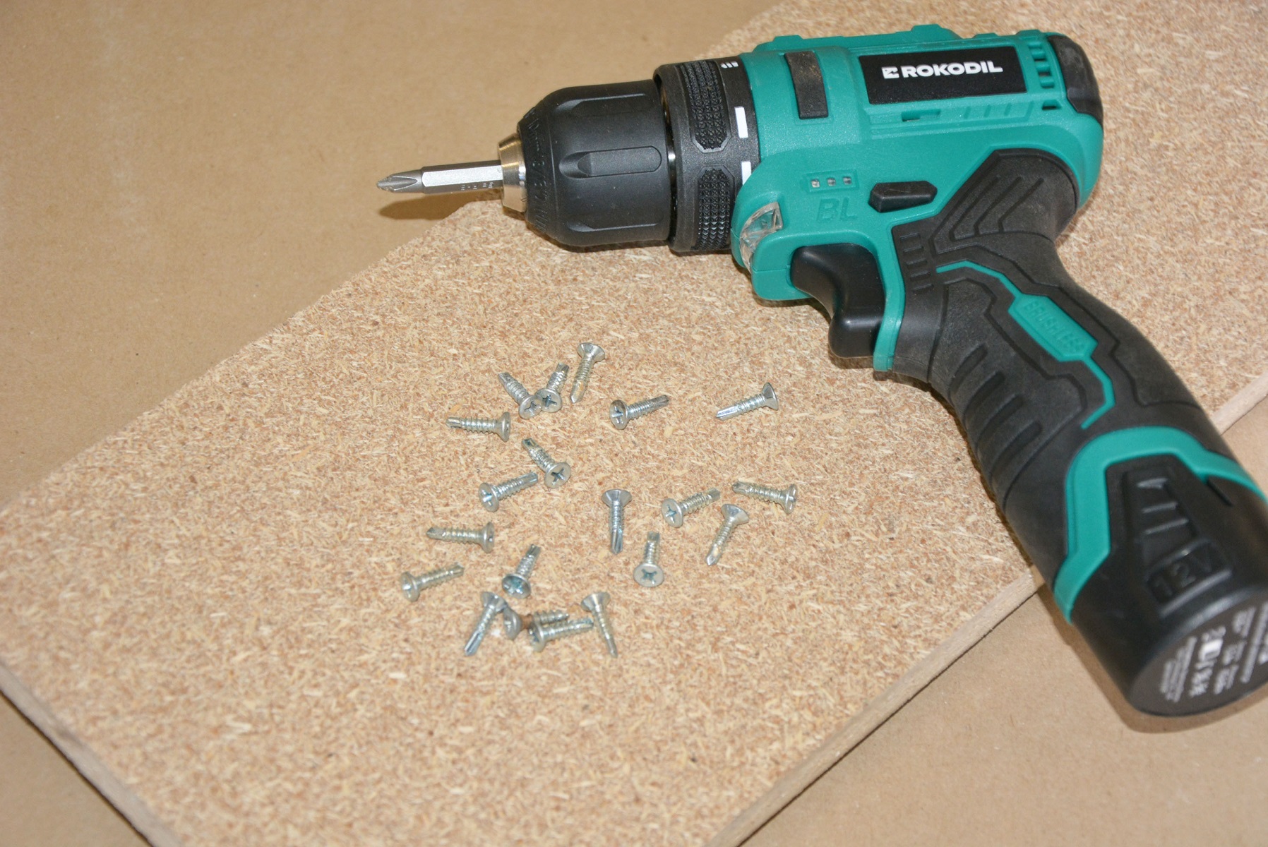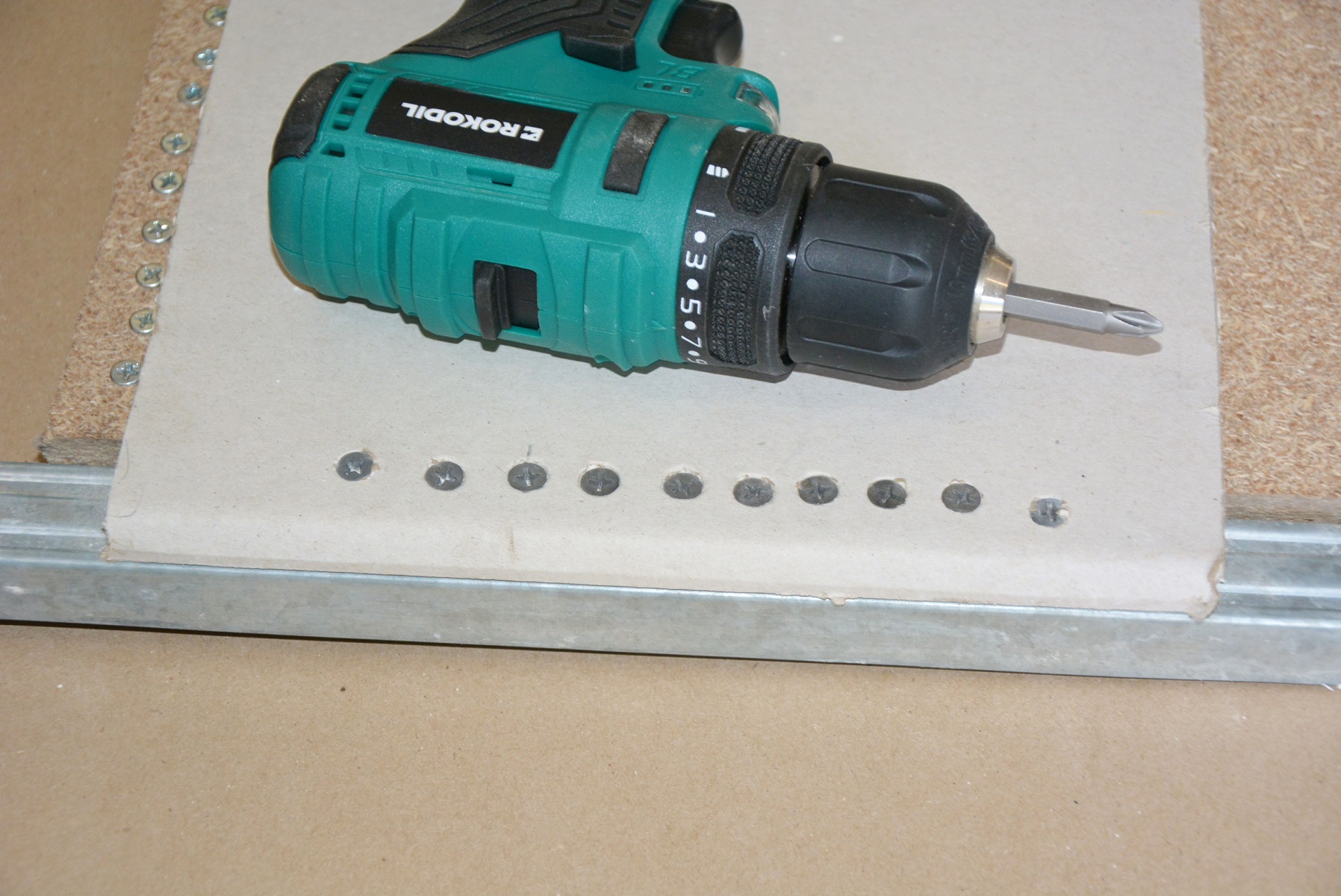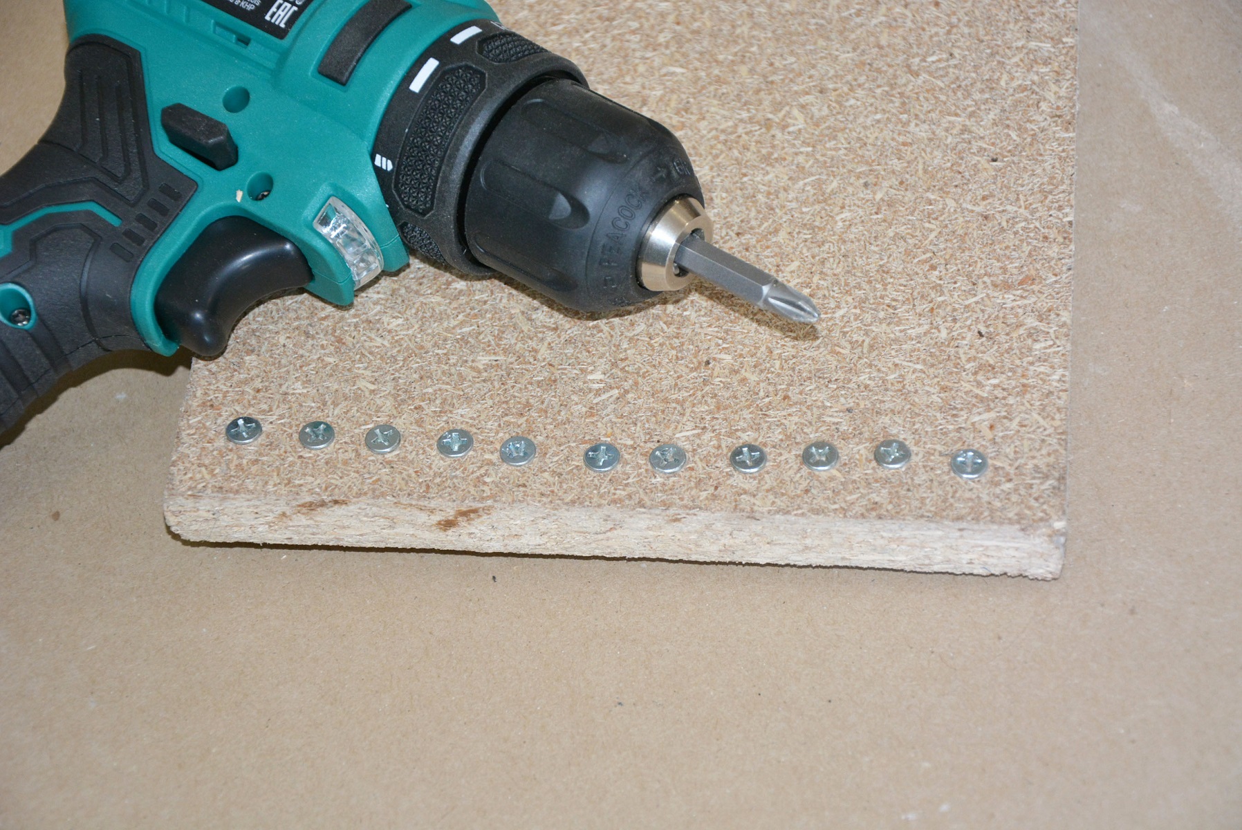 Далее были саморезы со сверлом, какие часто применяются для крепления всяких крючков, направляющих, петель и многого другого в современной мебели. Селектор крутящего момента сначала установил на 3. Важно было, чтобы шуруповерт вовремя остановился и не рассверливал отверстия в ДСП, иначе держаться фурнитура уже не будет как следует. При углублении саморезов до шляпки, как и положено, начинала срабатывать трещотка.