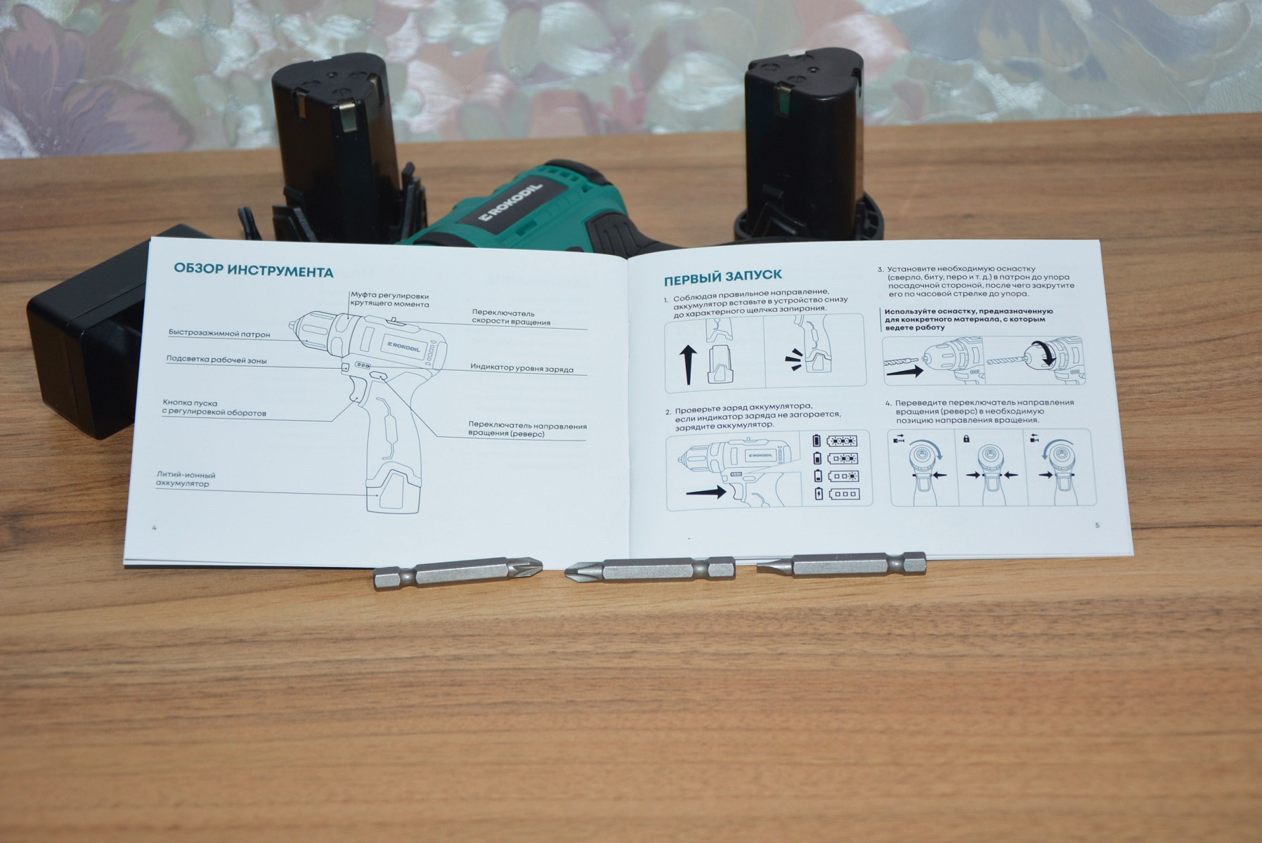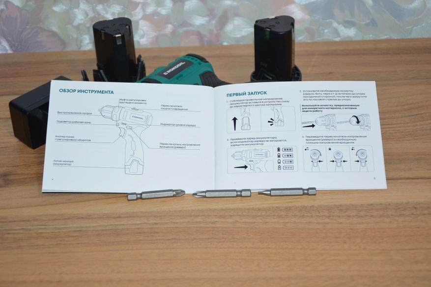 Всего в набор входит восемь предметов — две АКБ, зарядное устройство, шуруповерт, инструкция и три самых ходовых биты.