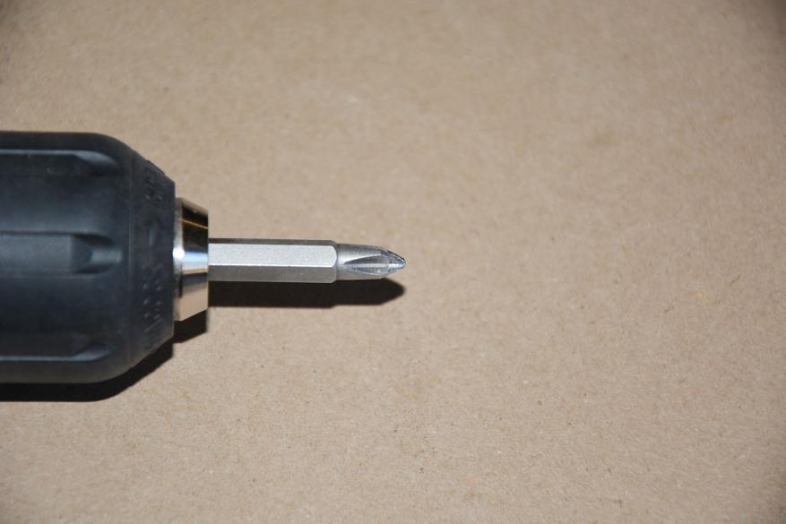 Биты сами по себе не магнитные, но саморезы держатся на них уверенно и можно особо не переживать, что при сборке мебели крепеж придется искать под ногами. Шуруповерт в руке лежим удобно, развесовка хорошая, а главное — вес небольшой. Всего 824 грамма, из которых 700 весит тушка. С таким вряд ли устанешь, даже работая где-то под потолком на вытянутой руке.
