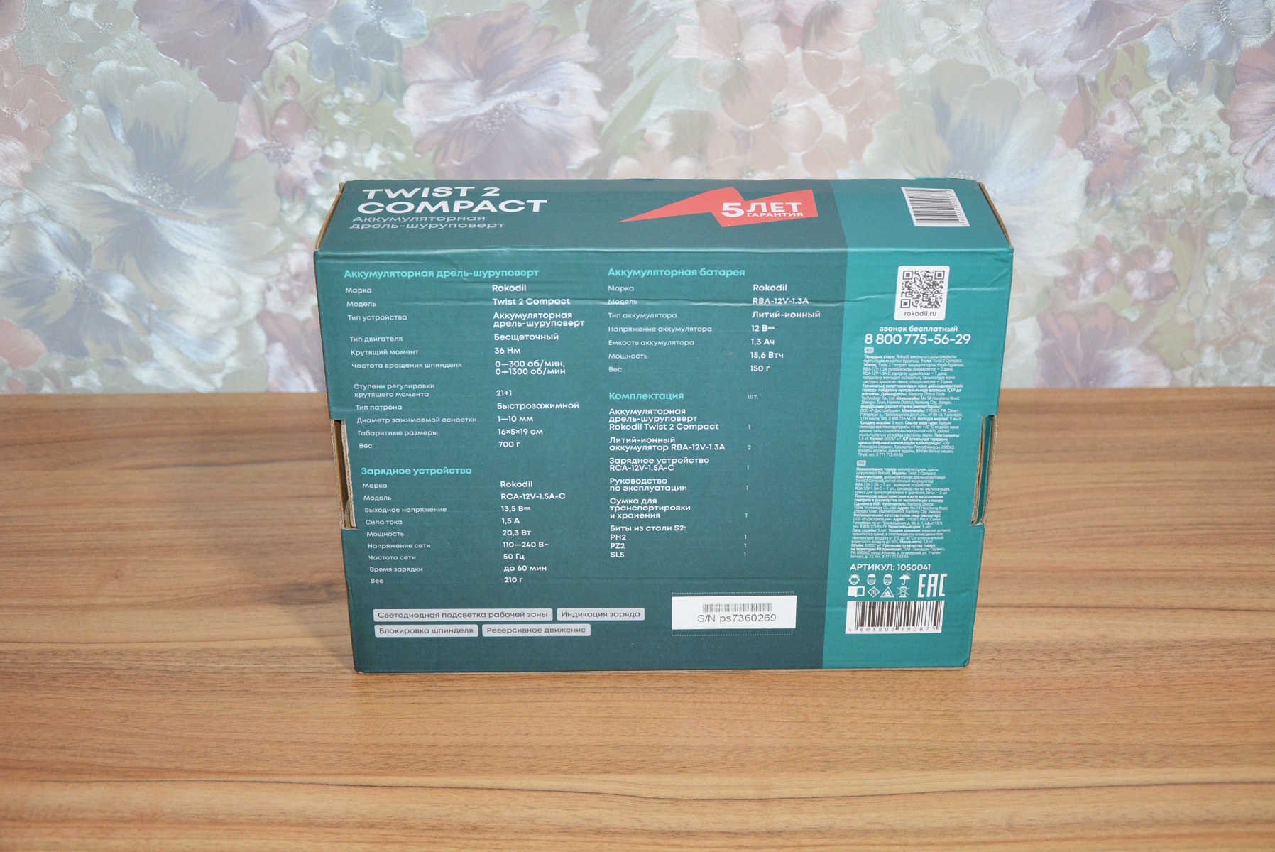 Если вы выбираете шуруповёрт впервые, для разовых домашних ремонтных работ или сборки мебели, и вам вручат довольно большую коробку, не удивляйтесь — шуруповерт действительно компактный. Коммерческая же упаковка, оформленная в фирменном стиле Rokodil, не только защищает содержимое, но и наглядными значками и подписями рассказывает о его характеристиках и особенностях. Например, что гарантия на шуруповерт составляет 5 лет. Или, что в комплекте не одна, а две аккумуляторных батареи. Причем сзади указаны характеристики как самого шуруповерта, так и аккумуляторов.