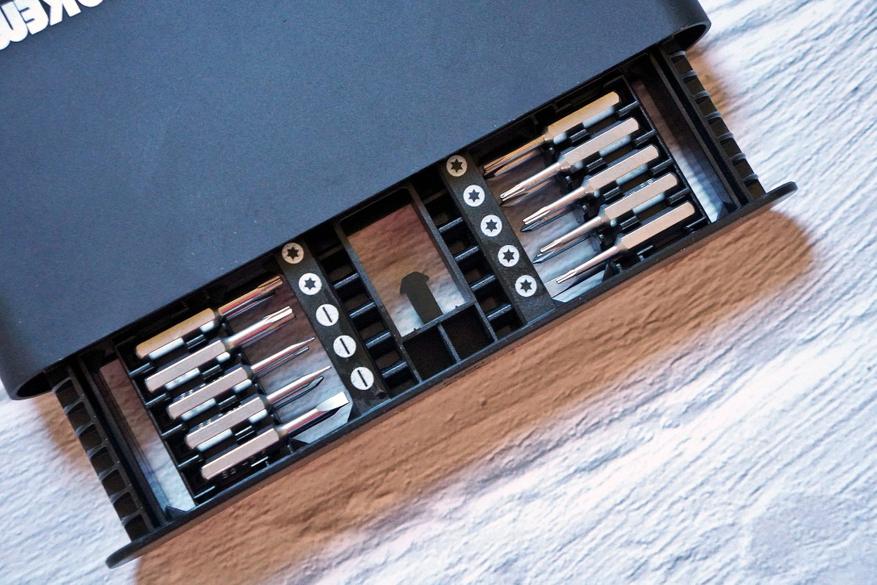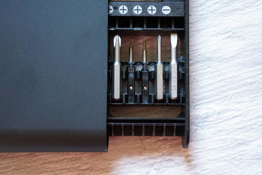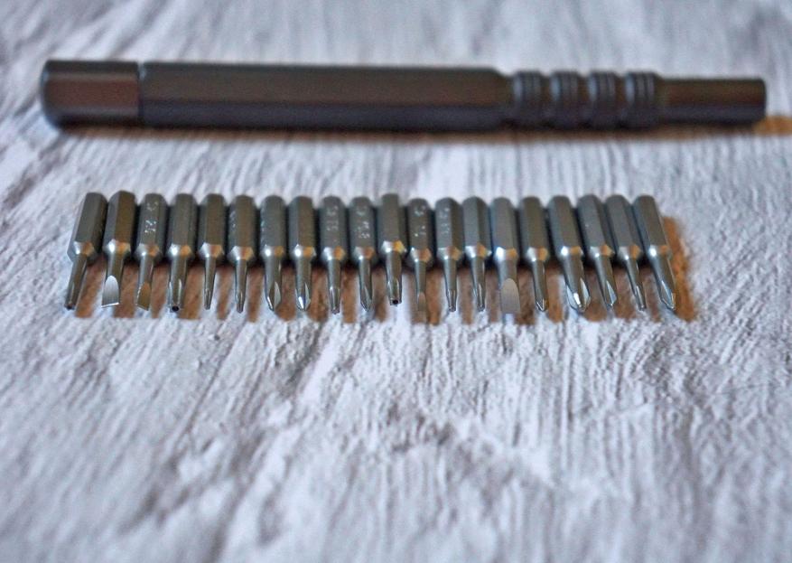 С одной стороны располагаются сменные биты, с другой — рукоятка-битодержатель (все элементы промаслены):