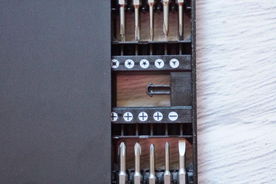 Биты располагаются с обеих сторон удерживающей их платформы и, благодаря встроенным магнитам, не вываливаются: