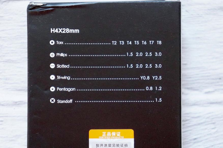 Перечень сменных бит, входящих в комплект набора, можно увидеть на обратной стороне коробки. В составе: