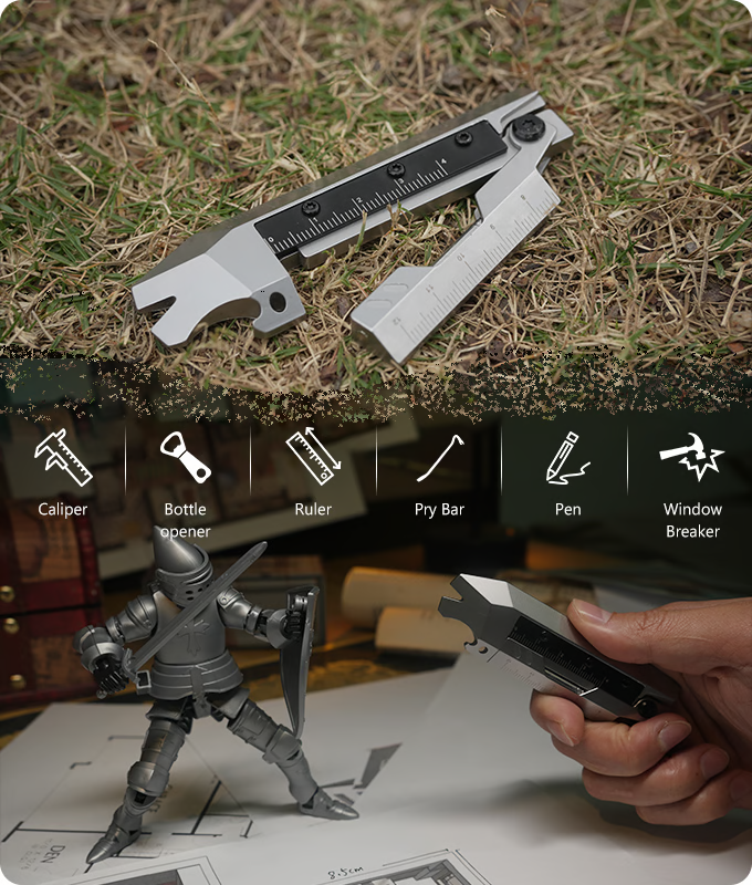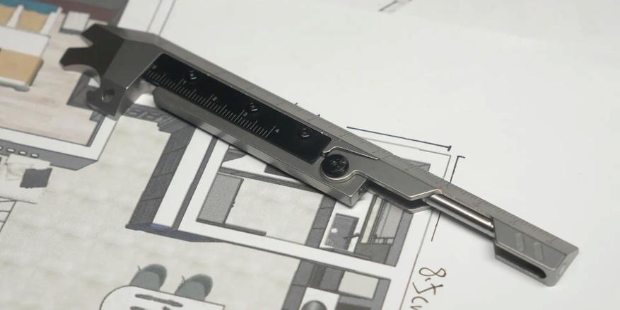 Для людей работающих с бумажными эскизами и чертежами стартап из Гонконга представил необычный мультитул, совмещающий линейку, «вечный карандаш» и функции характерные для EDC мультиинструментов (монтировка, гвоздодер, открывалка для бутылок и пр.). Линейка отградуирована только в метрическом формате, измерения и работа возможны в пределах 12 см. Инструмент выполнен из нержавеющей стали марки 420.