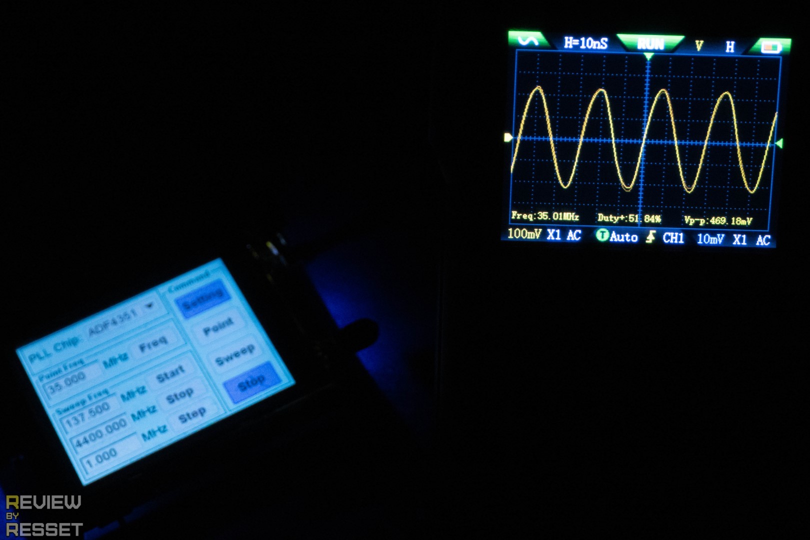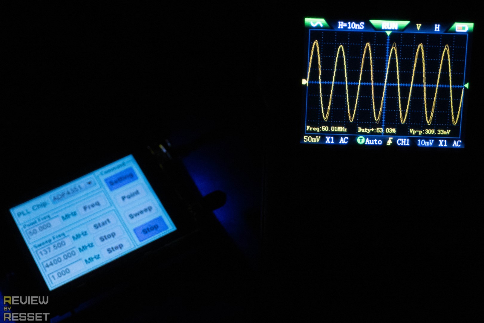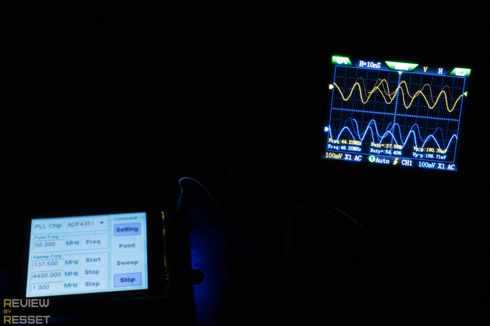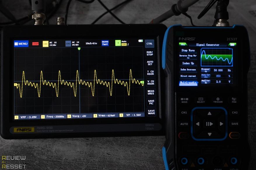 Для генерации максимальной частоты использовался уже другой инструмент с минимальным порогом 35МГц, которые 2C53T вполне достойно вытянул. С включенным послесвечением видно небольшое дрожание формы, но оно совсем небольшое.