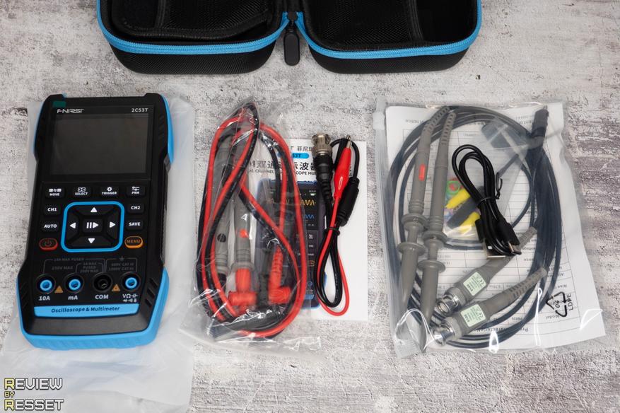 Вот весь комплект на одном фото. Щупы осциллографа распространенные 6100, для мультиметра провода тоже стандартные, с тонкими иголочками на концах.