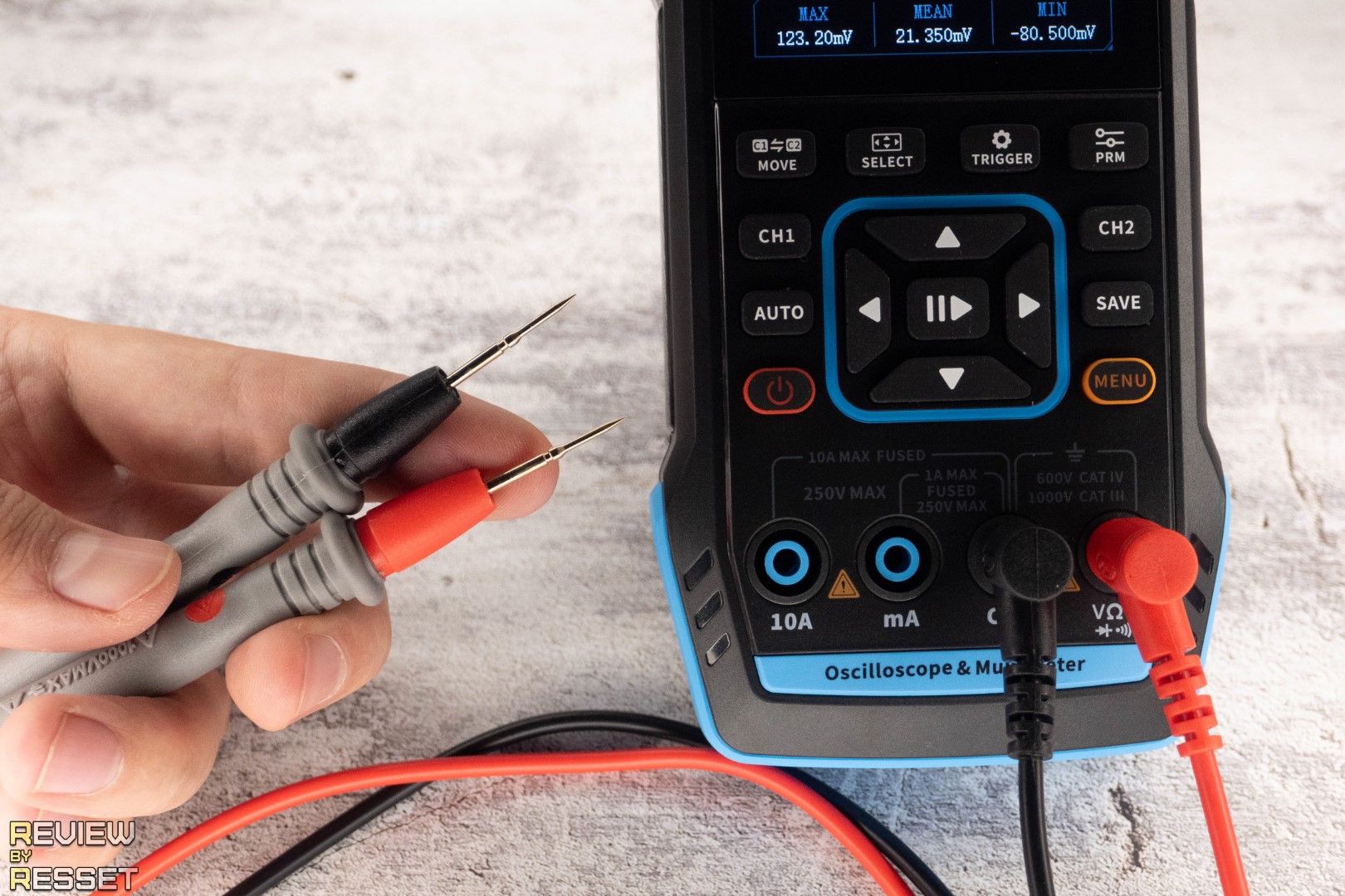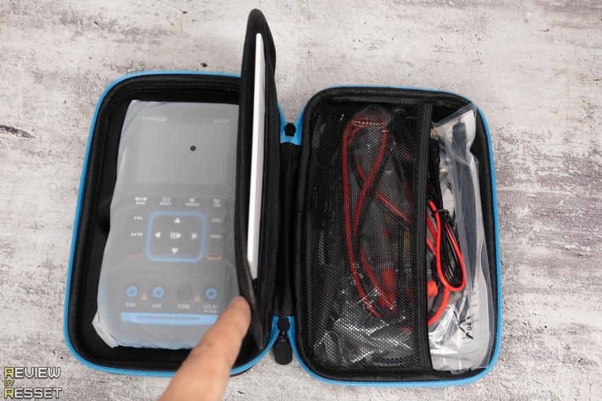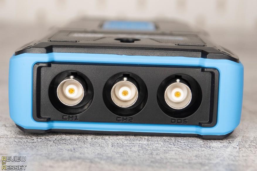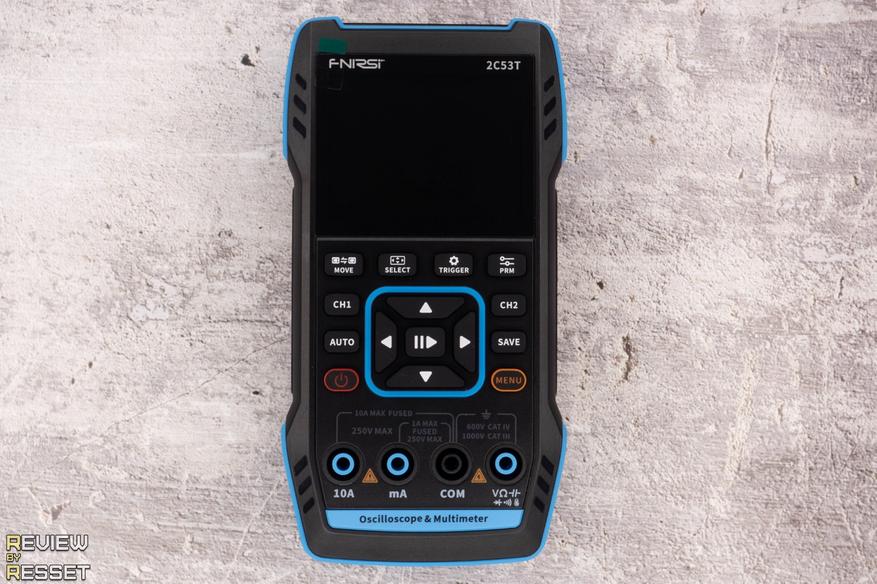 На лицевой стороне корпуса находится 2.8″ дисплей с разрешением 320*240, пятнадцать прорезиненных кнопок, обеспечивающих быстрый доступ к часто используемым пунктам настроек и четыре разъема мультиметра. Разъемы осциллографа и генератора находятся в верхней части.