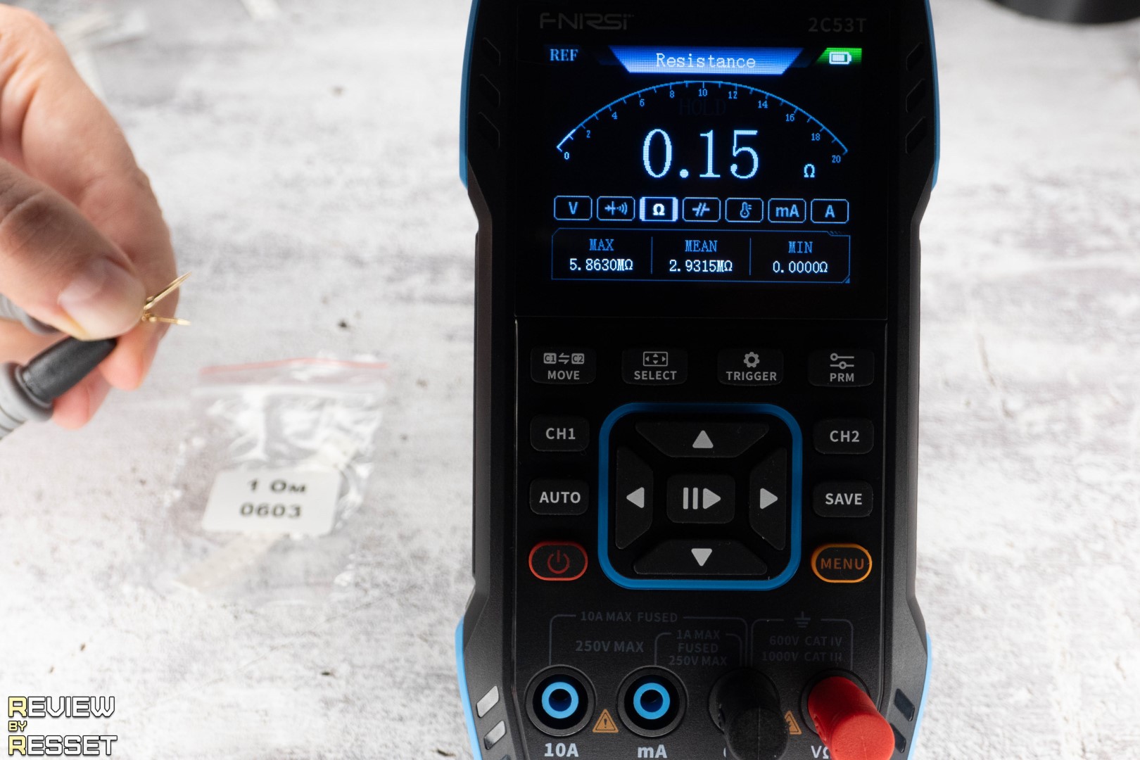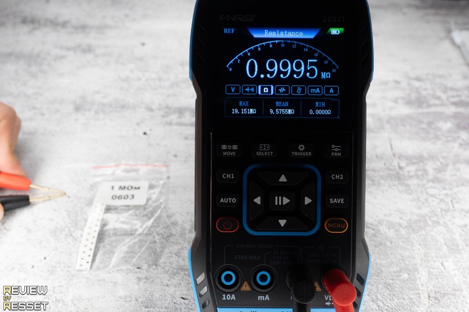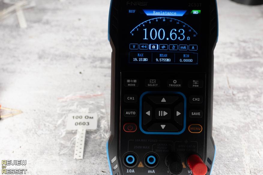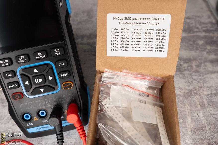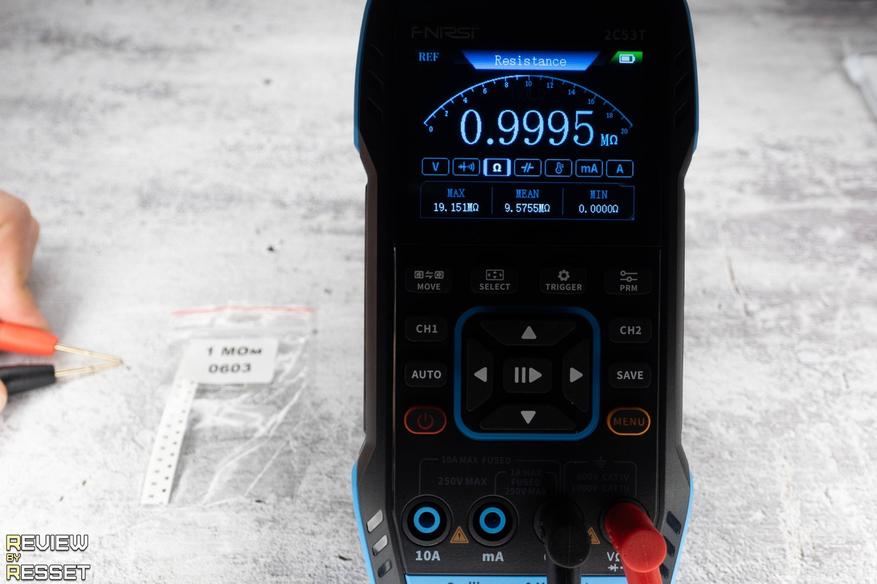 При замыкании щупов показывает сопротивление 0.15 Ом. Можно обнулить значение кнопкой «prm», но я подумал, что это может дать сдвиг на большой дистанции и не стал ничего трогать. Резисторы использовал типоразмера 0603, было сложно их «ловить», но из всех образцов, что у меня были, только у них допуск 1%. Разброс на дистанции получился минимальный, к 1 МОм не хватило 0.0005 до единицы, но это мелочи.
