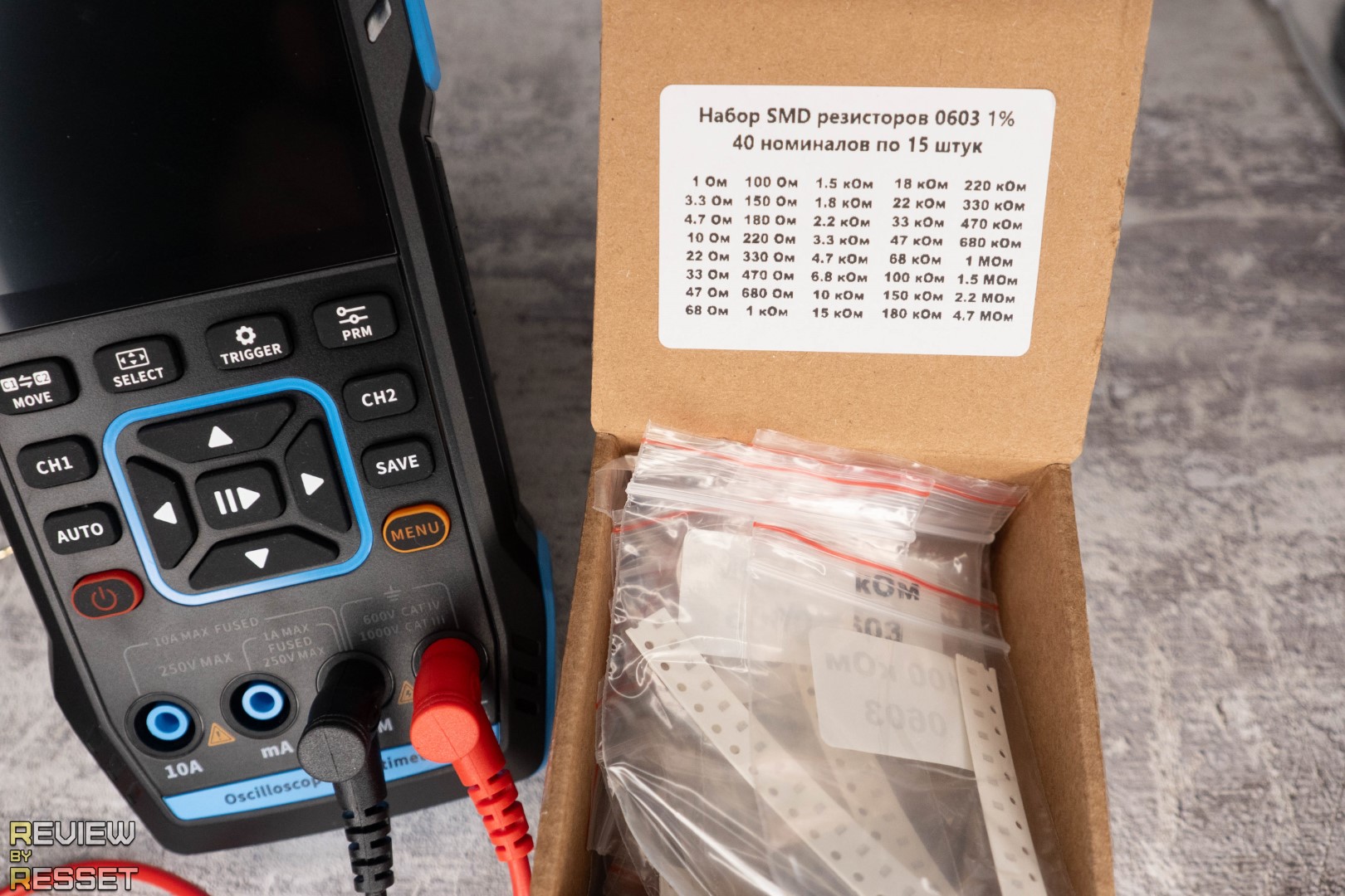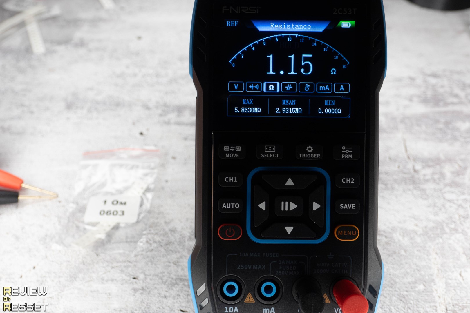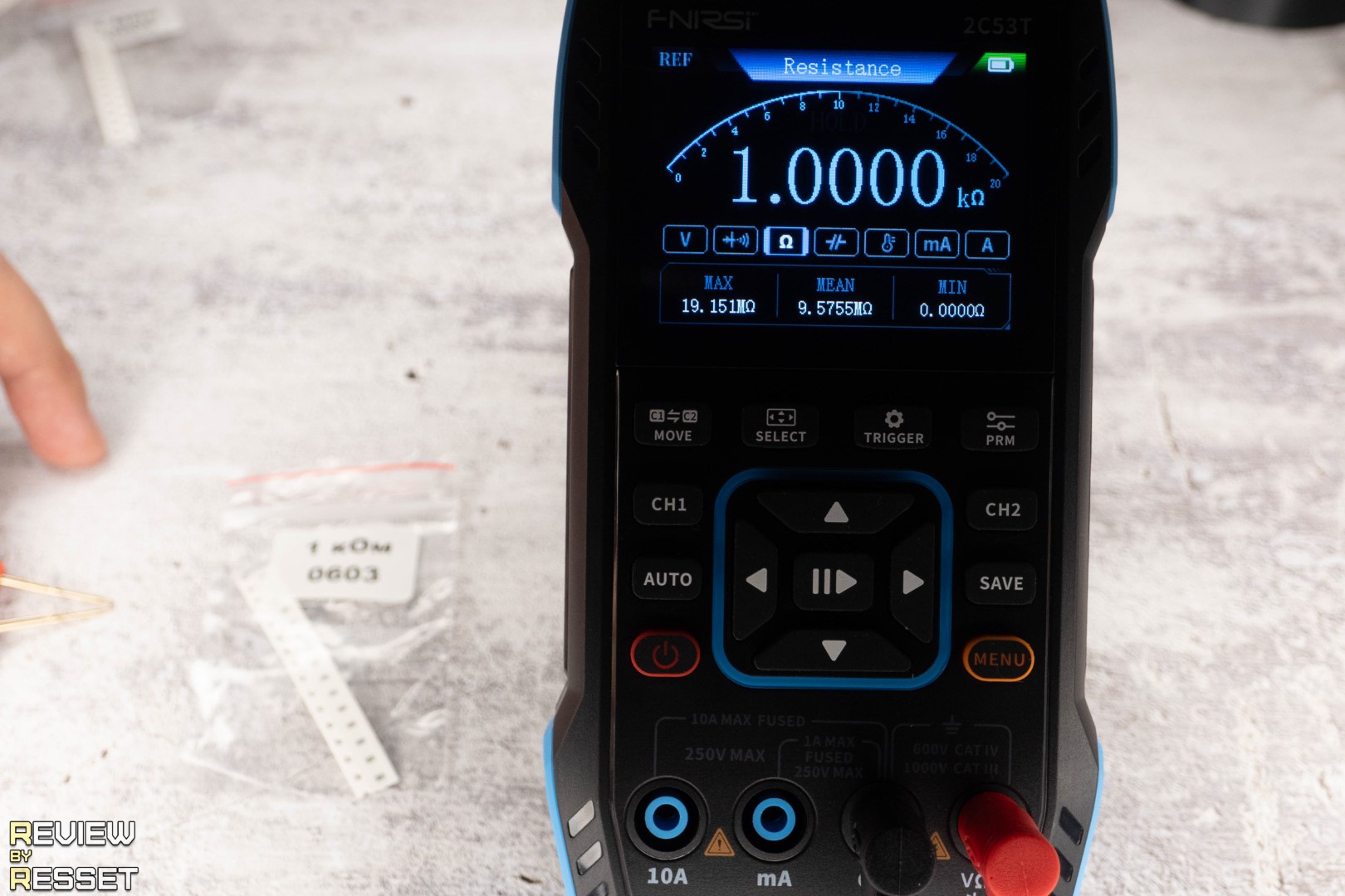 При замыкании щупов показывает сопротивление 0.15 Ом. Можно обнулить значение кнопкой «prm», но я подумал, что это может дать сдвиг на большой дистанции и не стал ничего трогать. Резисторы использовал типоразмера 0603, было сложно их «ловить», но из всех образцов, что у меня были, только у них допуск 1%. Разброс на дистанции получился минимальный, к 1 МОм не хватило 0.0005 до единицы, но это мелочи.