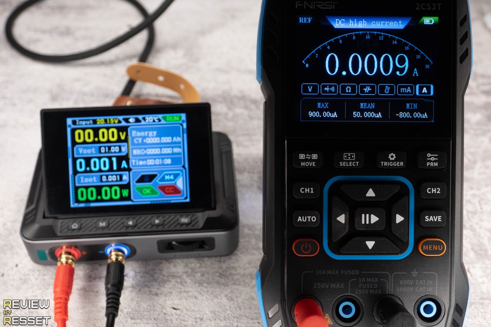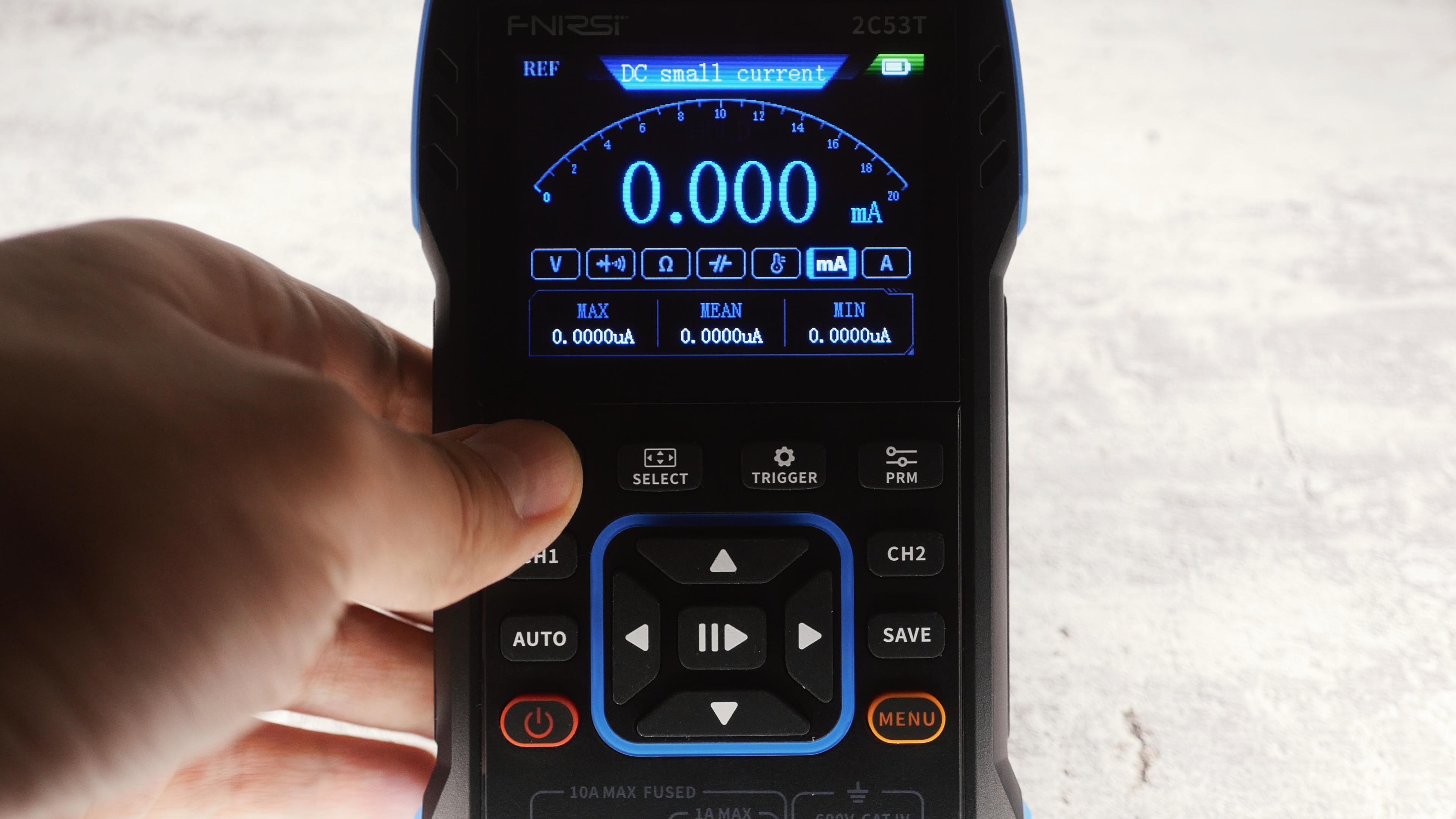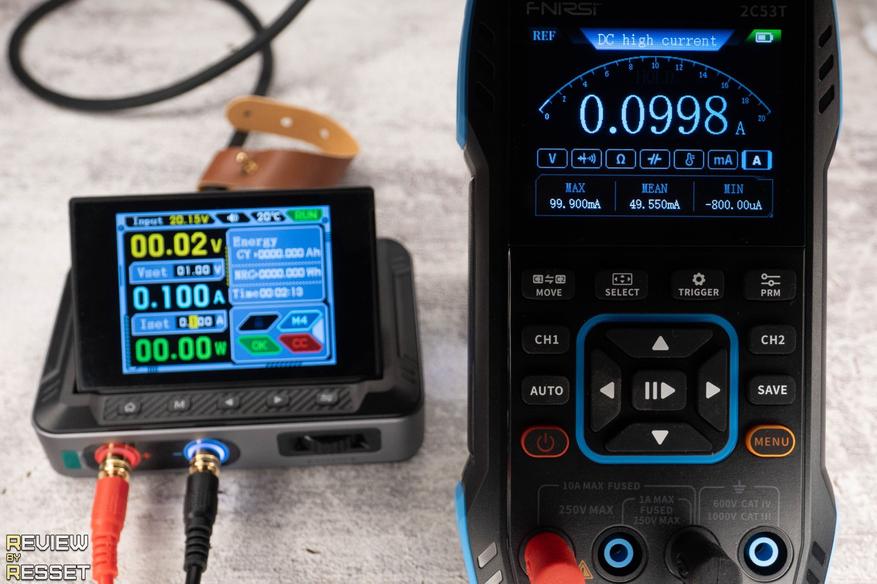 При выборе предела в 10А, Fnirsi 2C53T спокойно увидел минимум моего блока питания в 1мА. До предела в 4А все показания оказались очень точны, хотя иногда до выравнивания к круглому значению не хватало тысячных долей, что немного расстроило моего внутреннего перфекциониста. Но тут конечно и источник мог подвести, всё же это не лабораторный блок за многоденег. В предел мкА не полез, потому что нет источников тока, которые могли бы точно выдать такие маленькие значения, мне и шага 1мА с головой хватит.