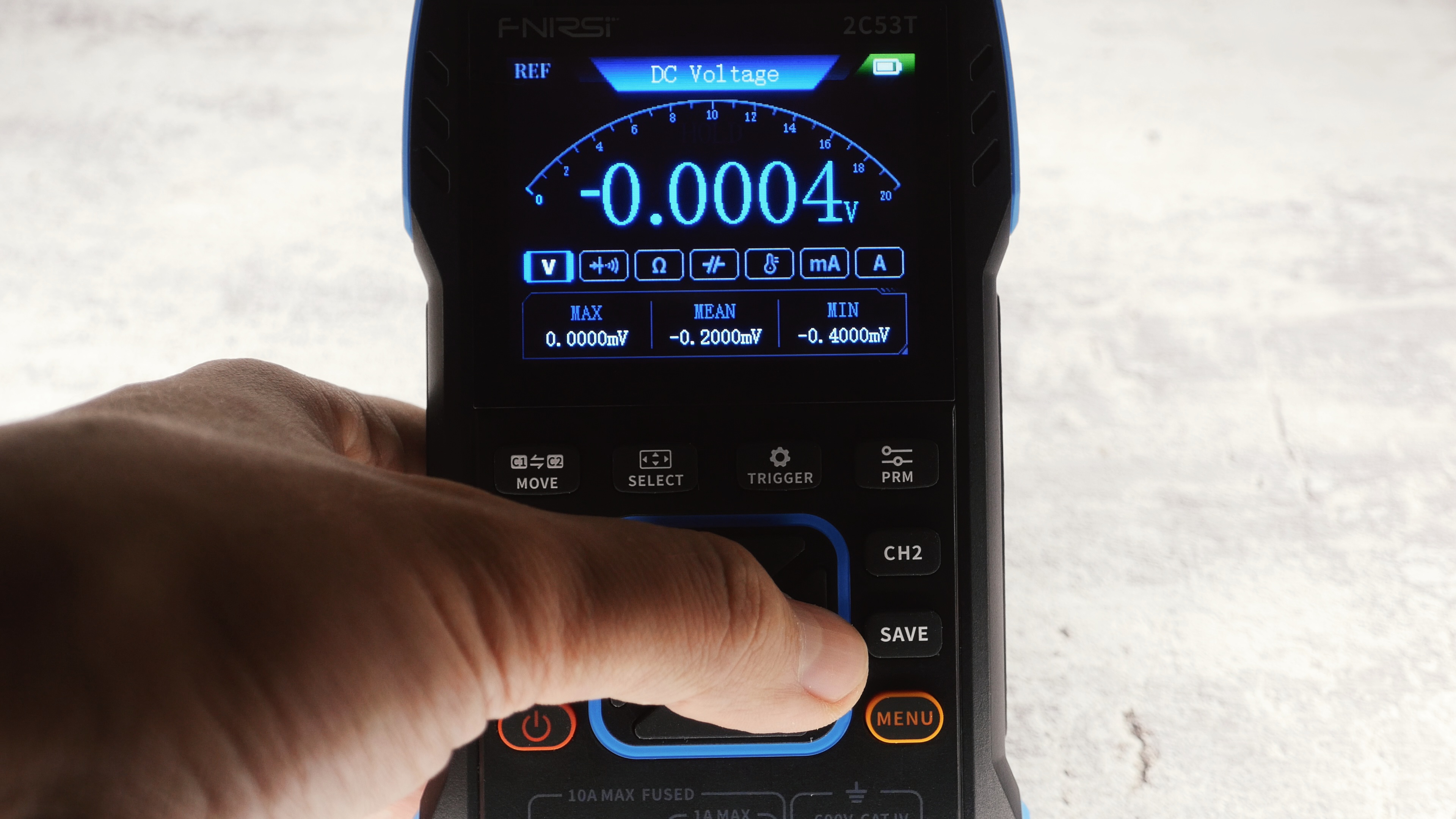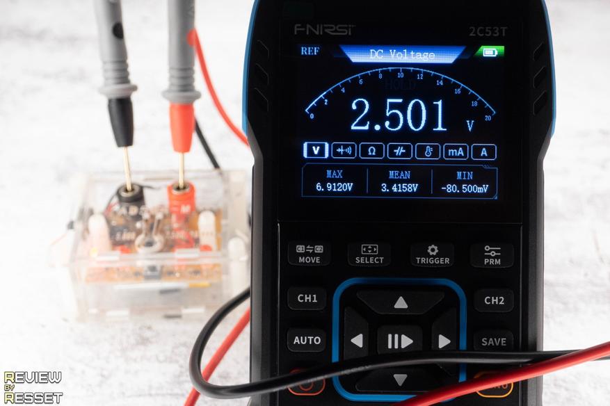 Так, при измерении напряжения, кнопкой «MOVE» можно переключиться между постоянным и переменным, а «PRM» переводит пределы измерения на милливольты если показаний до десятитысячной Вольта недостаточно.