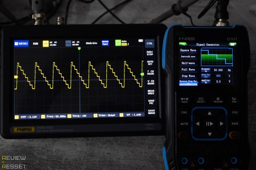 Можно строить до 12 форм сигнала с частотой до 50кГц и амплитудой 0.1-3В, так же местами скважность двигать можно. Тут вопросов тоже особо нет. При чем он может работать и в режиме осциллографа, а для быстрого доступа к его настройкам, достаточно подержать кнопку «TRIGGER».