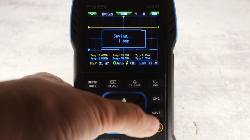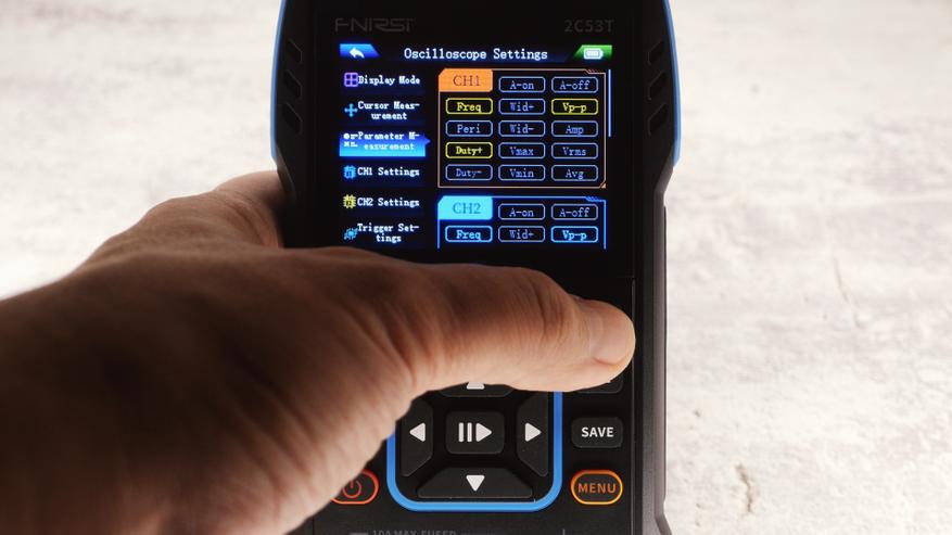 В режиме осцилолграфа интерфейс более-менее привычный, верхними кнопками можно переключаться между параметрами, стрелками менять. Кнопки «CH1» и «CH2» позволяют быстро откорректировать настройки каждого канала. «AUTO» автоматически подбирает настройки вертикальной и горизонтальной развертки, а кнопка «SAVE» сохраняет снимок экрана в память устройства.