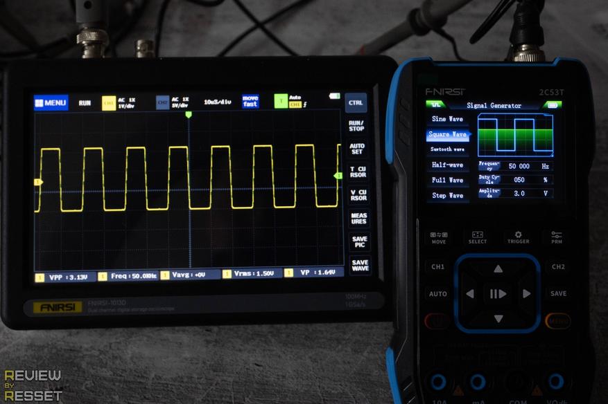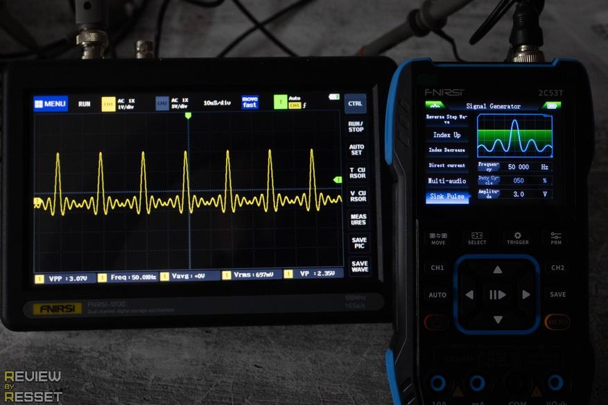 + По сравнению с 2C23T, интерфейс настроек был переработан в лучшую сторону, пользоваться осциллографом стало гораздо комфортнее. Заявленную частоту 50МГц нормально высчитывают оба канала, но не одновременно, т.к. нет отдельной синхронизации для каждого.