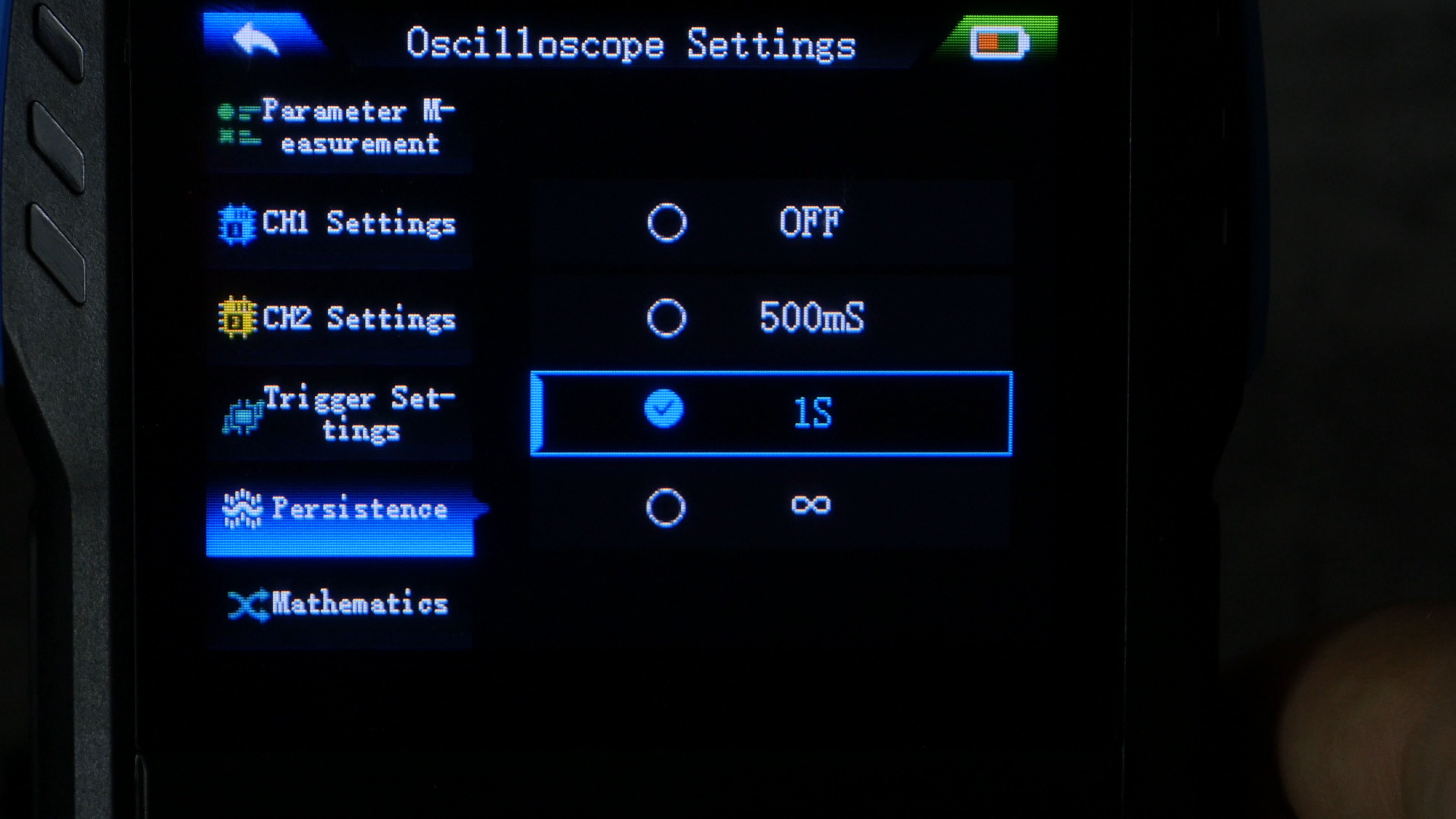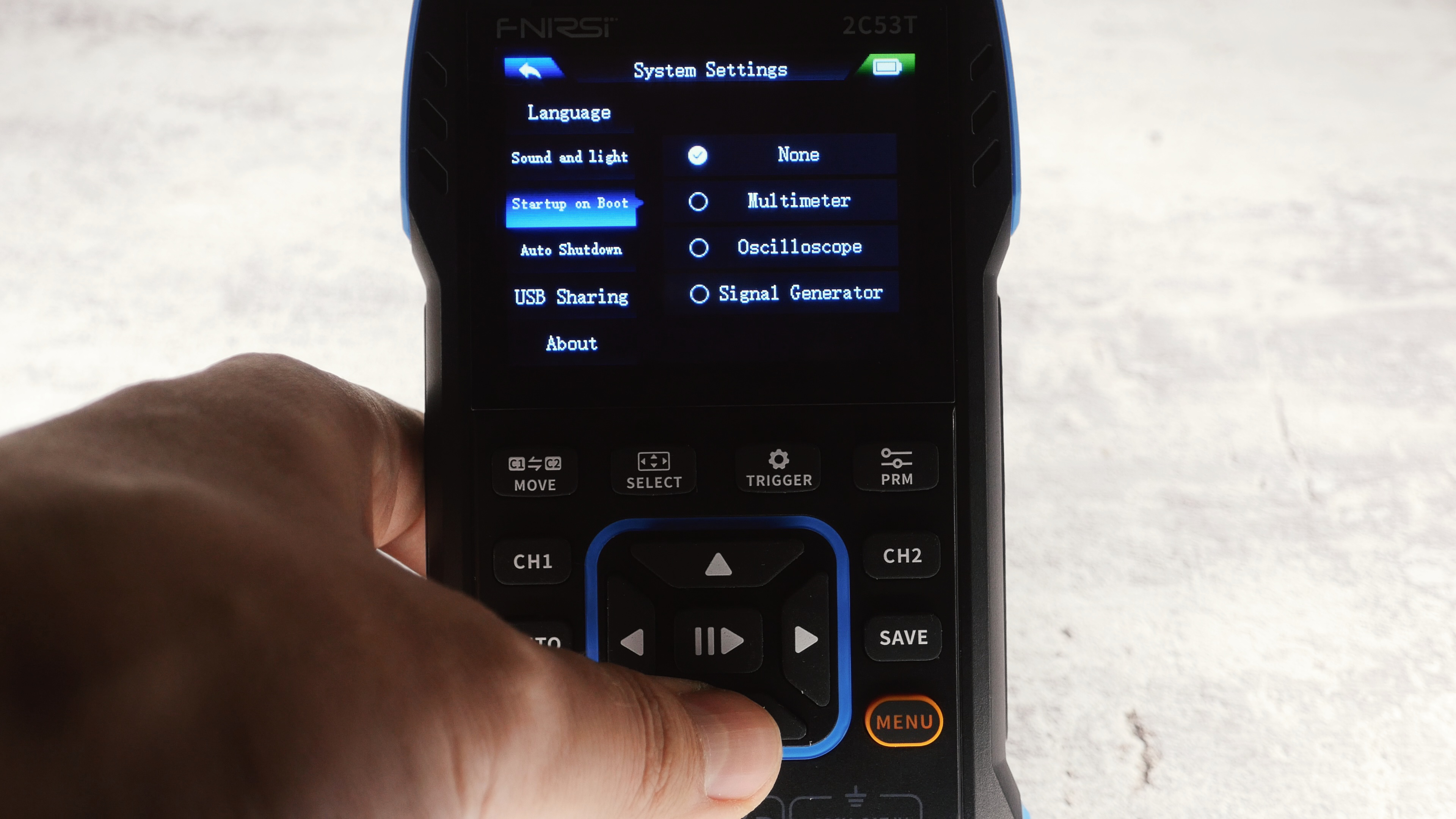 На самом деле экран более яркий, но я убавил экспозицию, чтобы получить более контрастные снимки. При включении нас встречает основное меню, состоящее из четырех пунктов: мультиметр, осциллограф, генератор сигналов и системные настройки.