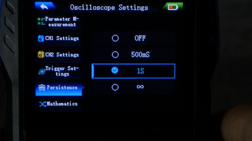 Есть и послесвечение, выдержку можно поставить на 500мс, 1 секунду и бесконечность. Отрисовка нормальная, при включении FFT так же видны два основных всплеска.