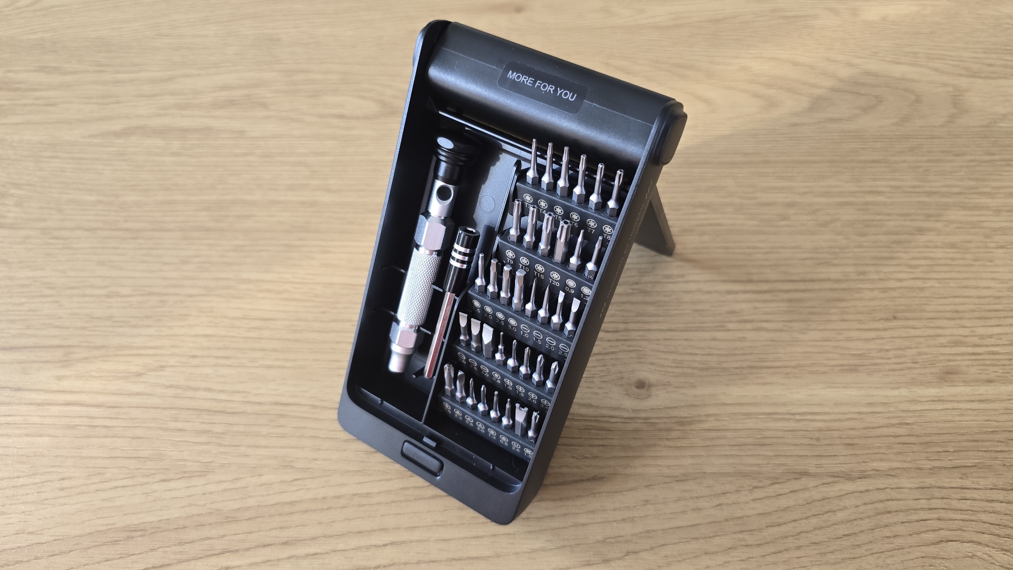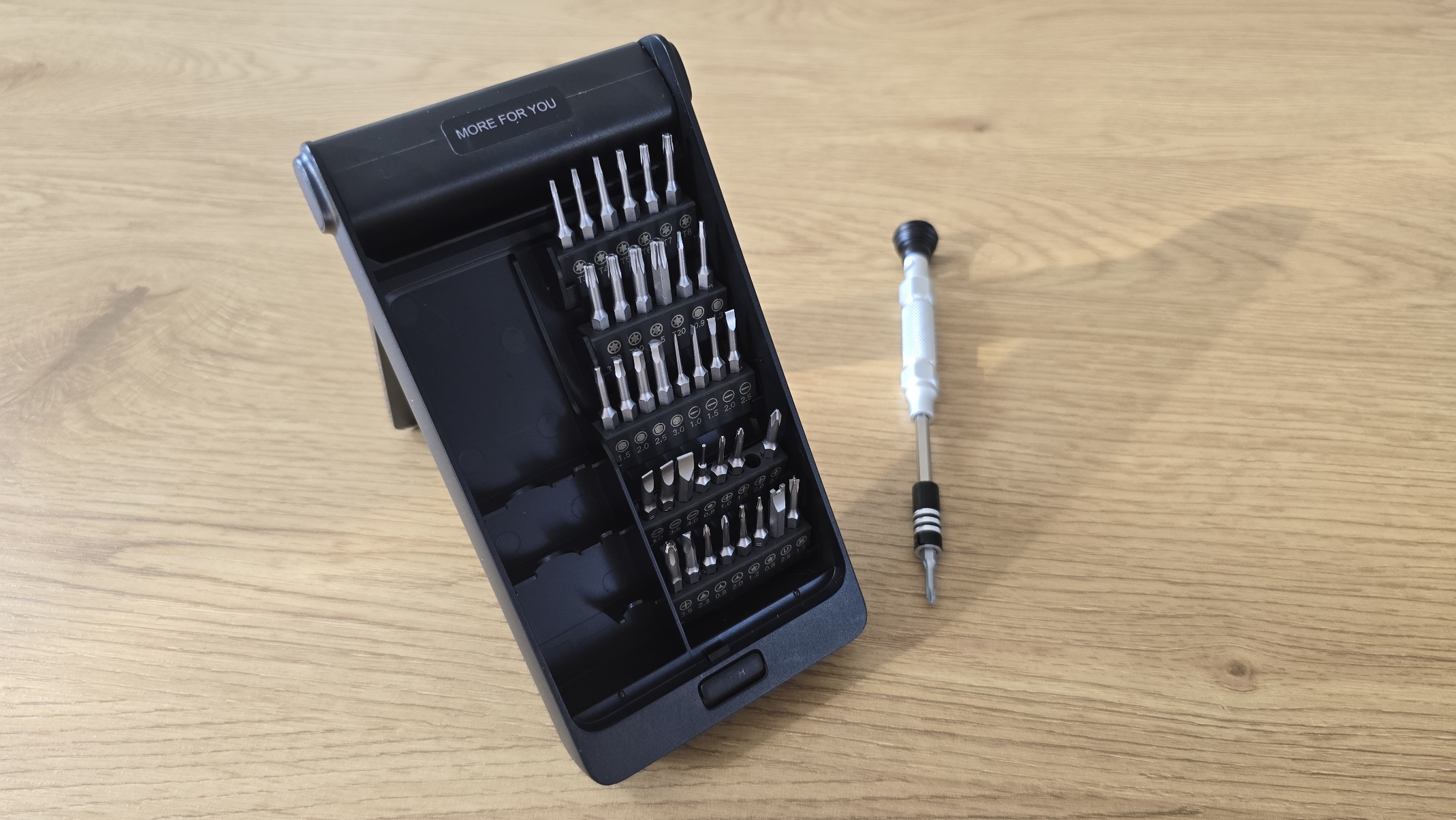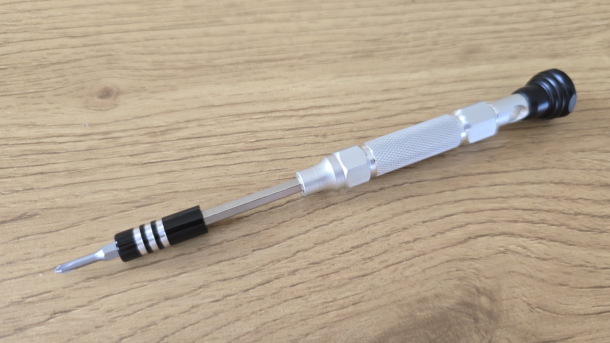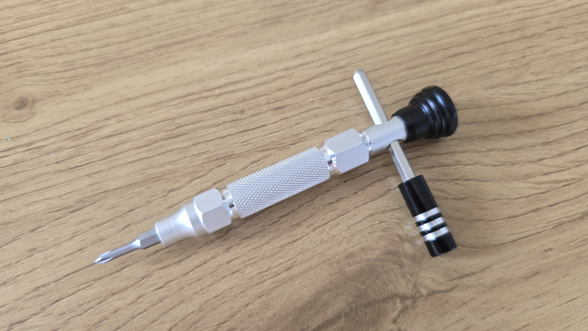 Еще раз хочу вернуться к металлической ручке отвертки. Она выполнена из алюминиевого сплава и имеет накатку для улучшенного сцепления с пальцами. Этот дизайн помогает предотвратить скольжение во время работы, что важно при выполнении точных задач. Ручка оснащена вращающимся на 360 градусов торцом, который позволяет легко изменять направление вращения без необходимости менять хватку.