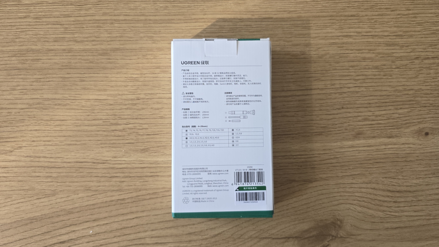 Набор прецизионных отверток Ugreen UT110 поставляется в небольшой, информативной картонной коробке, которая содержит на себе изображение устройства, информацию о производителе, наименовании модели и комплекте поставки.