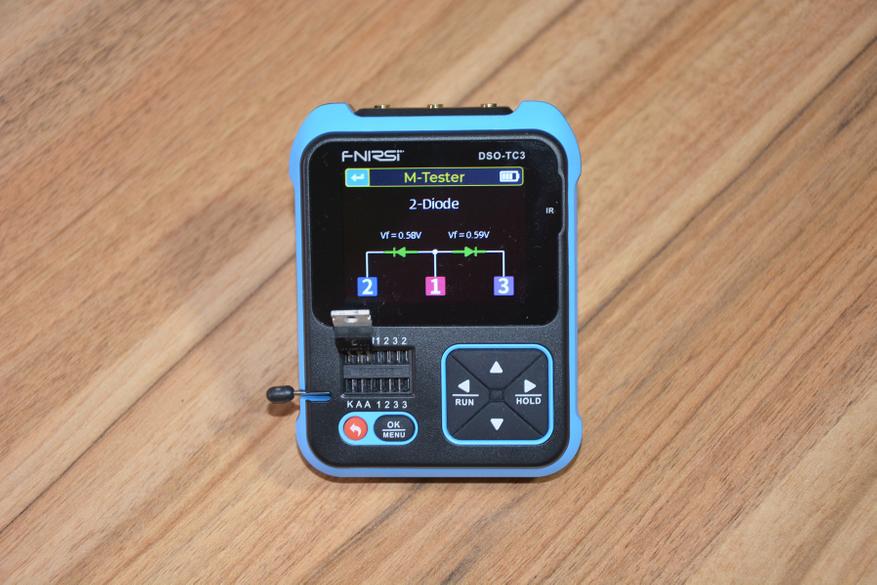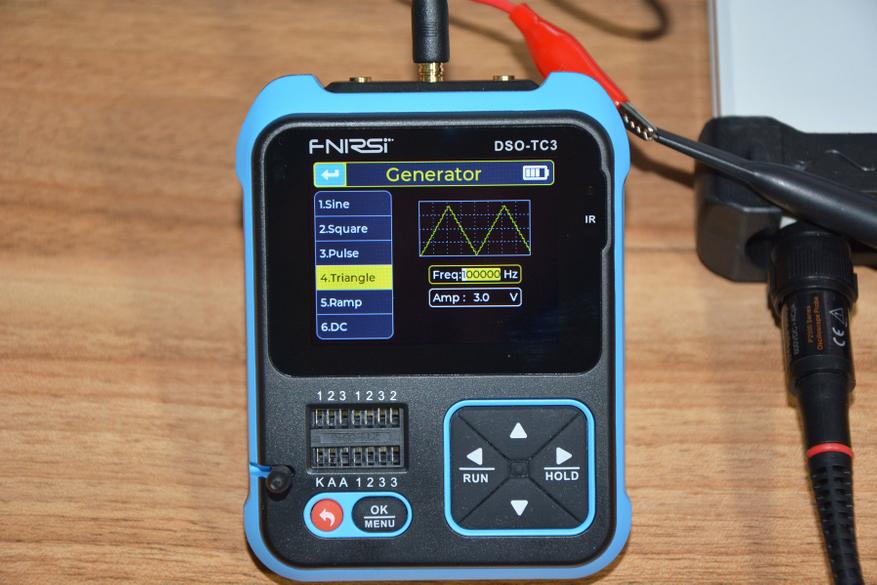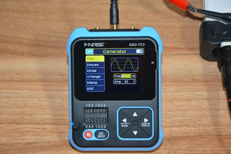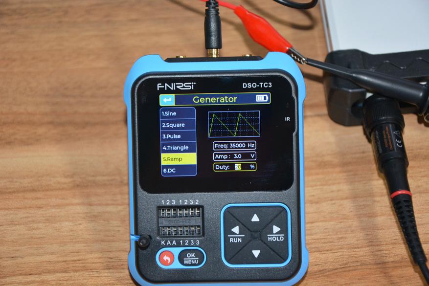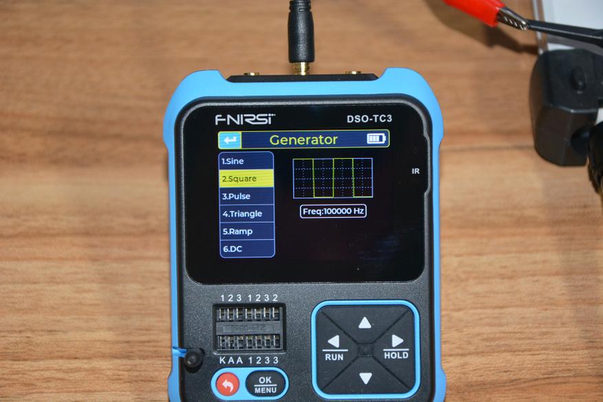 Из-за отсутствия щупа с генератором сигналов соединился с помощью того же кабеля с MCX штекером и крокодилами. Возможно это и привносит свои искажения, но на экране тестера артефактов не наблюдал. Как осциллограф прибор себя показывает очень даже не плохо. Есть весь набор инструментов присущих осциллографам начального уровня. Все как у взрослых моделей — открытый, закрытый вход, выбор триггера, чувствительность, длительность развертки. Все иконки на экране по периметру выбираются последовательными нажатиями кнопок вправо (Run), влево (Hold). Длительным удержанием кнопки Run можно зафиксировать осциллограмму, повторным нажатием вернуться к текущим показаниям. Длительным удержанием кнопки Hold можно убрать числовые параметры сигнала и вернуть их на экран.