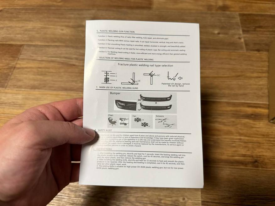 Он пришел в простой картонной упаковке без опознавательных знаков и этикеток. Внутри лежит сам пистолет, четыре пакетика со скобами для пайки и инструкция на английском языке, снабженная наглядными картинками, показывающими, для чего какие скобы нужны и как можно применять инструмент. Даже если вы не владеете английским, или никогда раньше не паяли пластик, все равно быстро разберетесь.