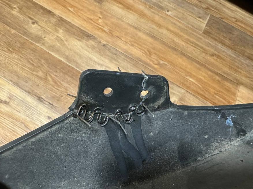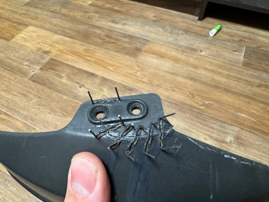 Давайте опробуем его в деле. У меня как раз есть крыло от электросамоката, которые треснуло во время падения, а часть, за которую оно прикручивается, отвалилась, и я подумывал его выбросить. Клей или стяжки тут точно не помогут. Но вот с помощью пистолета и нескольких видов скоб мне удалось сотворить чудо, как видите сами, крыло восстановлено!
