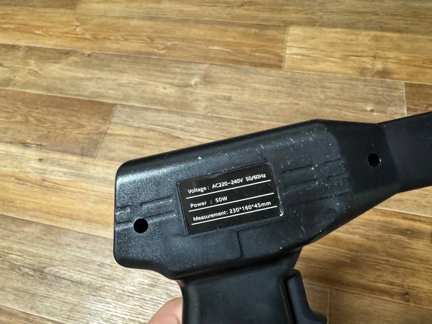 Пользоваться им максимально просто: вставляете нужную скобу, включаете в сеть и зажимаете кнопку. Буквально через 5-7 секунд скобу можно вгонять в пластик. Основные характеристики приведены на корпусе пистолета. Мощности нагрева достаточно для пайки не очень толстого, так и достаточно плотного пластика. Так можно заделывать трещины в ведрах, буквально напаивая пластик сверху; скрепить поврежденный автомобильный бампер или починить крыло от велосипеда или электросамоката.