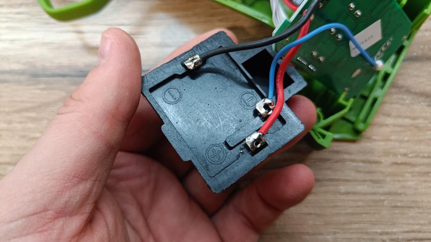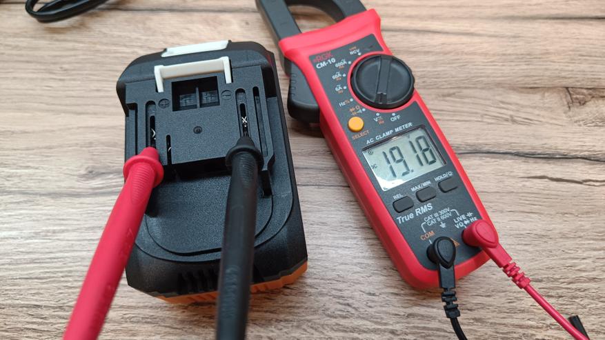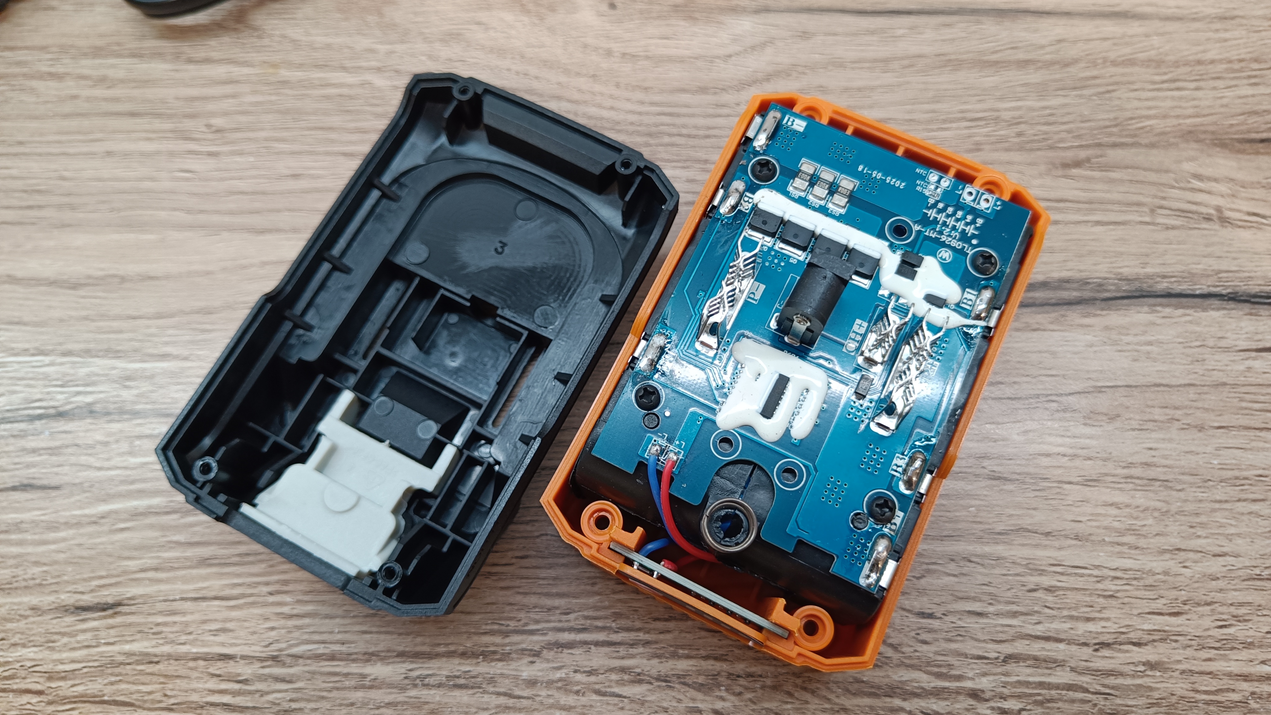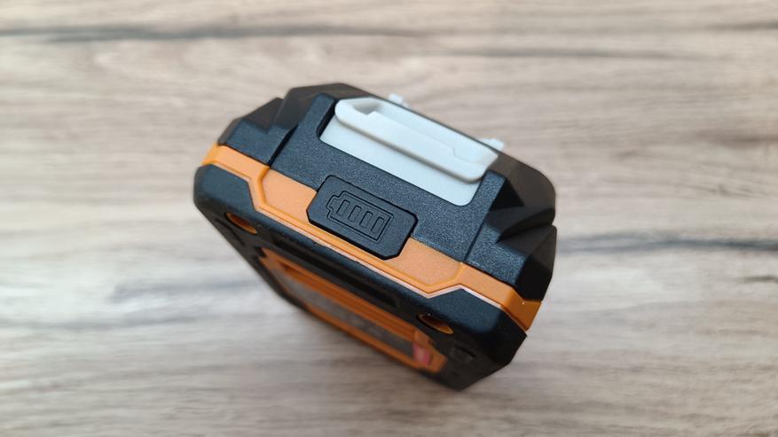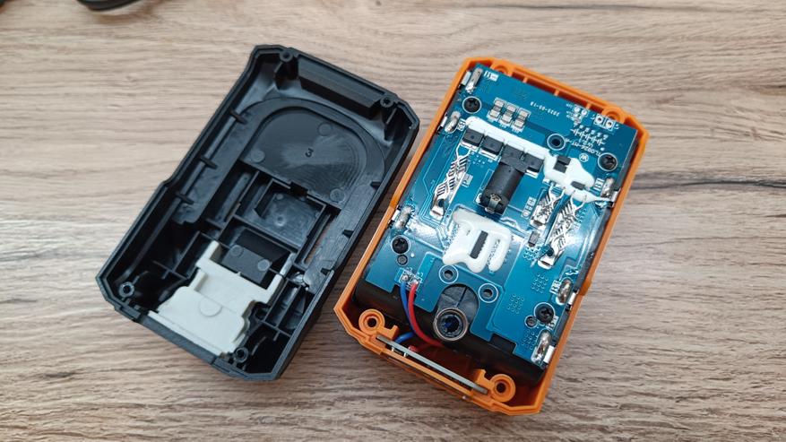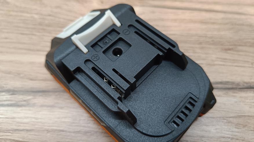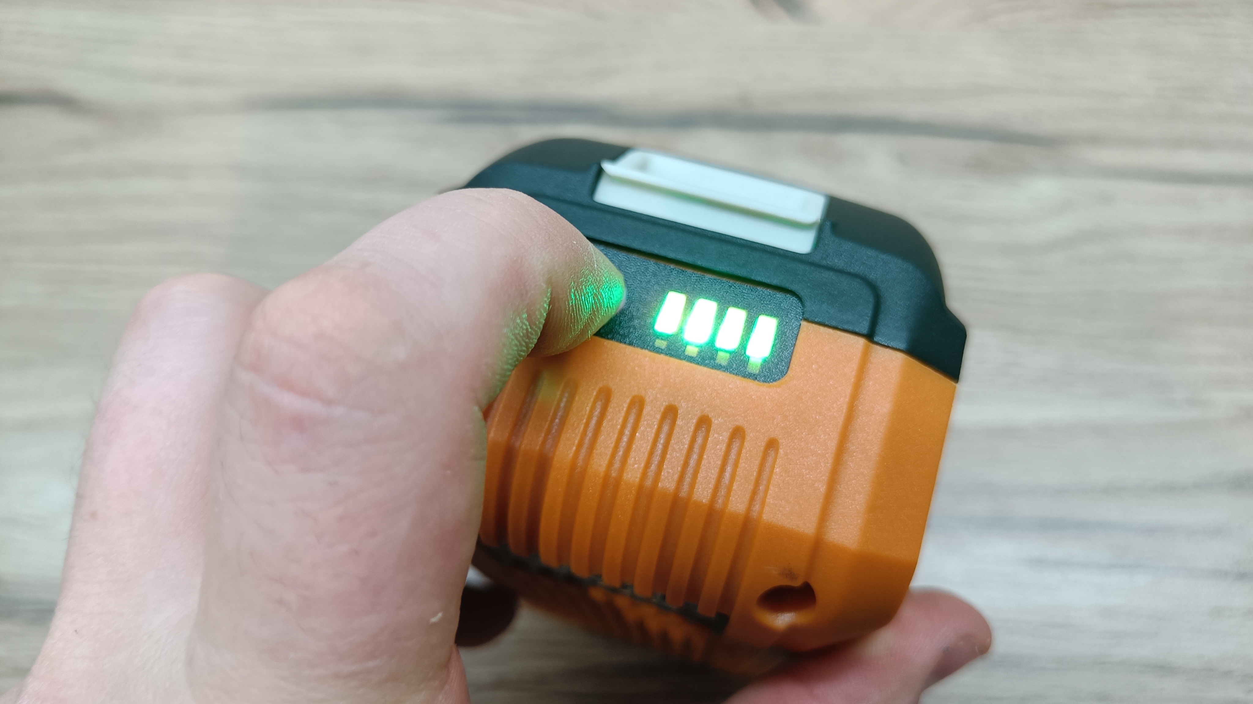 Аккумулятор имеет аналогичное строение, но контроль уровня заряда расположен в лицевой части корпуса. Индикация 4 сегментным элементом.
