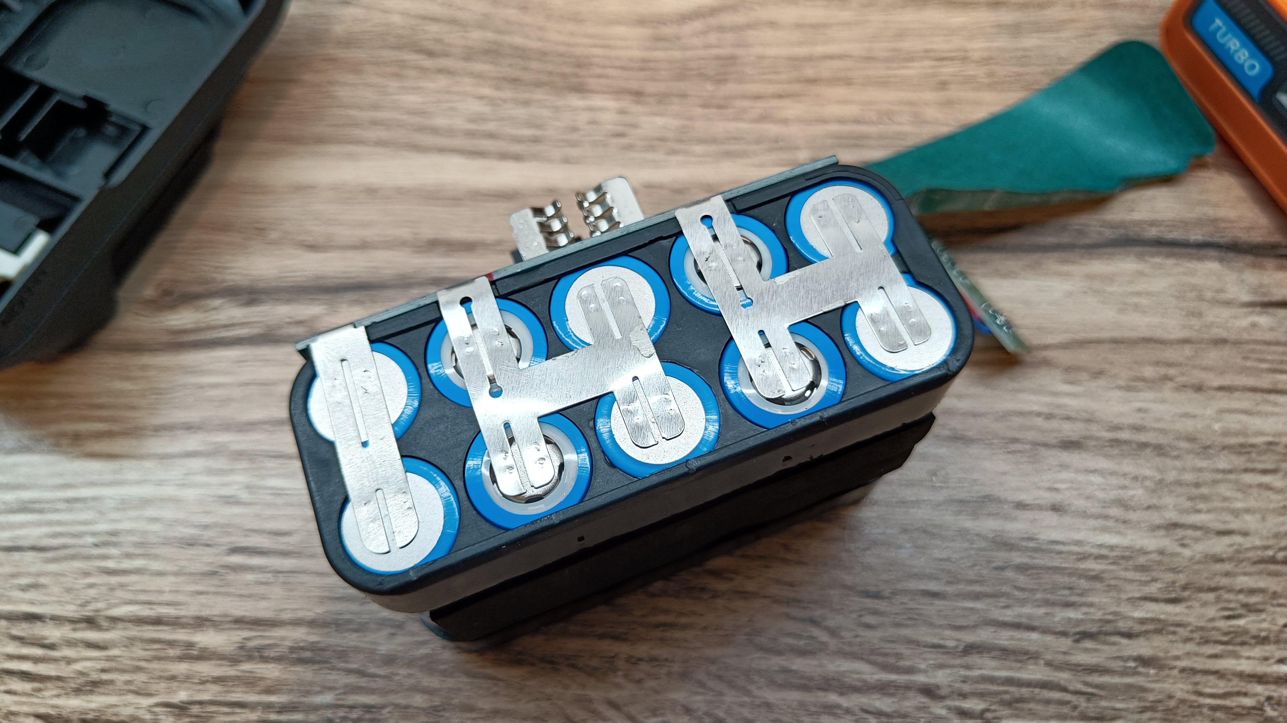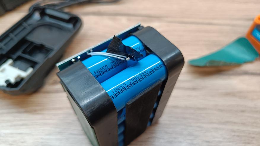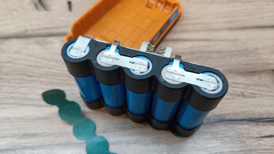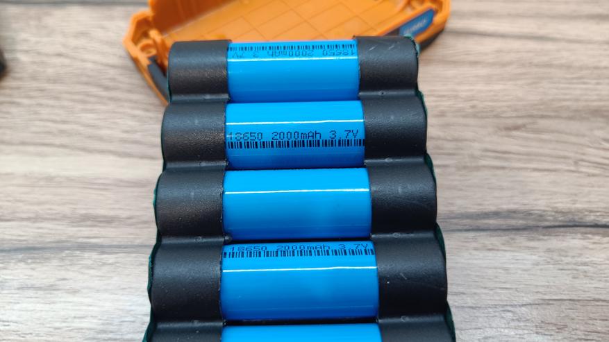 Используются 2000 mAh аккумуляторы размера 18650 в синей термоусадке. Сварка стальной лентой с изоляцией. При длительной эксплуатации не подведут, так как все параметры заявлены честно.