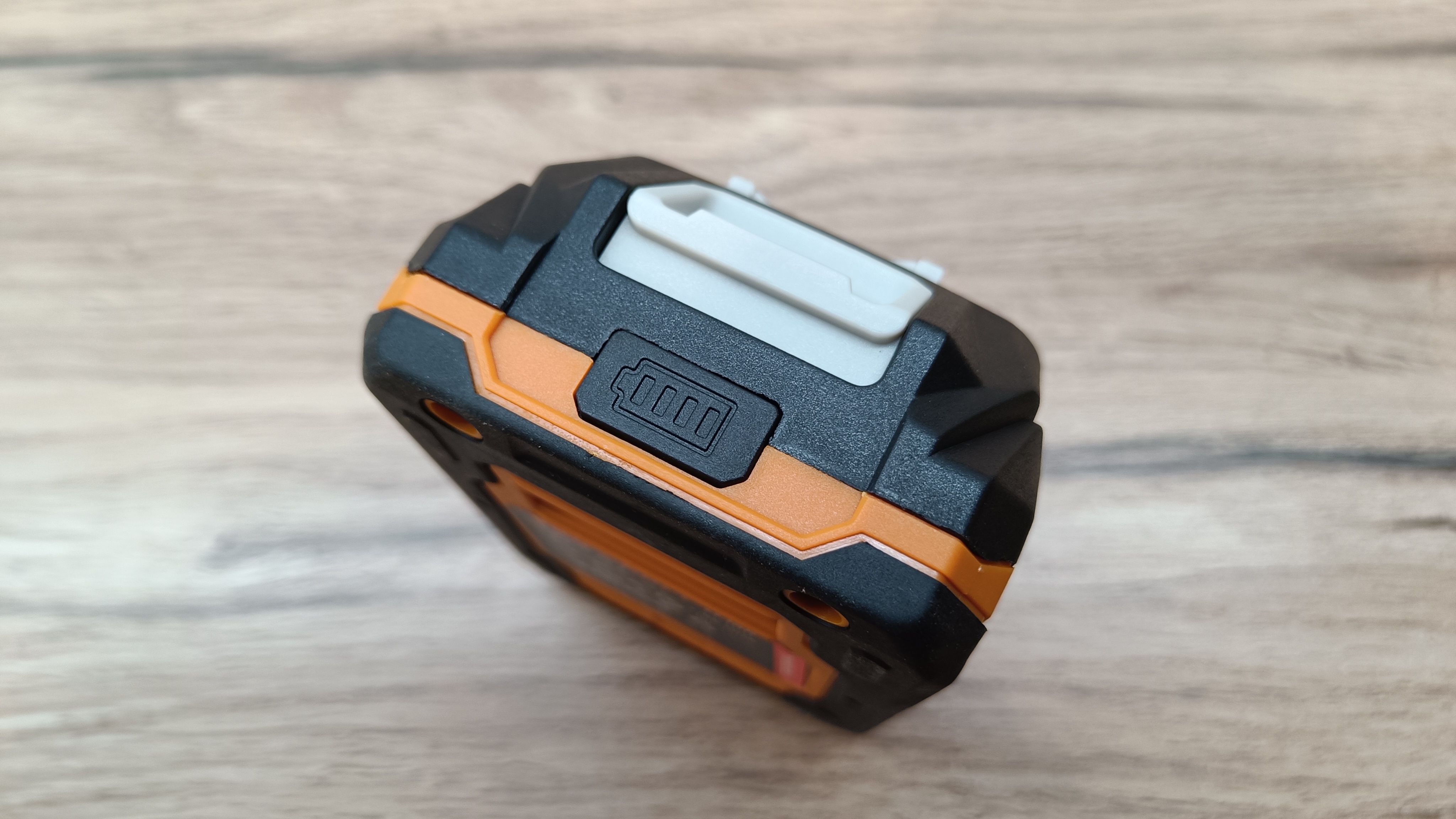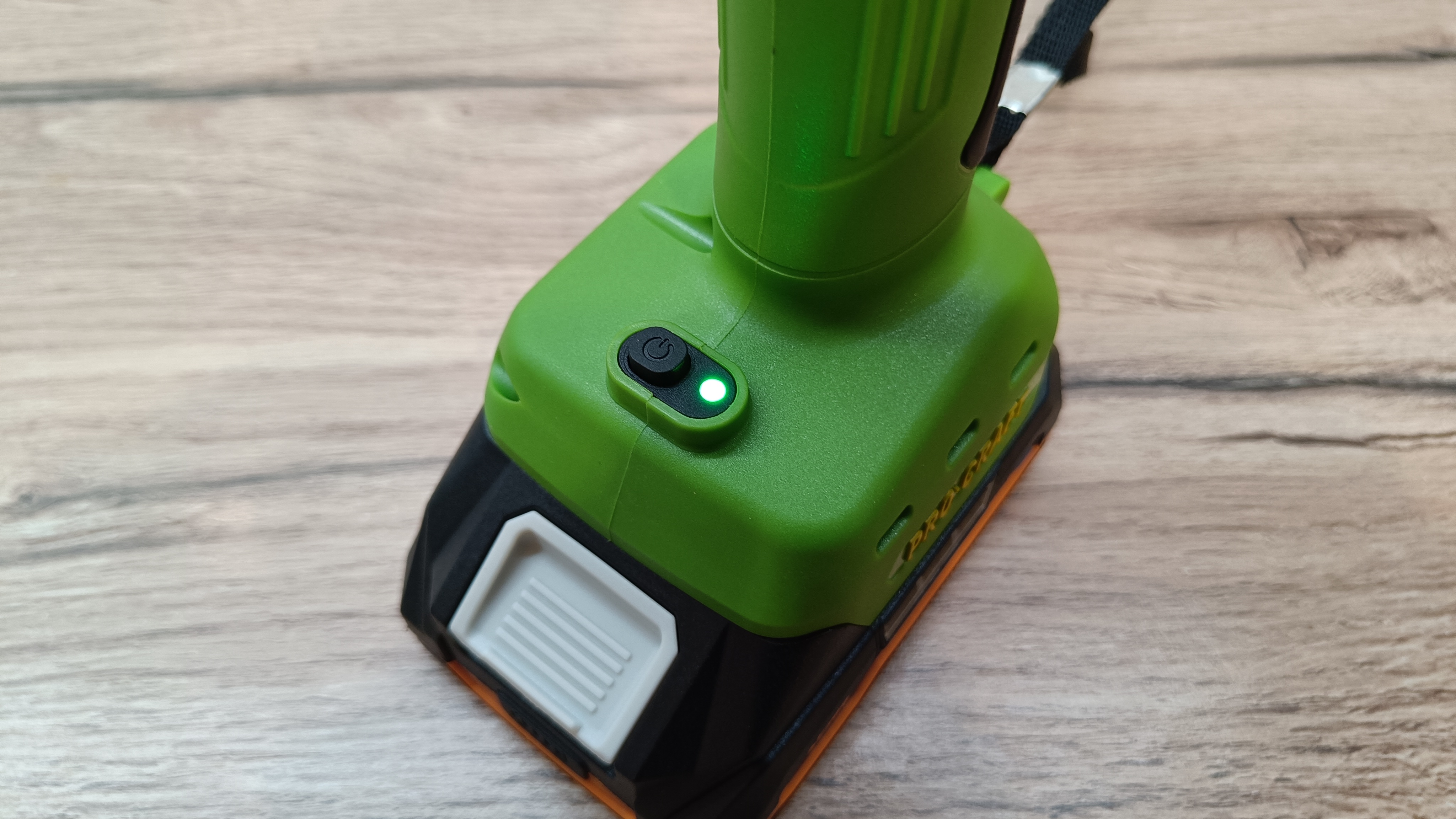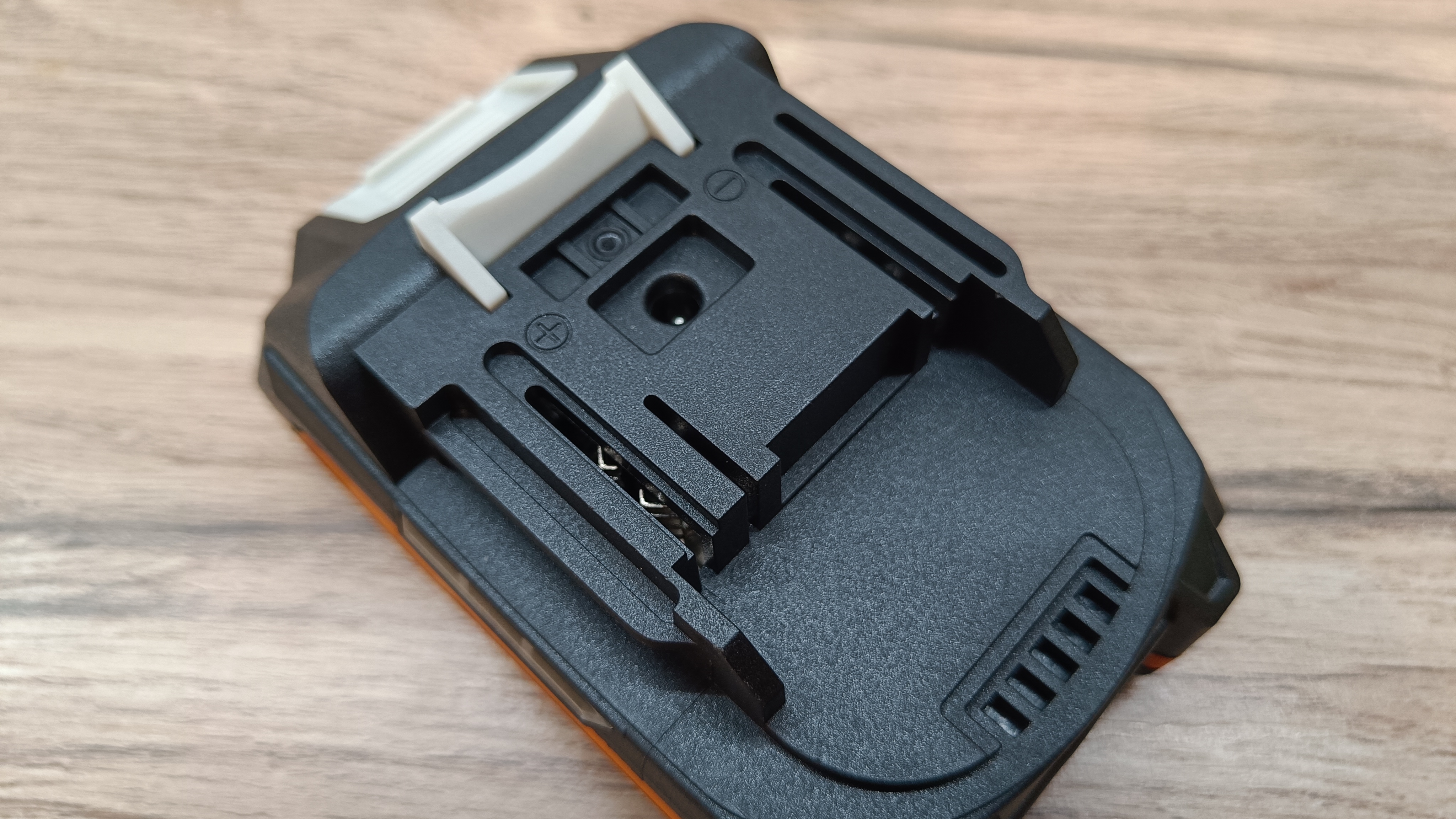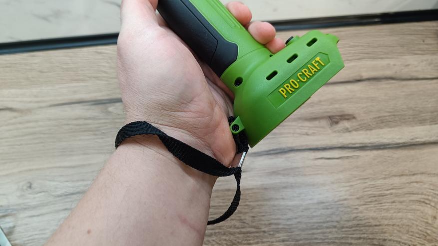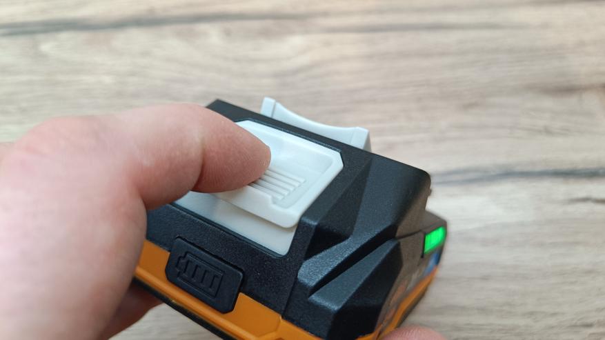 В комплекте с секатором присутствует один аккумулятор. Тип аккумулятора — слайдер. Понравилась удобная индикация остаточного заряда, которая размещается по обе стороны аккумулятора и довольно ярко подсвечивается. Нижняя часть аккумулятора имеет резиновую оболочку, препятствующая скольжению по гладким поверхностям и защищающая аккумулятор при падении инструмента. В верхней части — разъем для подключения к питанию. В целом, данный аккумулятор можно заряжать на фирменных зарядных станциях. Инструменты PROCRAFT совместимы с аккумуляторами Makita. Индикация 3-х сегментным элементом.