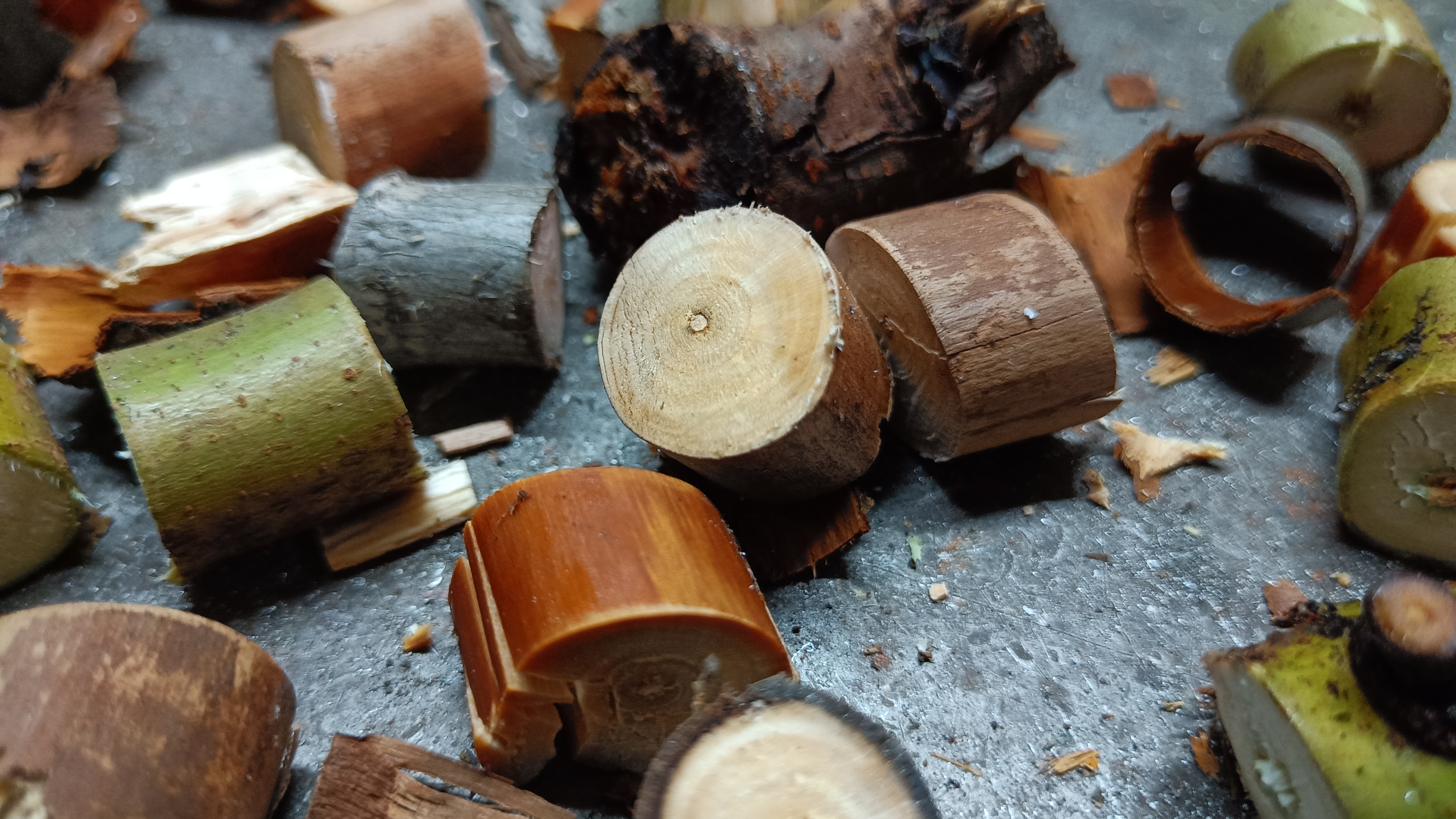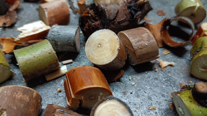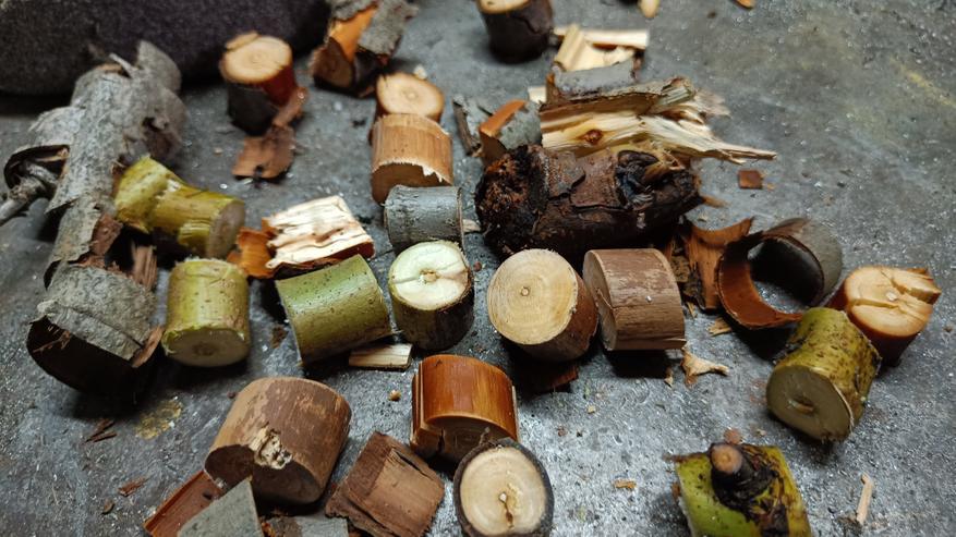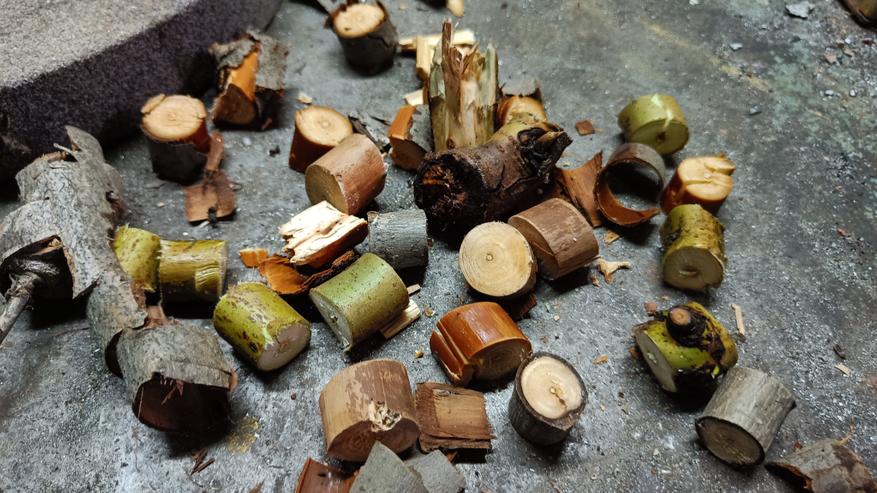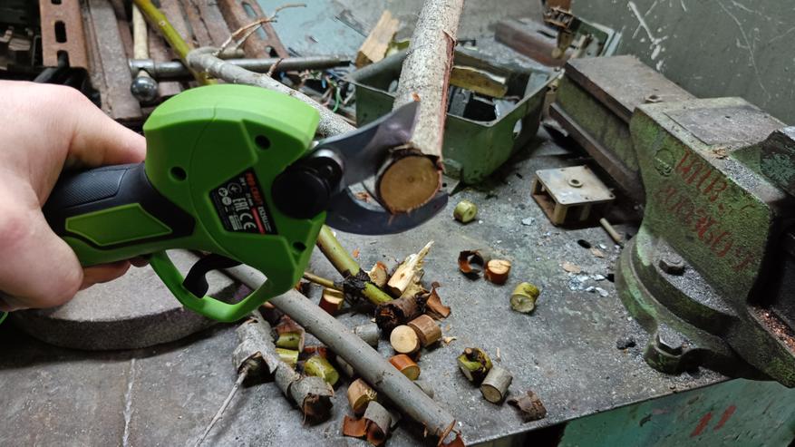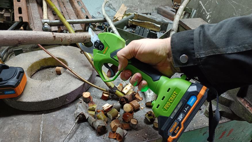 Используем аккумуляторный секатор PROCRAFT ES25Li на бесщеточном двигателе по прямому назначению. У нас еще достаточно холодно, поэтому обрезку с саду буду проводить чуть позднее. Но, хочу показать, как ведет себя секатор при работе с различными по толщине ветками. Не ожидал, что PROCRAFT ES25Li с легкостью расправляется с ветками, даже чуть толще, чем 25 мм в диаметре. При нажатии слышен только щелчок и инструмент без усилия перекусывает ветку. Толщина веток на верстаке примерно 20-25 мм, но есть и чуть больше.