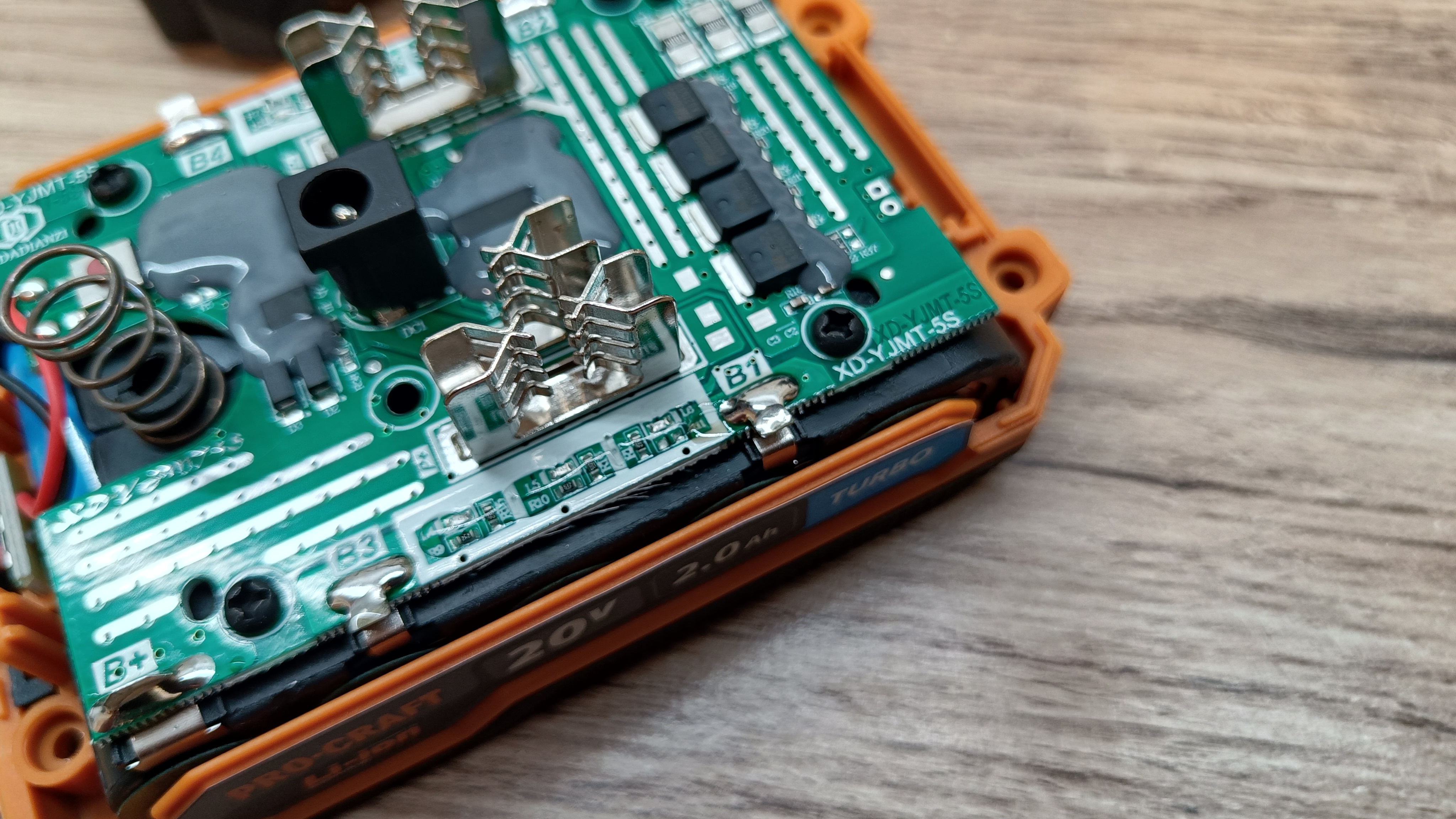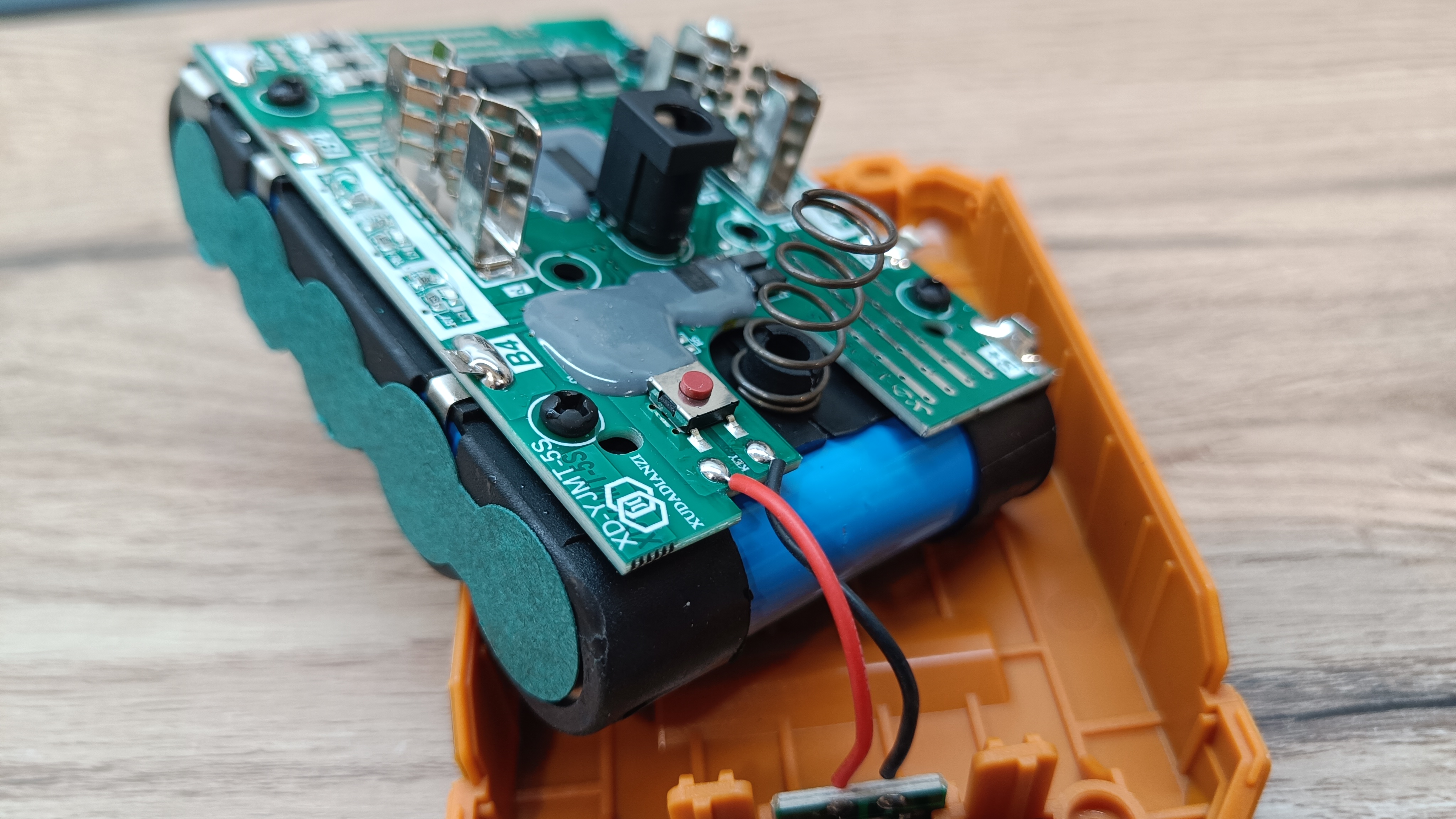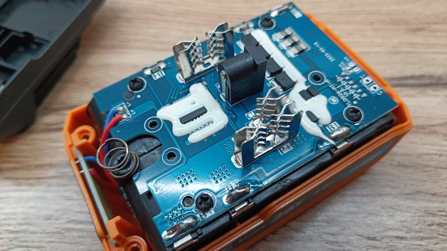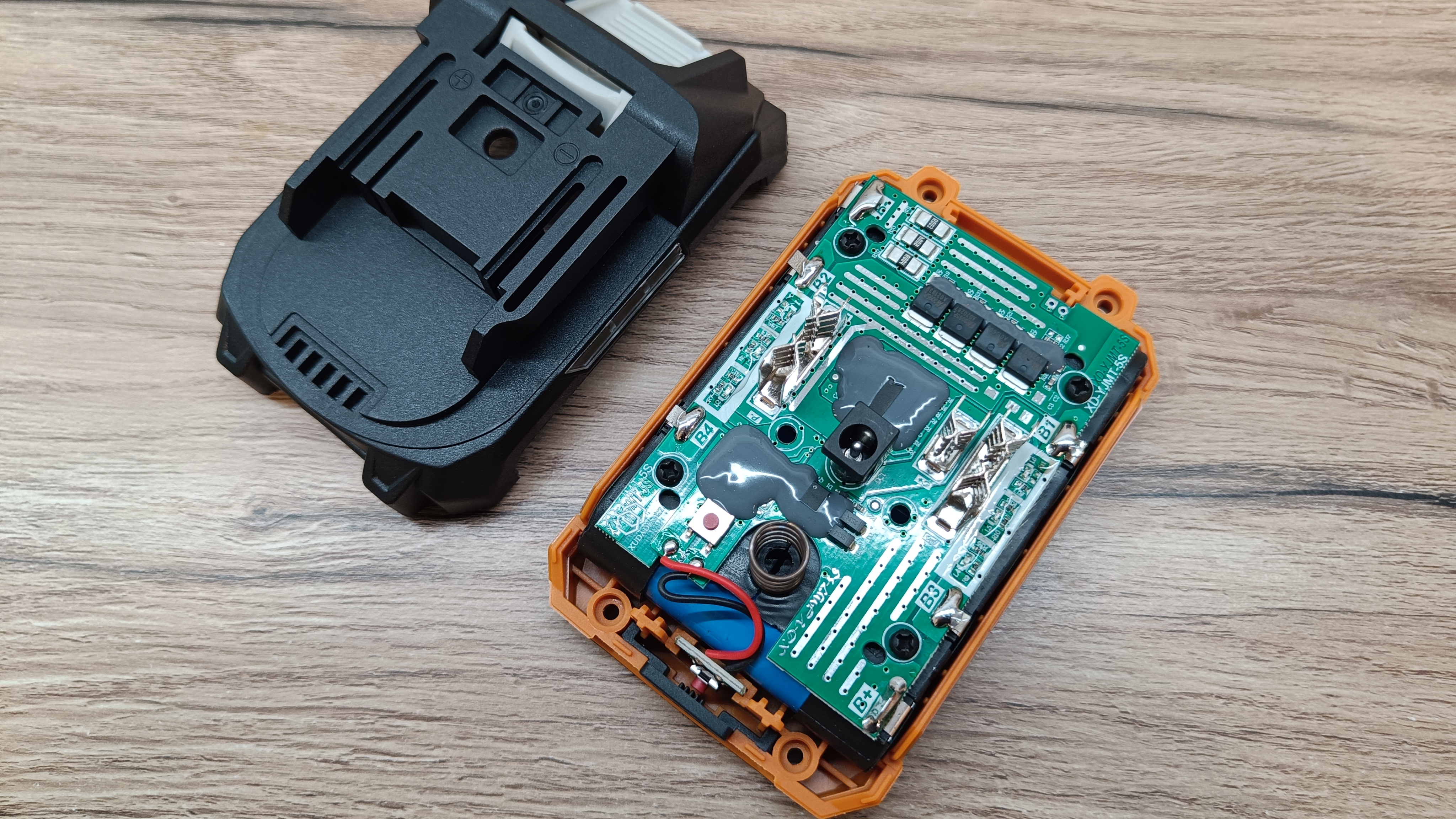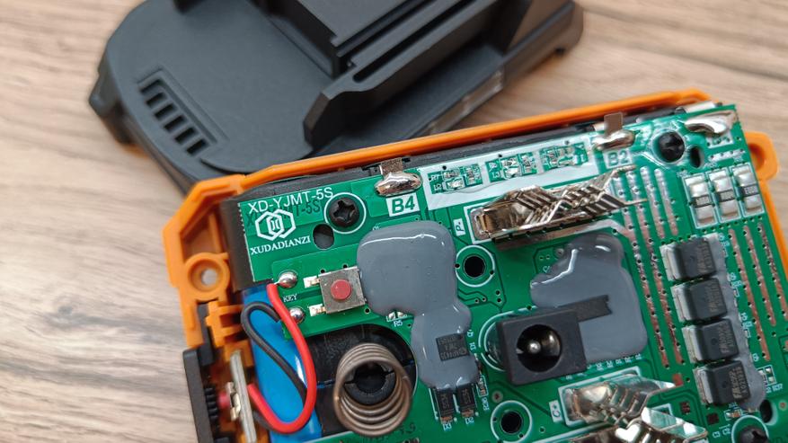 Внутри его также размещаются аккумуляторы в синей термоусадке. Но в отличие от версии с 2А есть термозащита и плата построена немного по другому. Стоят более мощные мосфеты в количестве 4 шт.